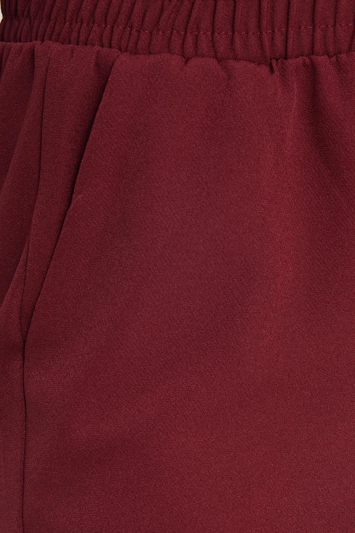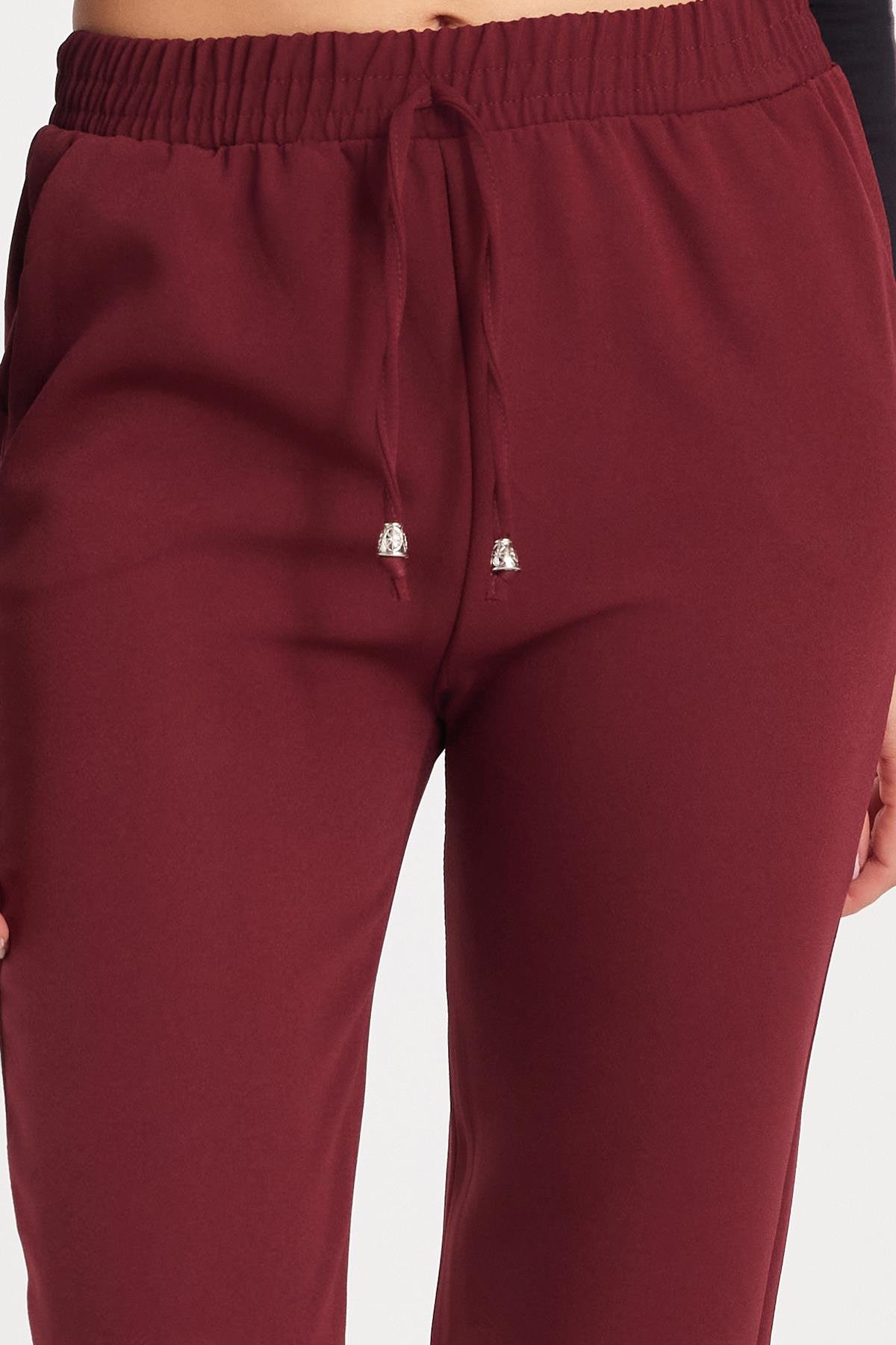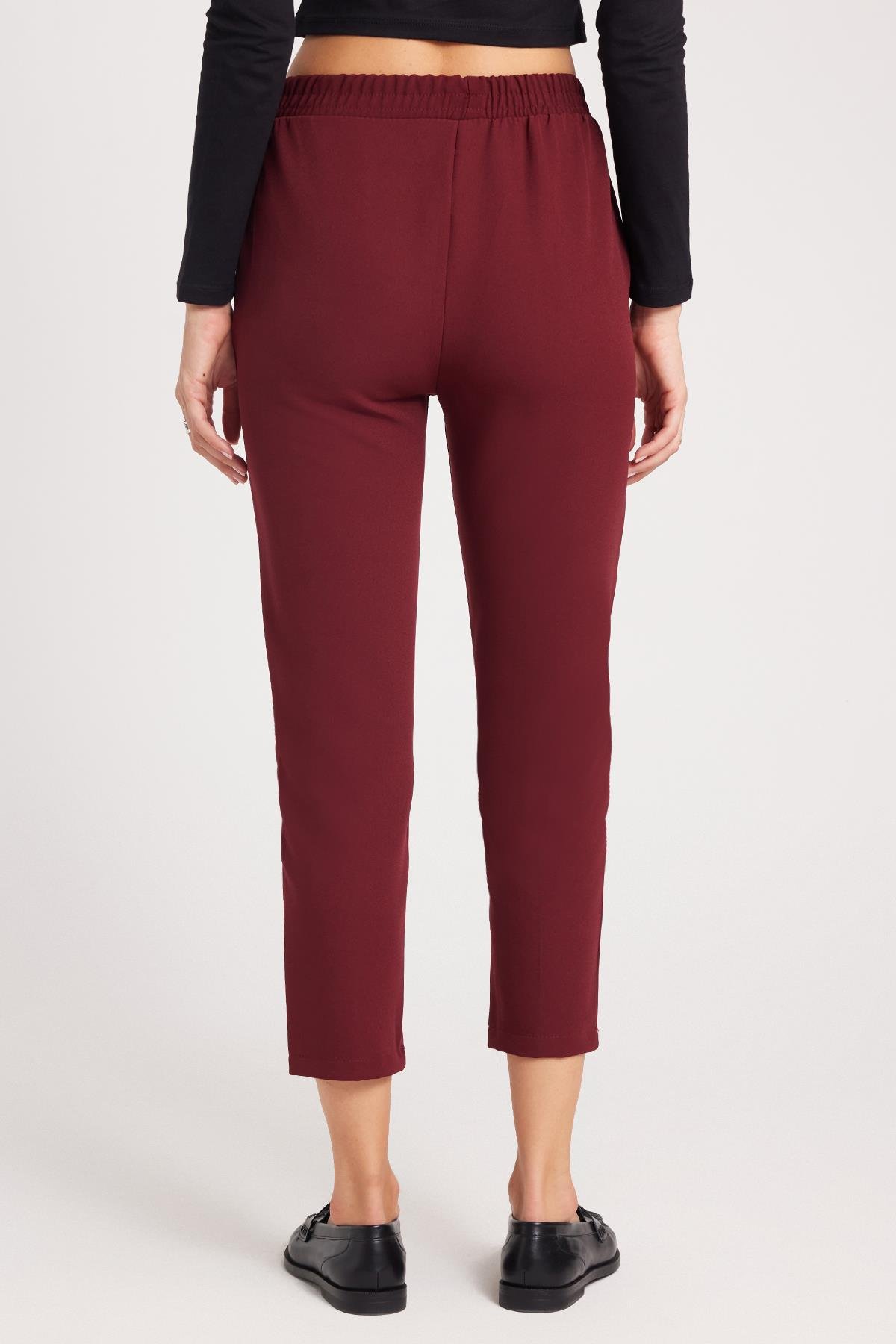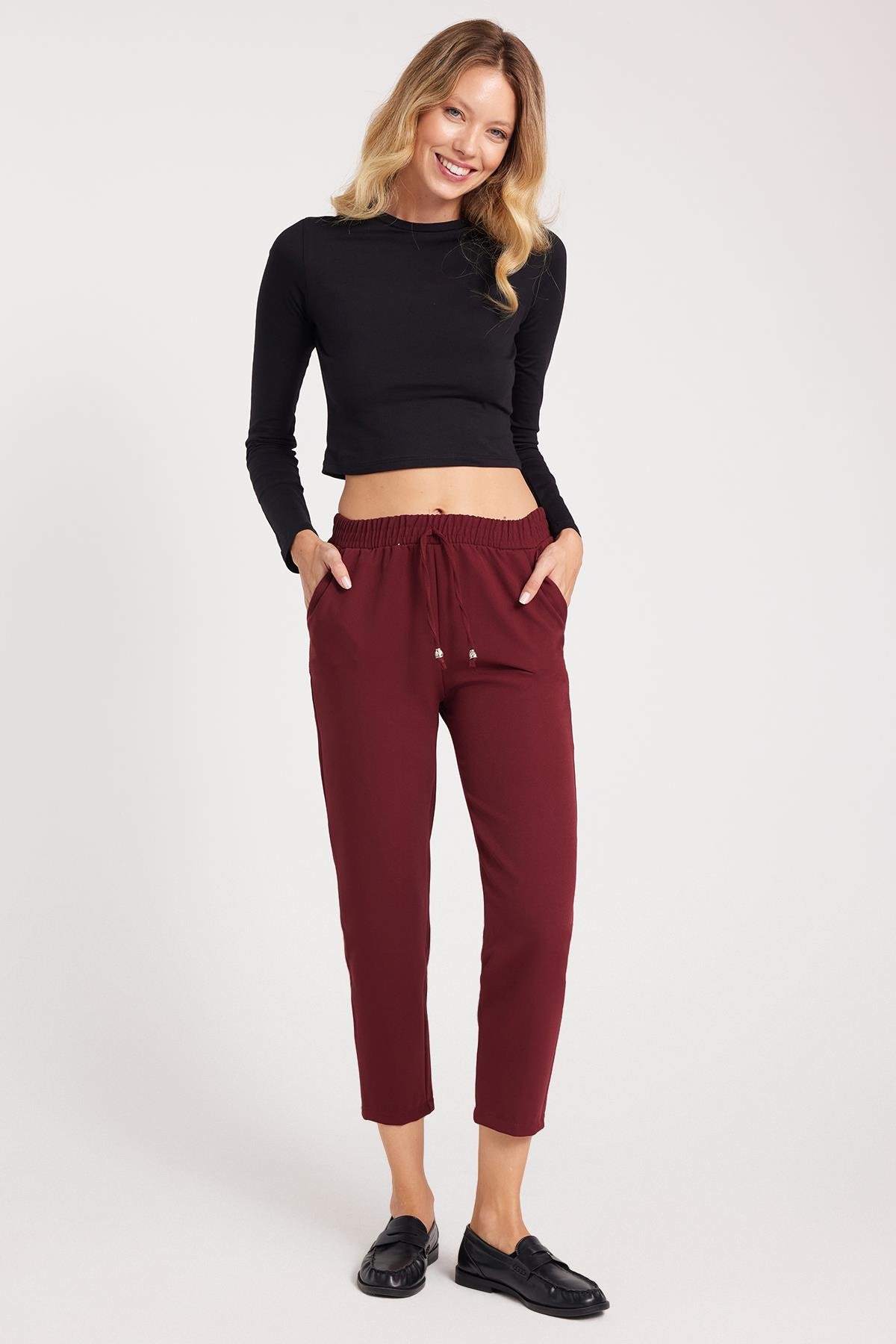 Kadın Relax Fit Rahat Kesim Yüksel Bel Dar Paça Beli Lastikli Bağcıklı Bordo Pantolon (PN250046-08)