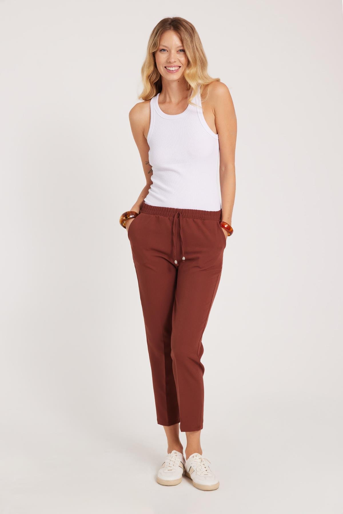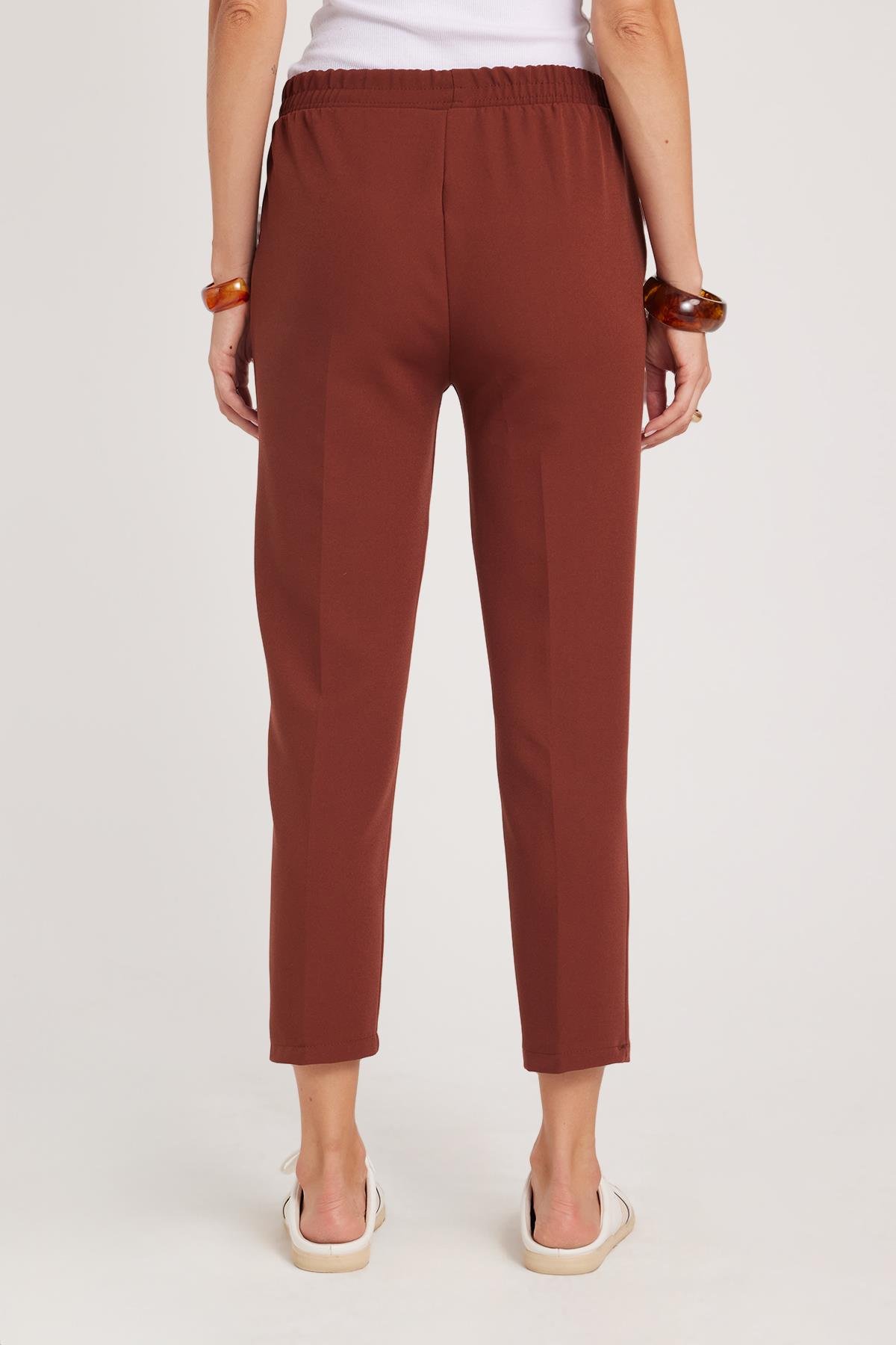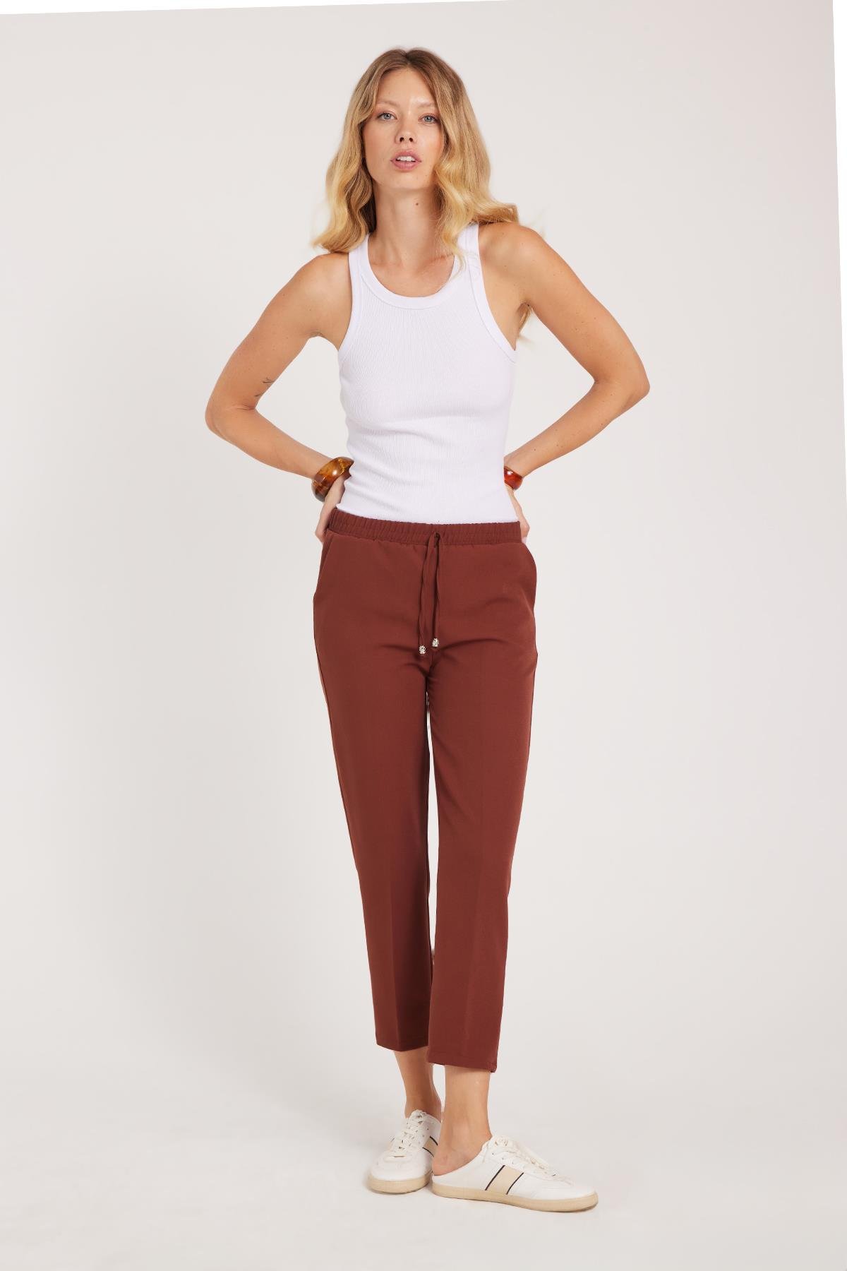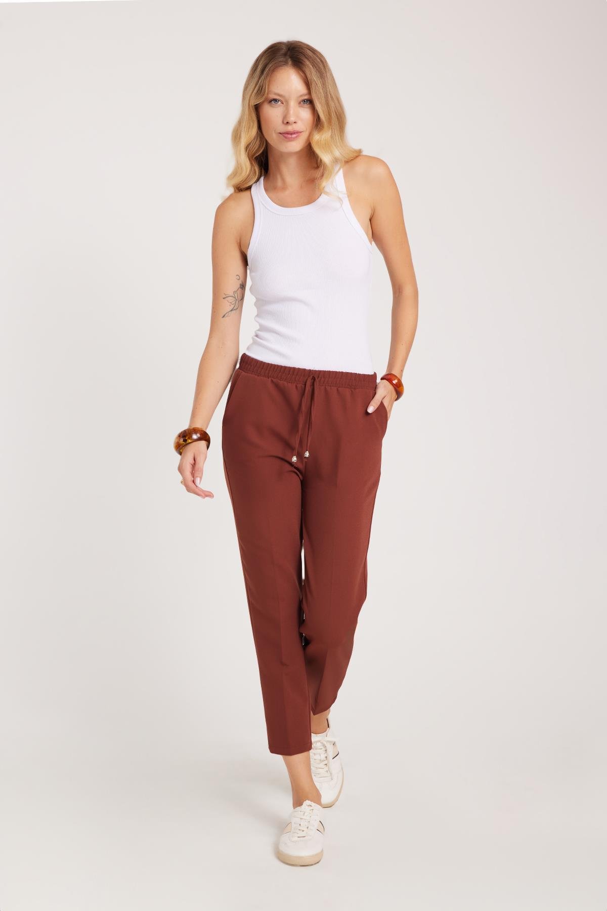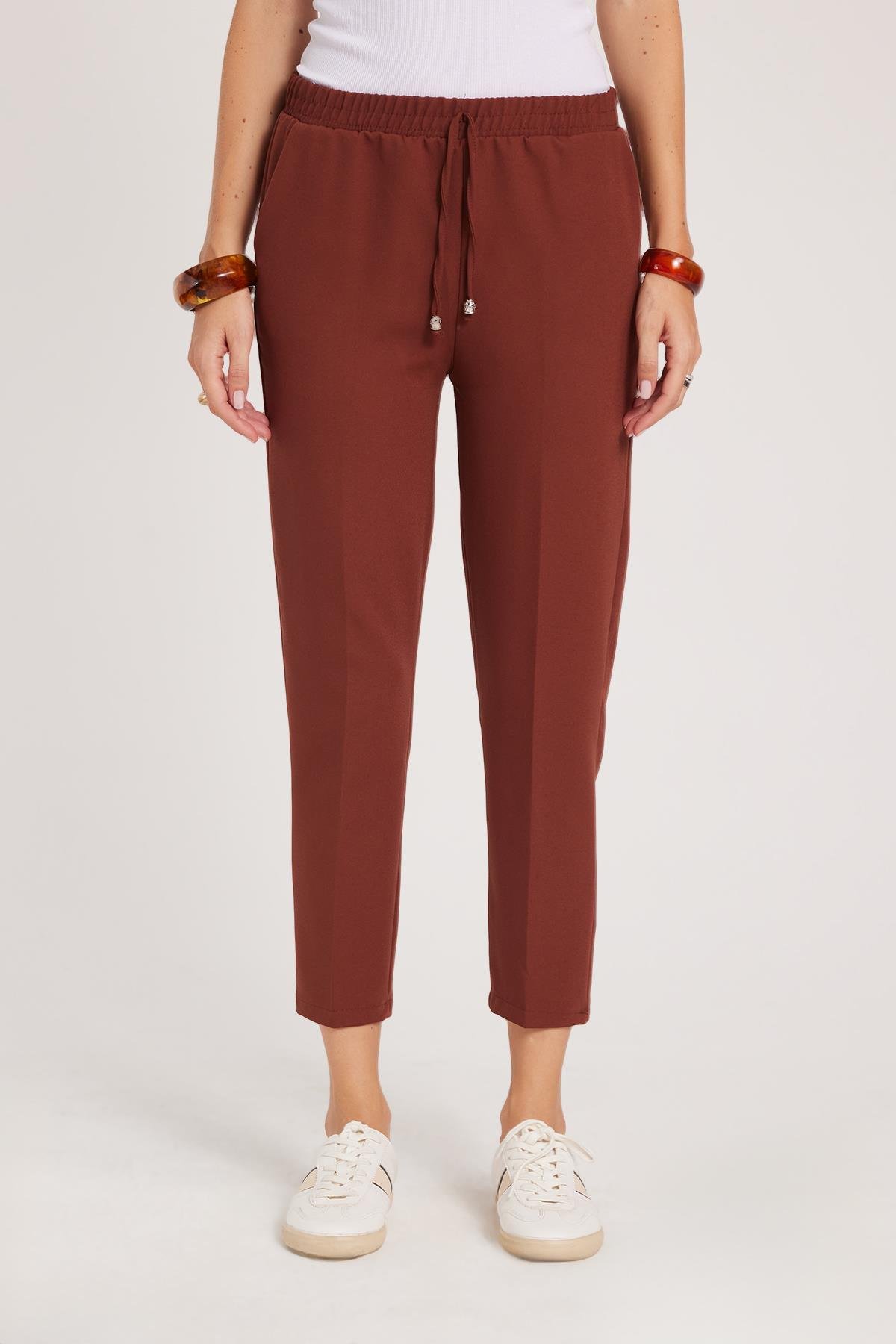 Kadın Relax Fit Rahat Kesim Yüksel Bel Dar Paça Beli Lastikli Bağcıklı Kahverengi Pantolon