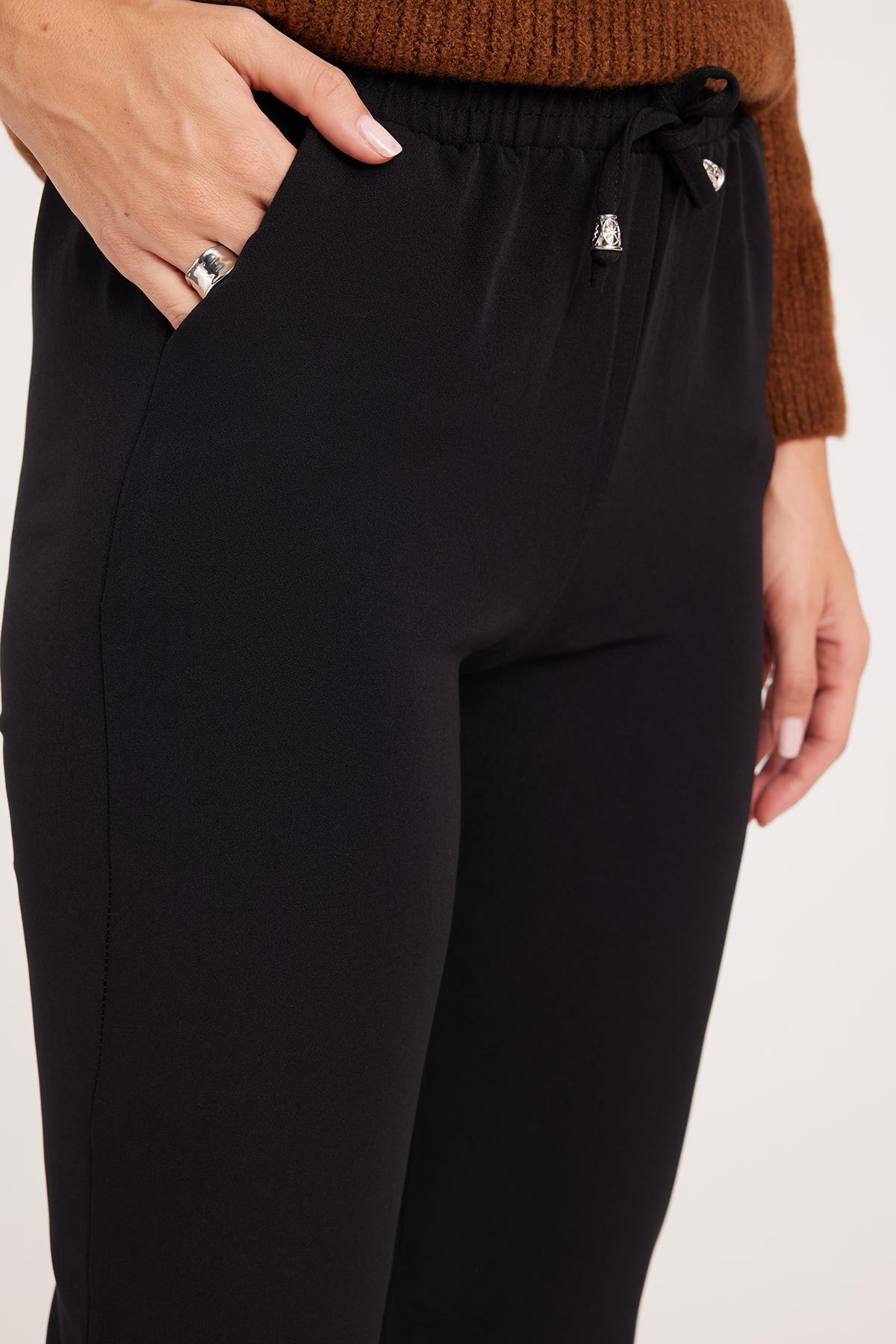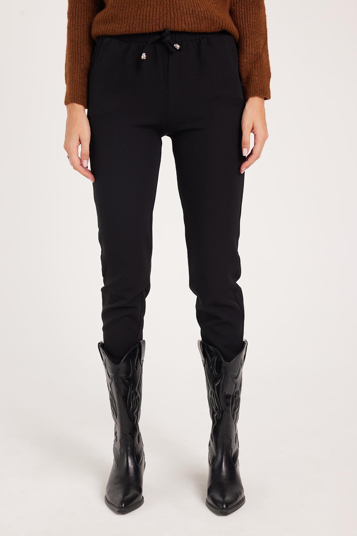 Kadın Relax Fit Rahat Kesim Yüksel Bel Dar Paça Beli Lastikli Bağcıklı Siyah Pantolon (PN250046-02)