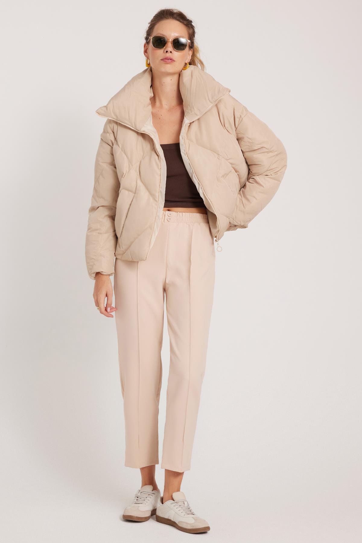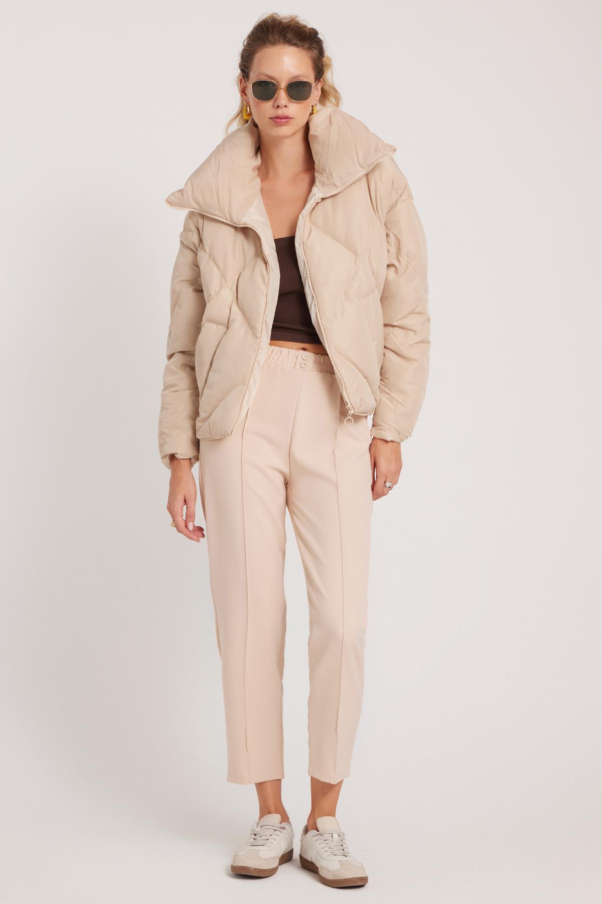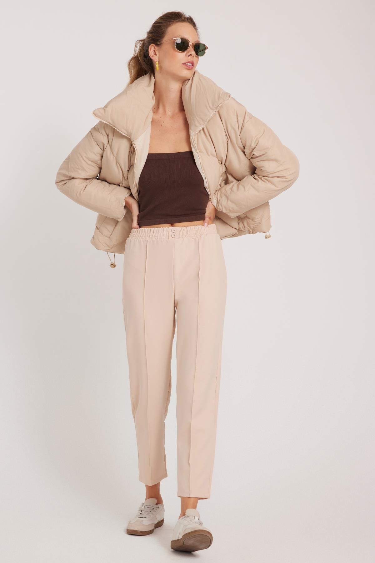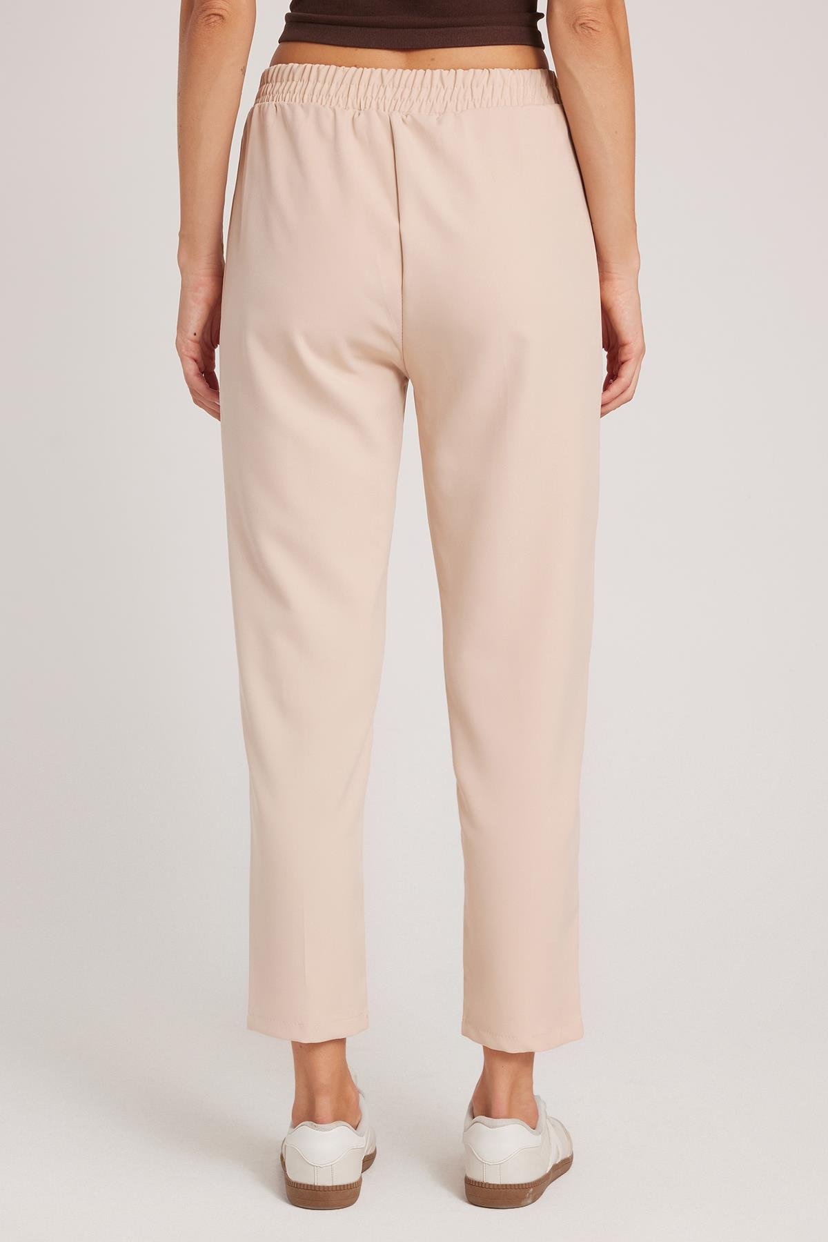 Kadın Relax Fit Rahat Kesim Yüksel Bel Düz Paça Beli Lastikli Bağcıklı Bej Pantolon (PN250047-71)