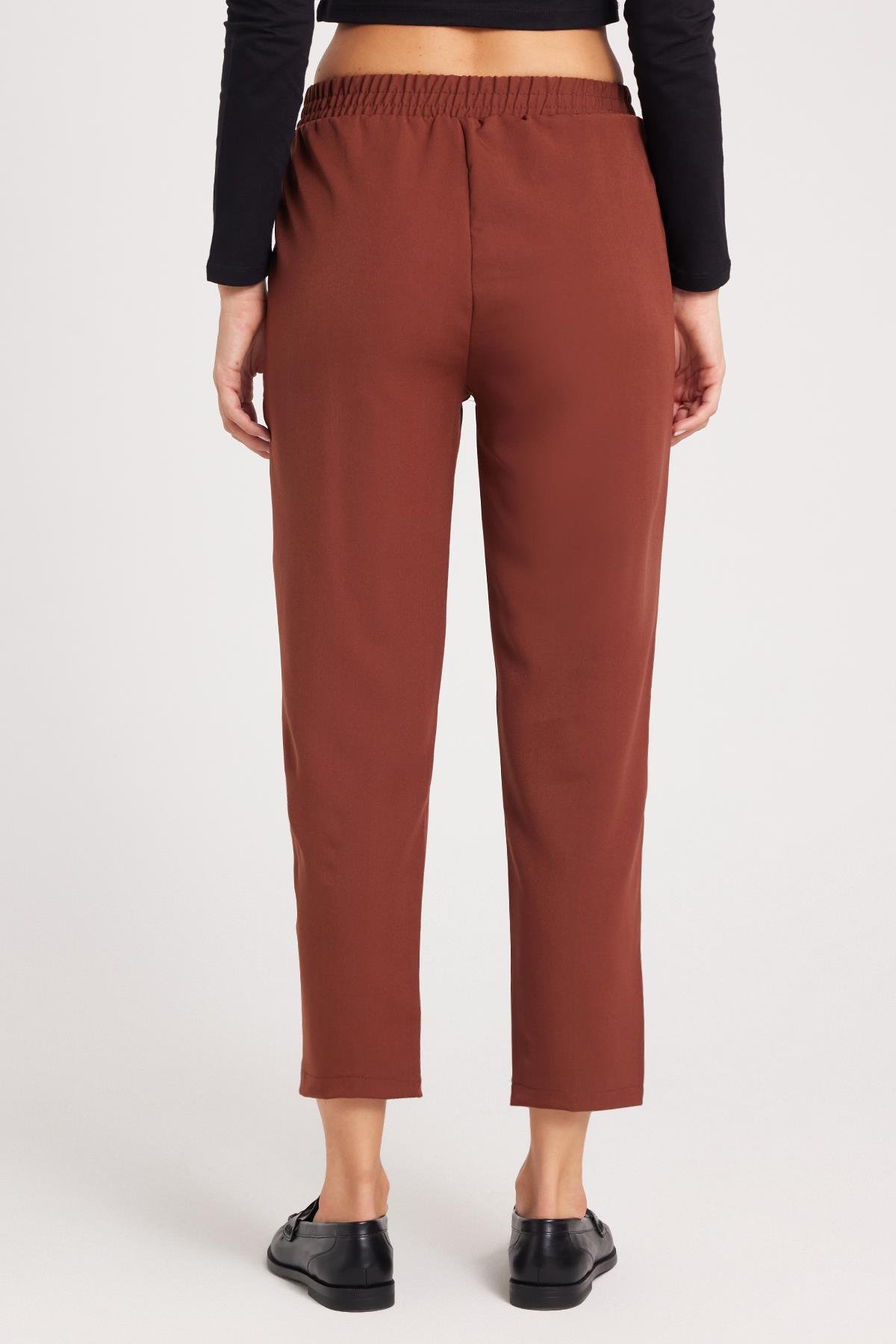 Kadın Relax Fit Rahat Kesim Yüksel Bel Düz Paça Beli Lastikli Bağcıklı Kahverengi Pantolon