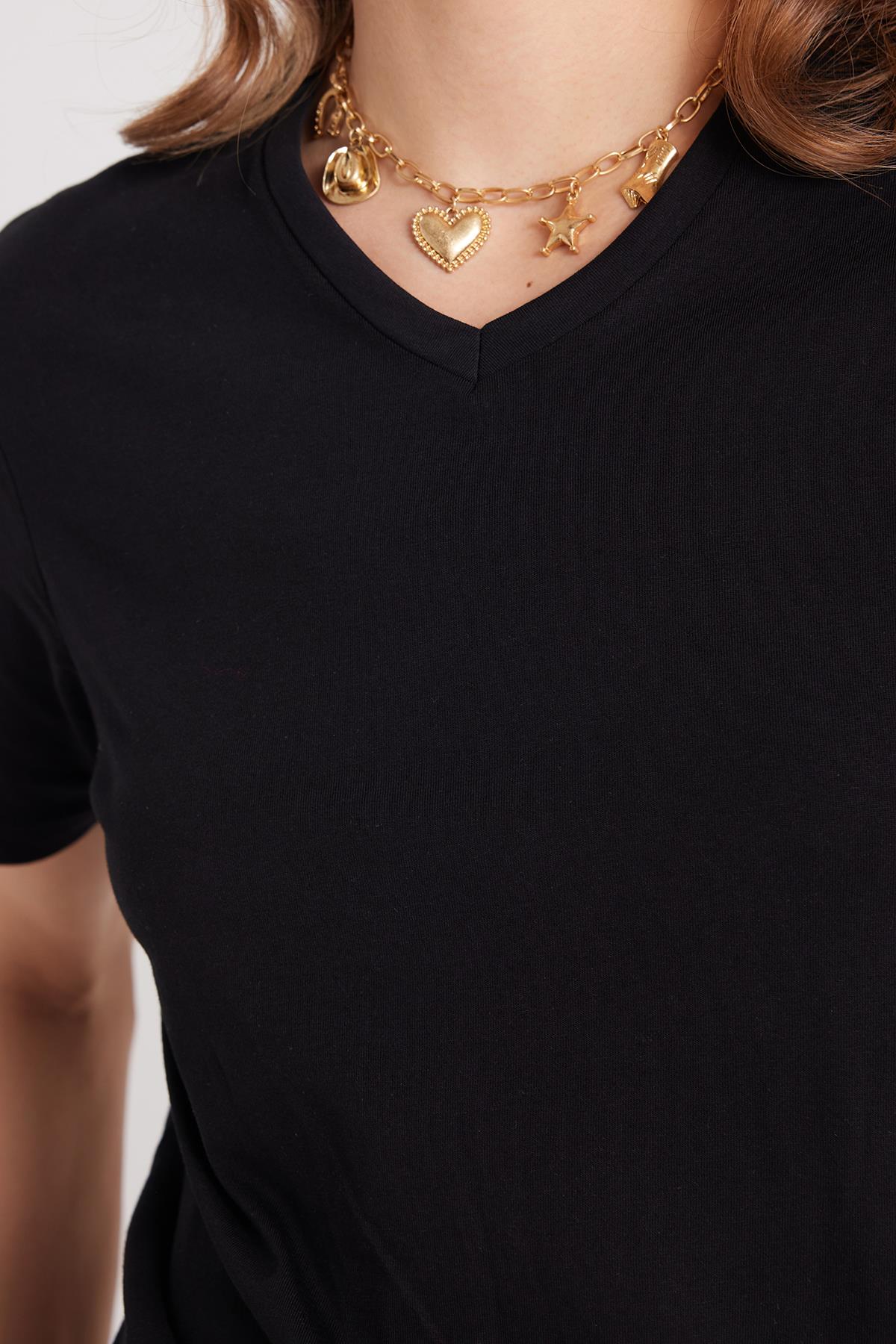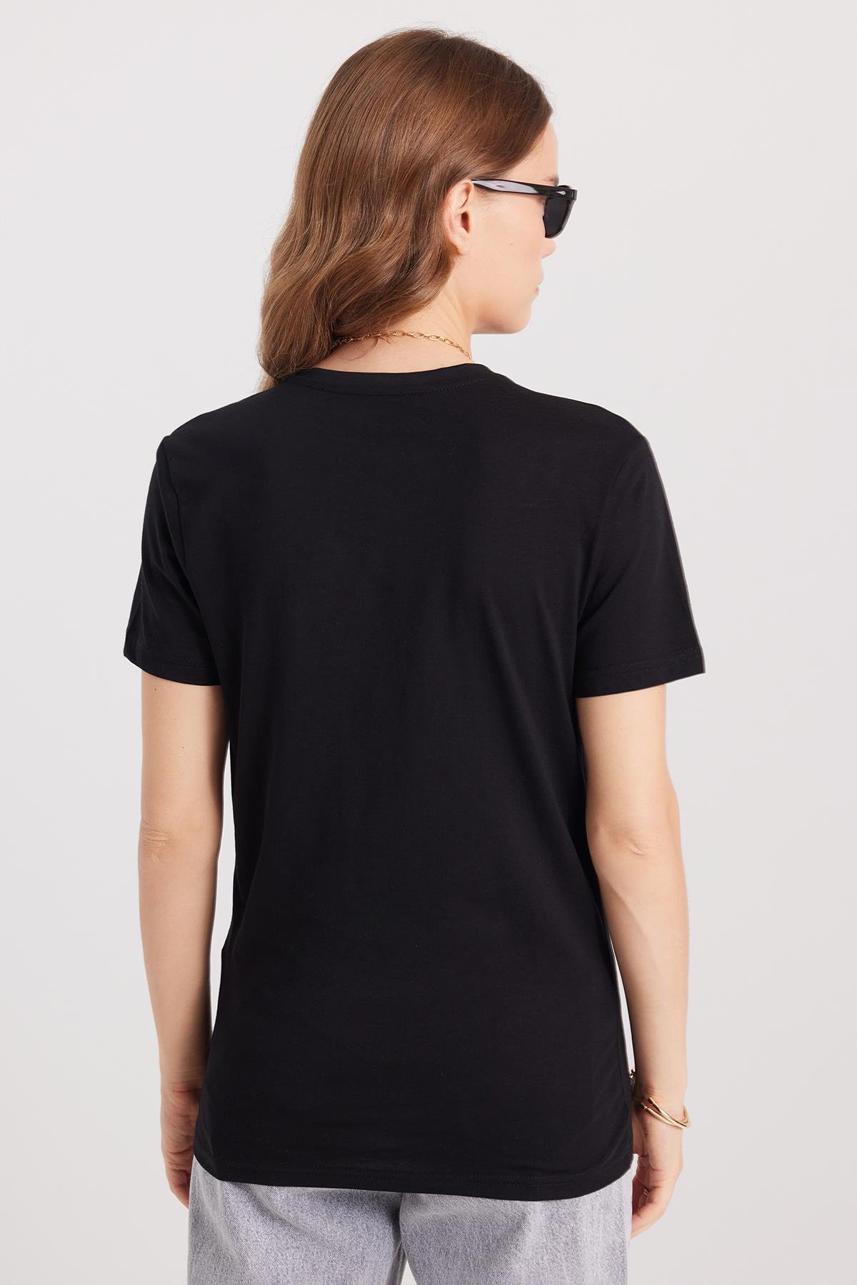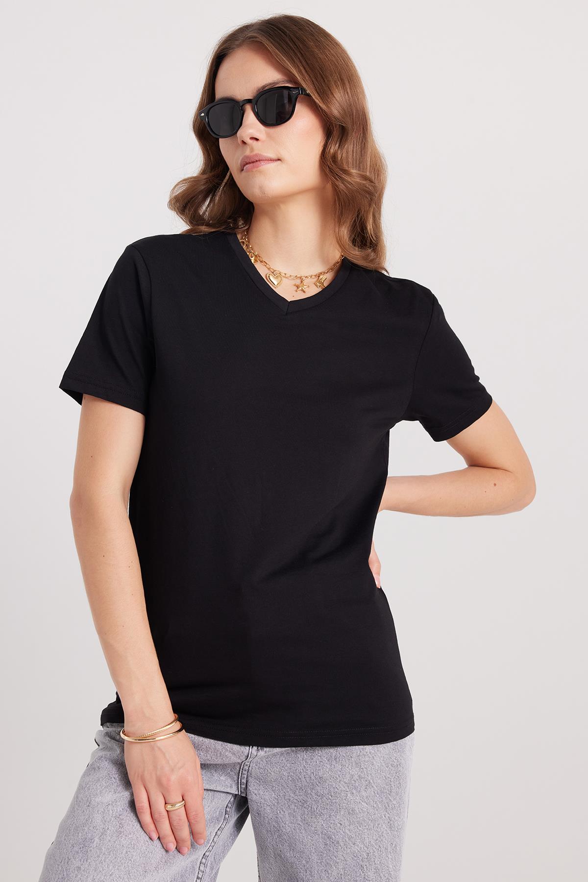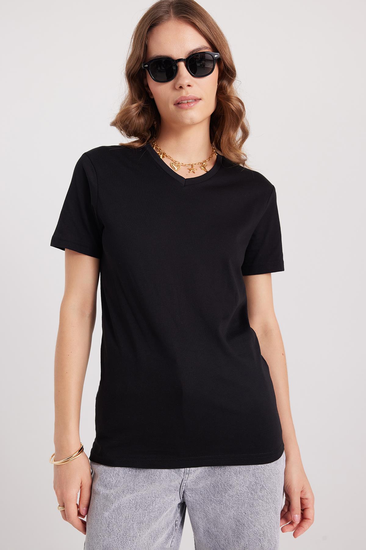 Kadın Slim Fit Dar Kesim %100 Pamuk Yumuşak Dokulu Siyah V Yaka Tişört (BDY25027-02)