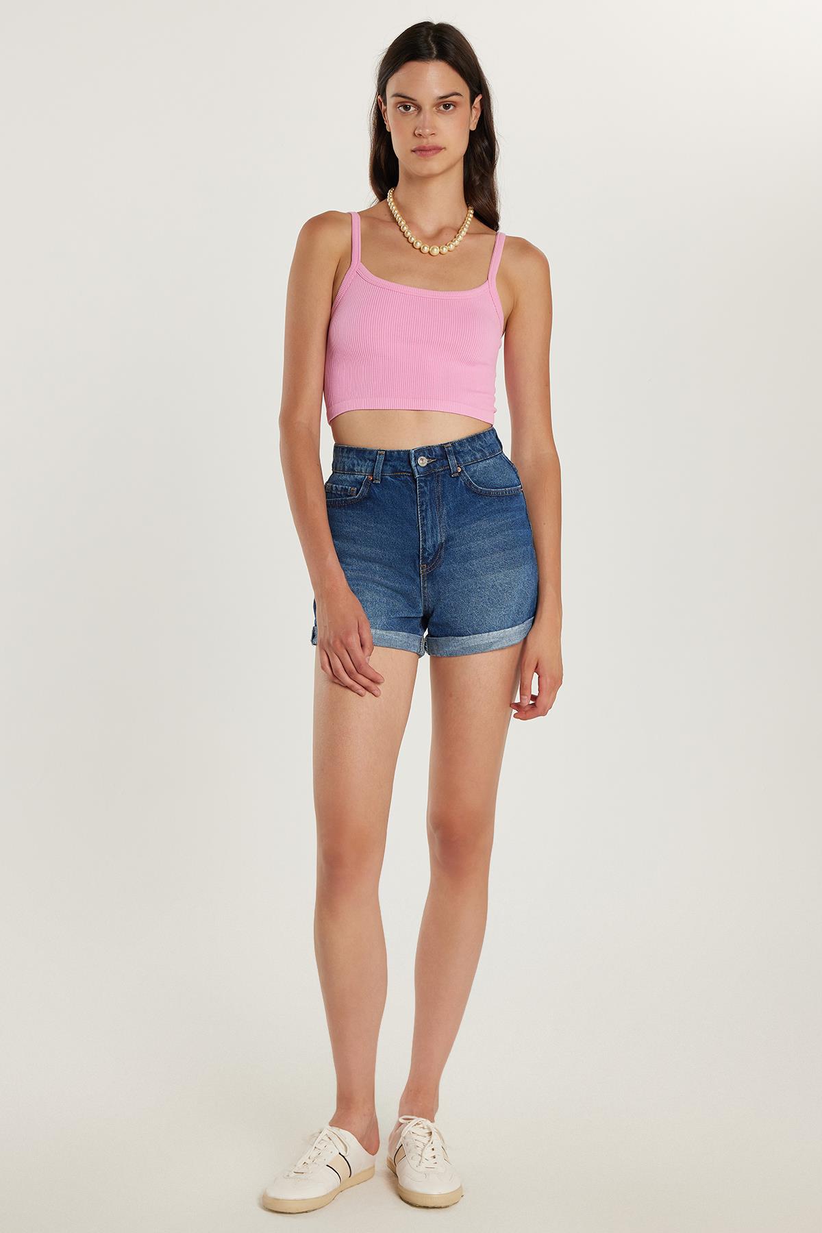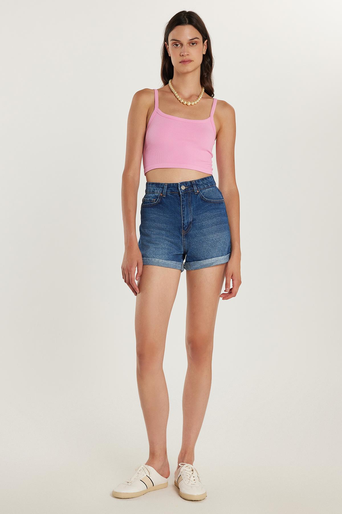 Kadın Slim Fit Dar Kesim %100 Pamuk Paça Katlamalı Açık Mavi Jean Kot Şort
