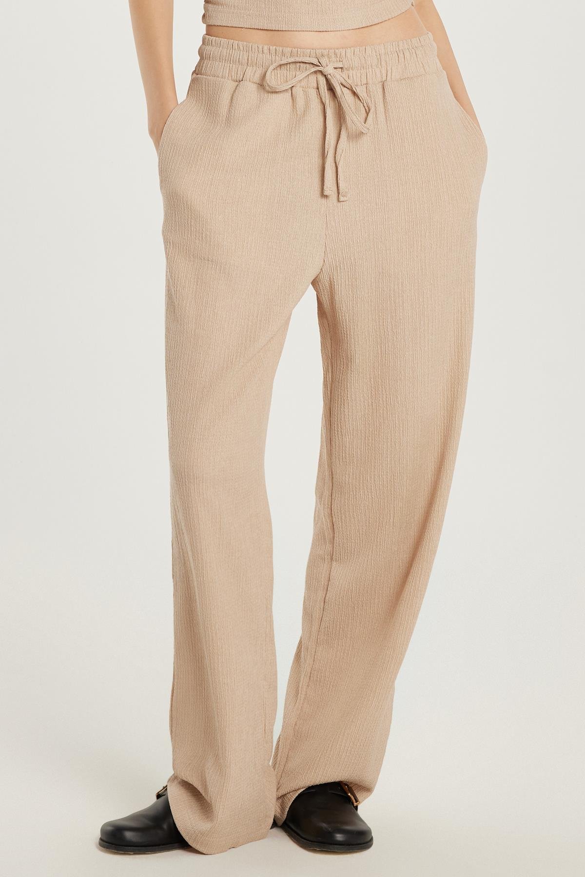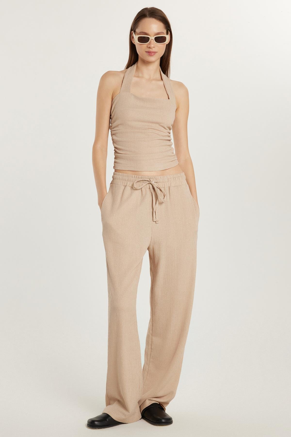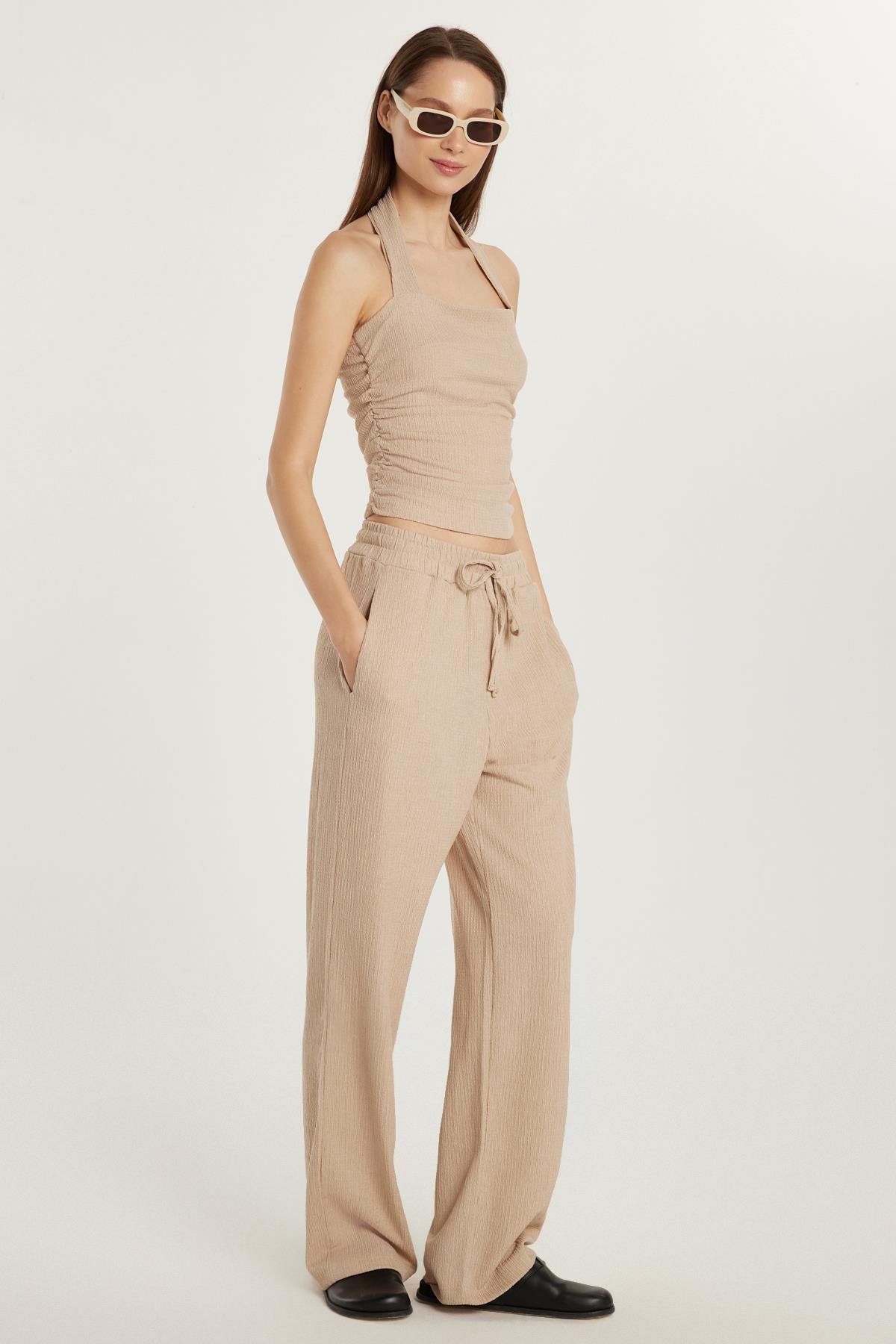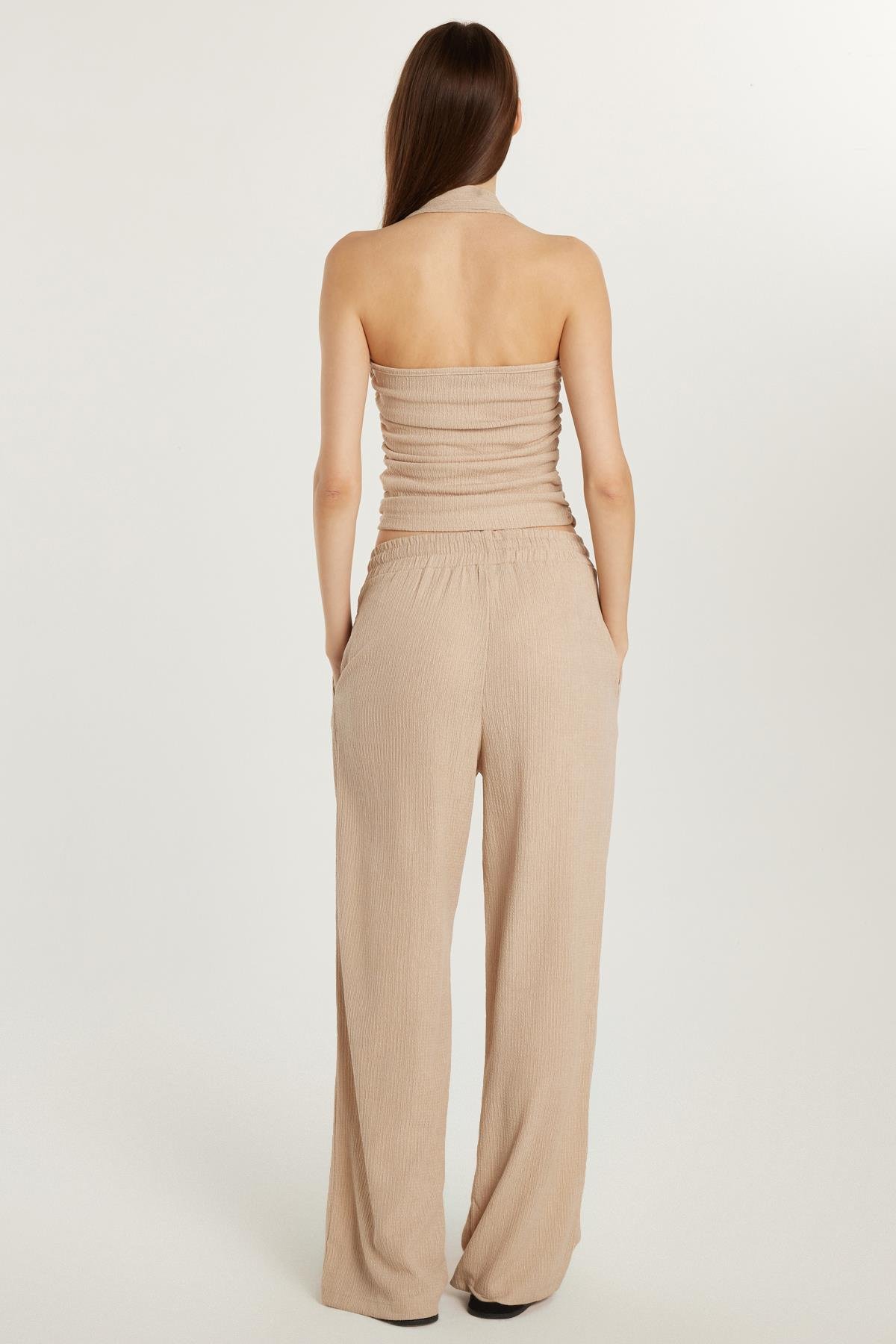 Kadın Slim Fit Dar Kesim Askılı Yaka Beli Lastikli Bej Bluz Pantolonlu Takım (AUT25007-71)