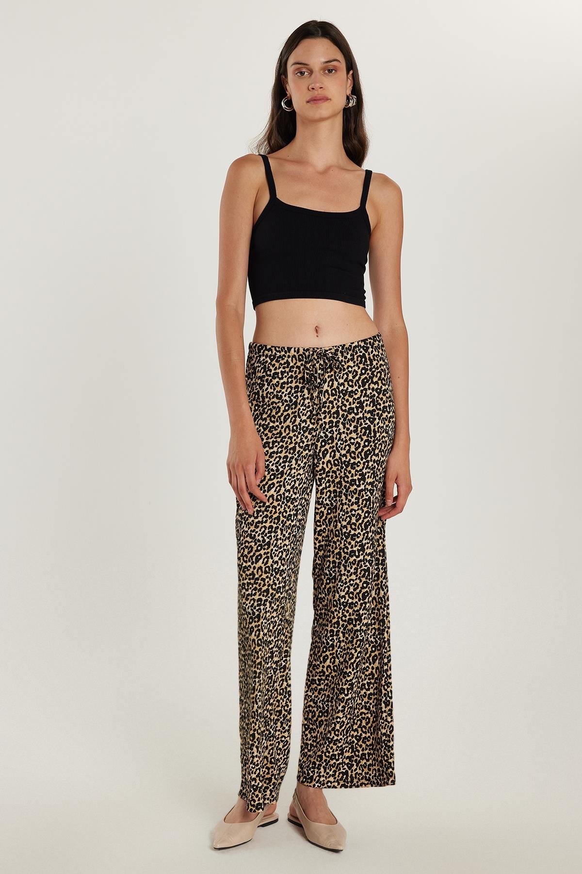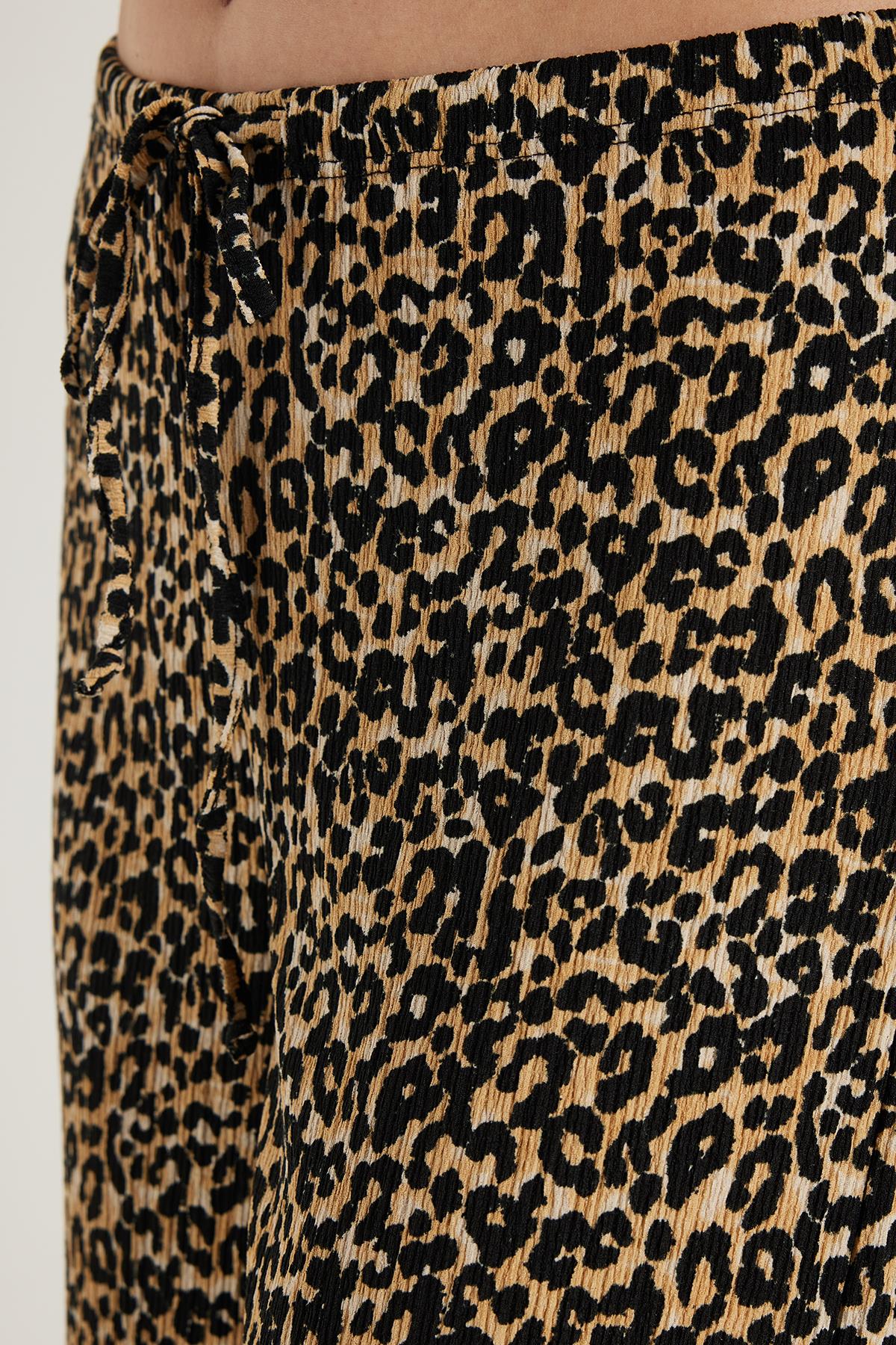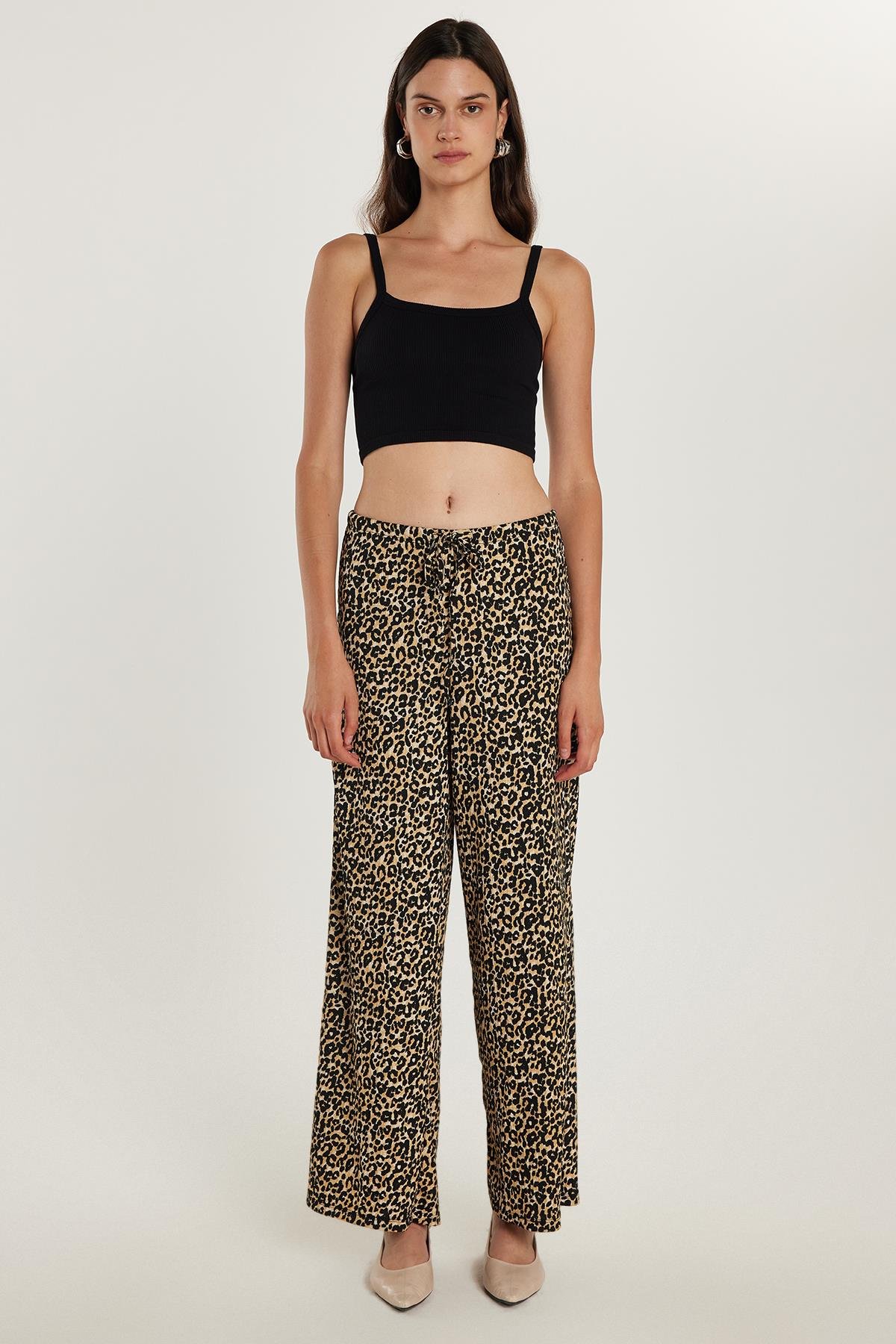 Kadın Slim Fit Dar Kesim Beli Lastikli Bağlamalı Leopar Desenli Pantolon