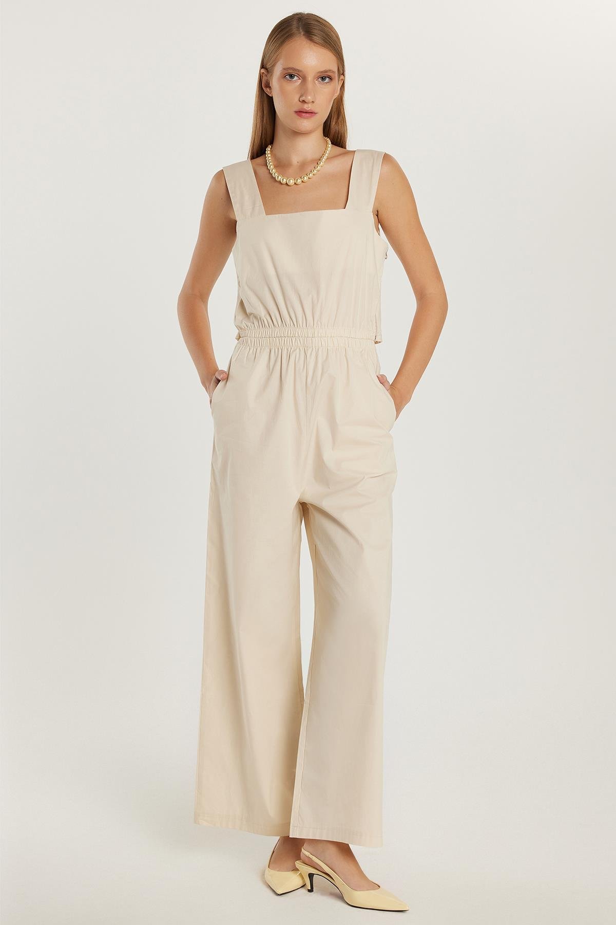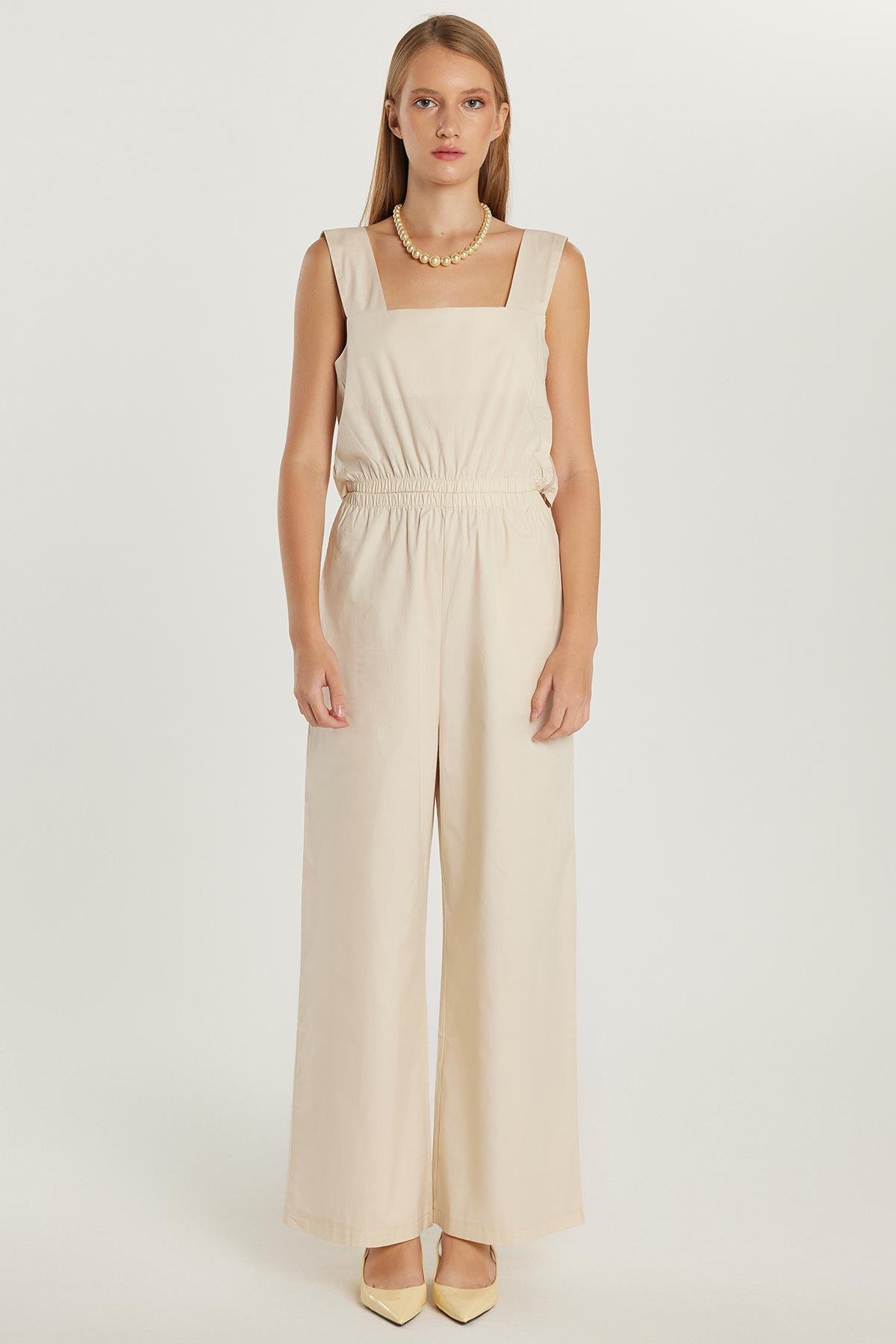 Kadın Slim Fit Dar Kesim Beli Lastikli Bol Paça Askılı Yaka Bej Tulum  (ELB25023-71)