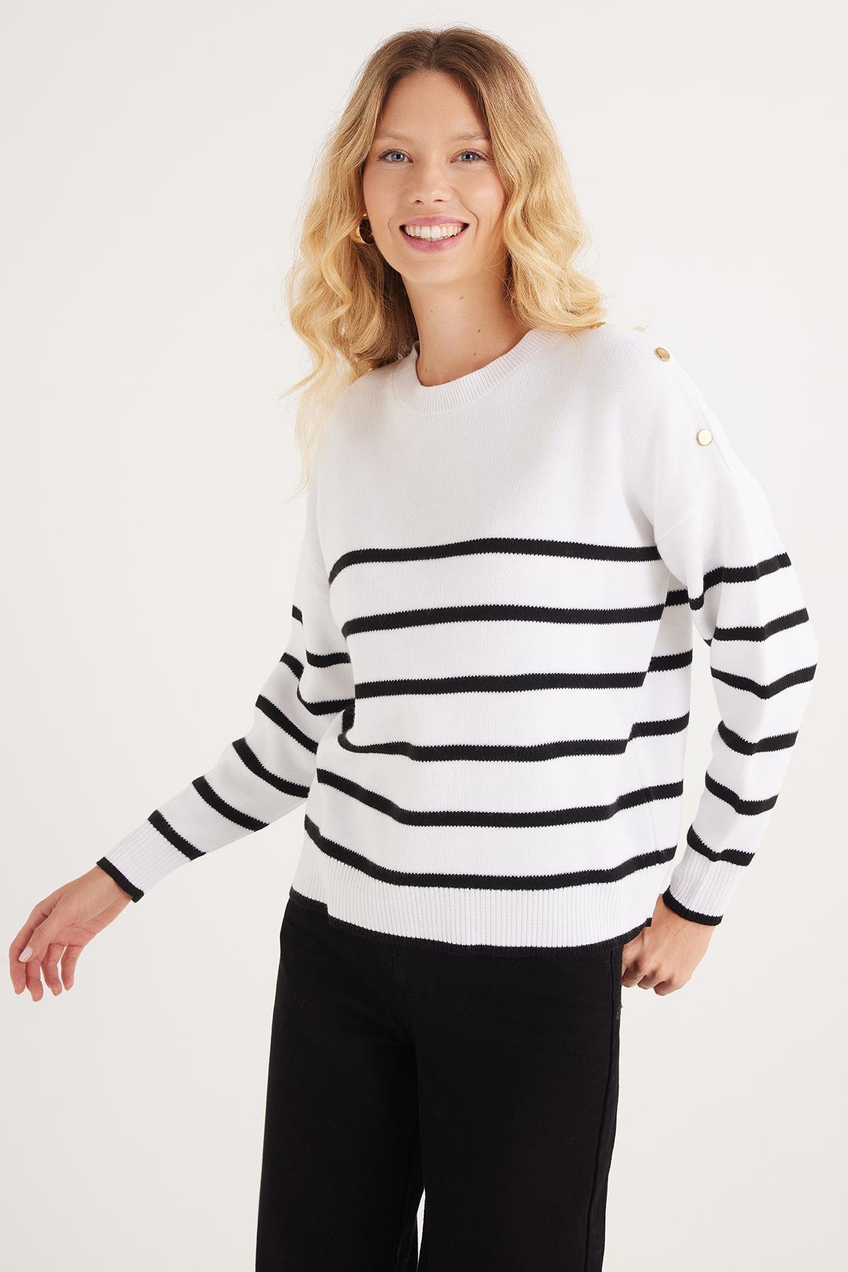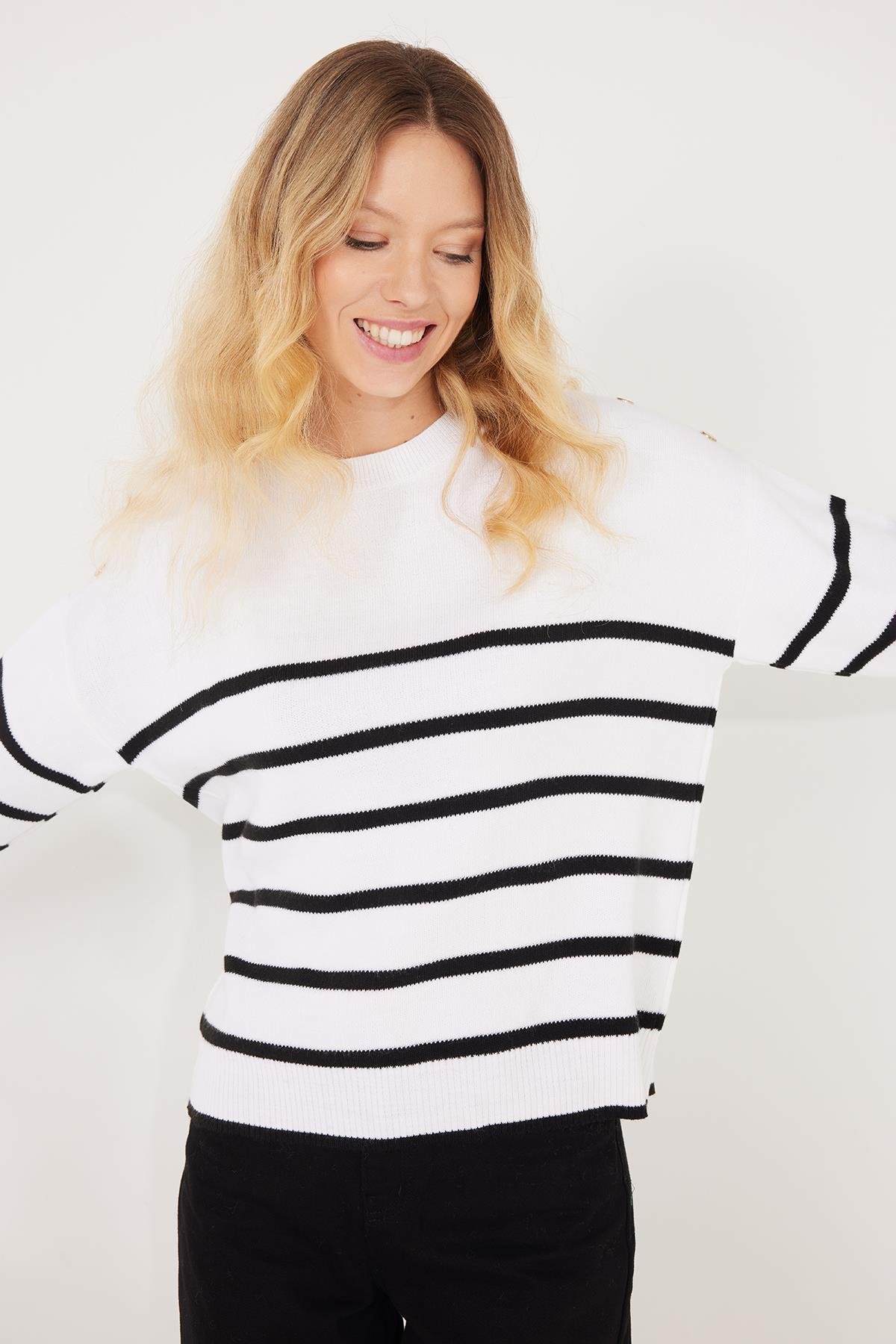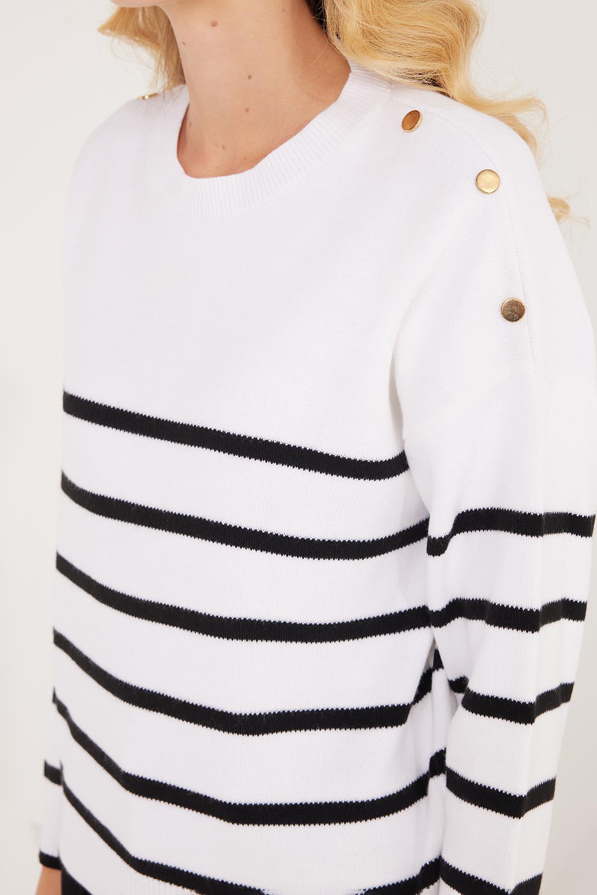 Kadın Slim Fit Dar Kesim Bisiklet Yaka Çizgili Beyaz Kazak (BYKZ2515-01)