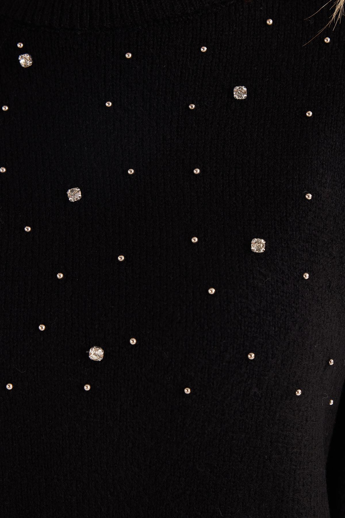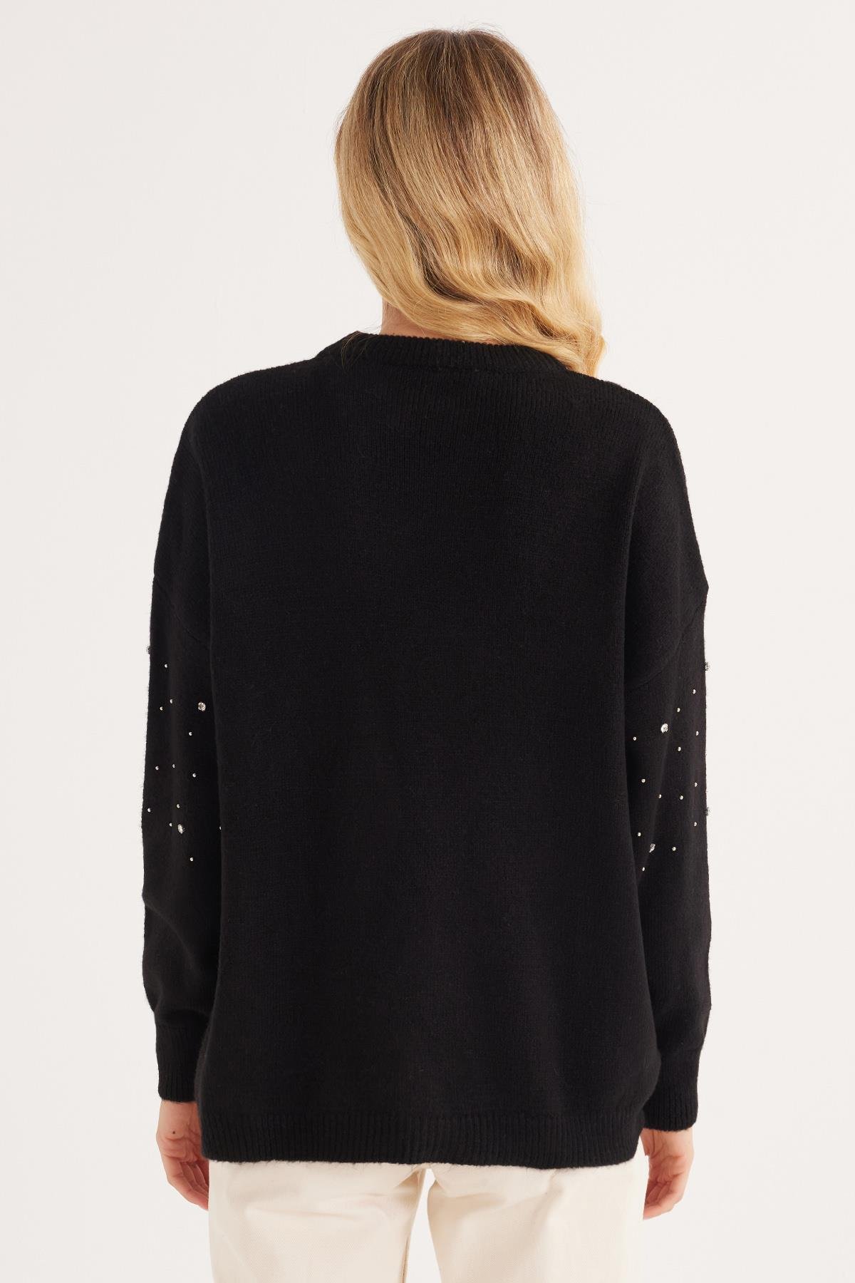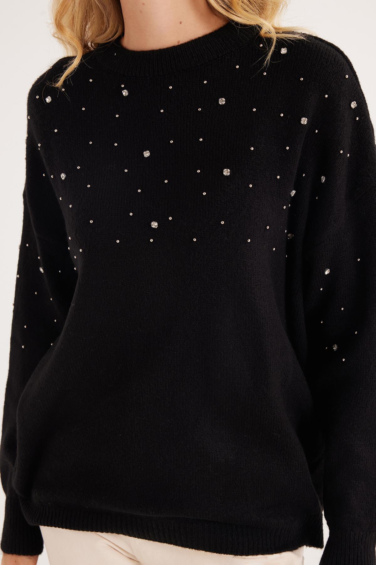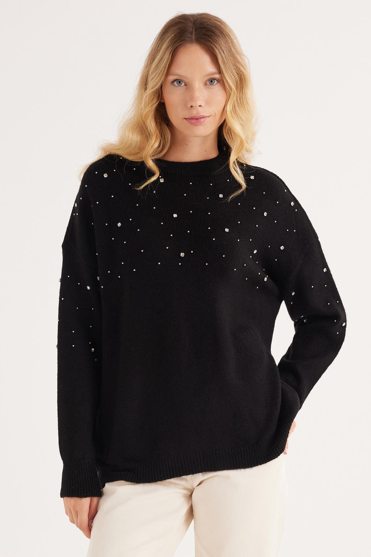 Kadın Slim Fit Dar Kesim Bisiklet Yaka İşlemeli Siyah Kazak (BYKZ2517-02)