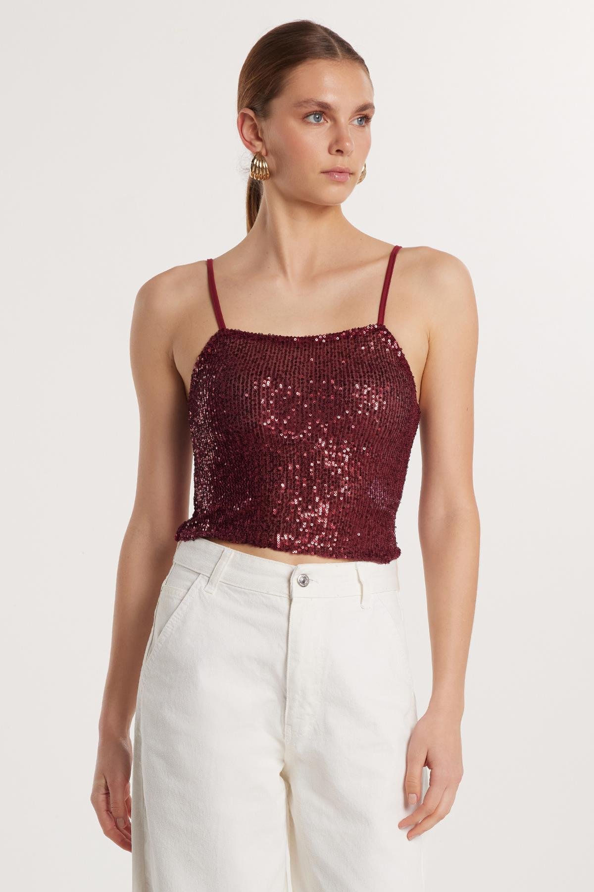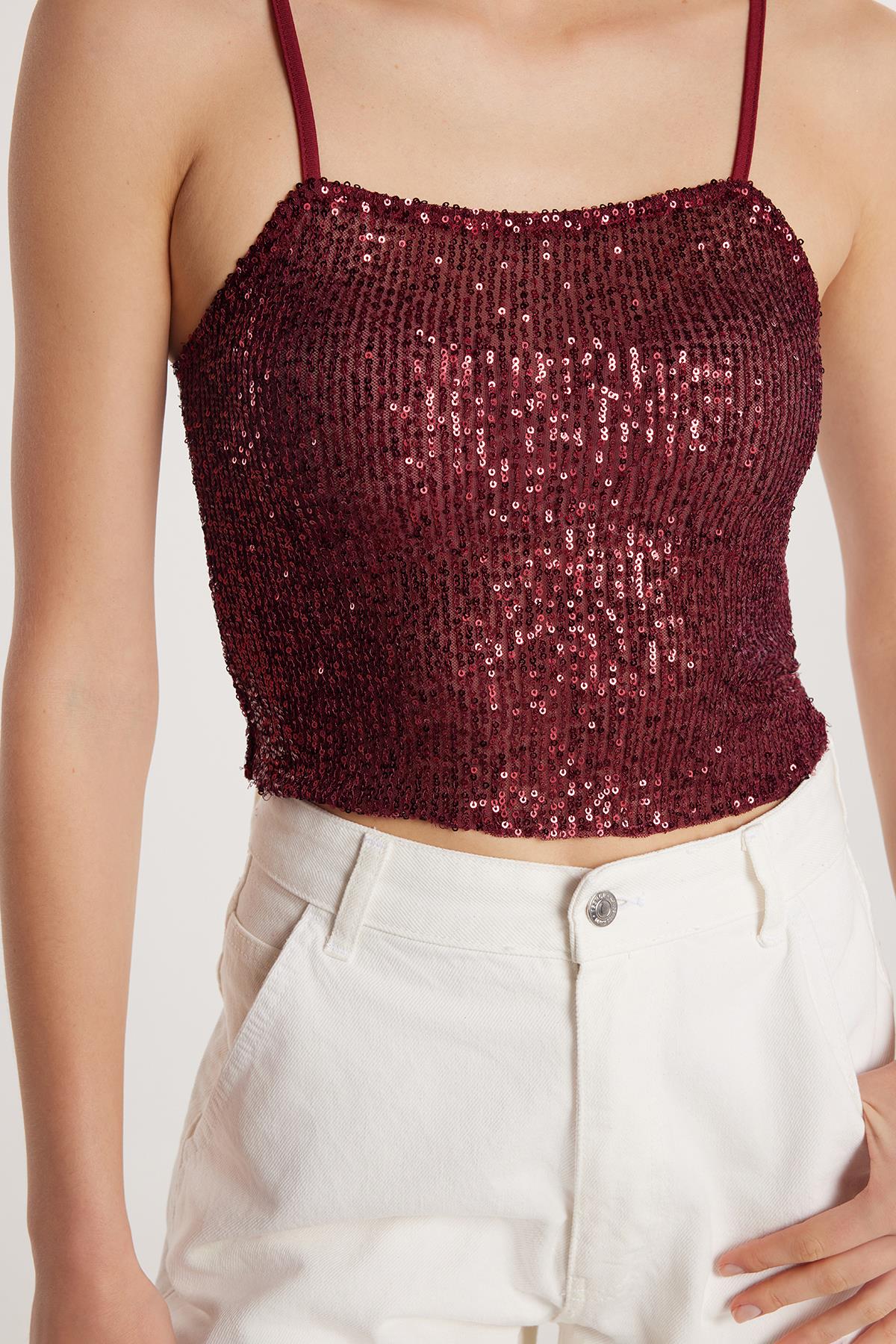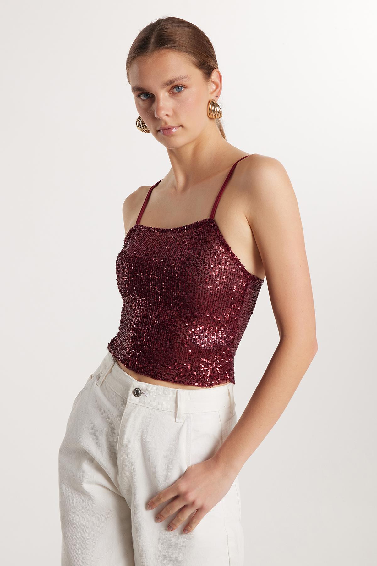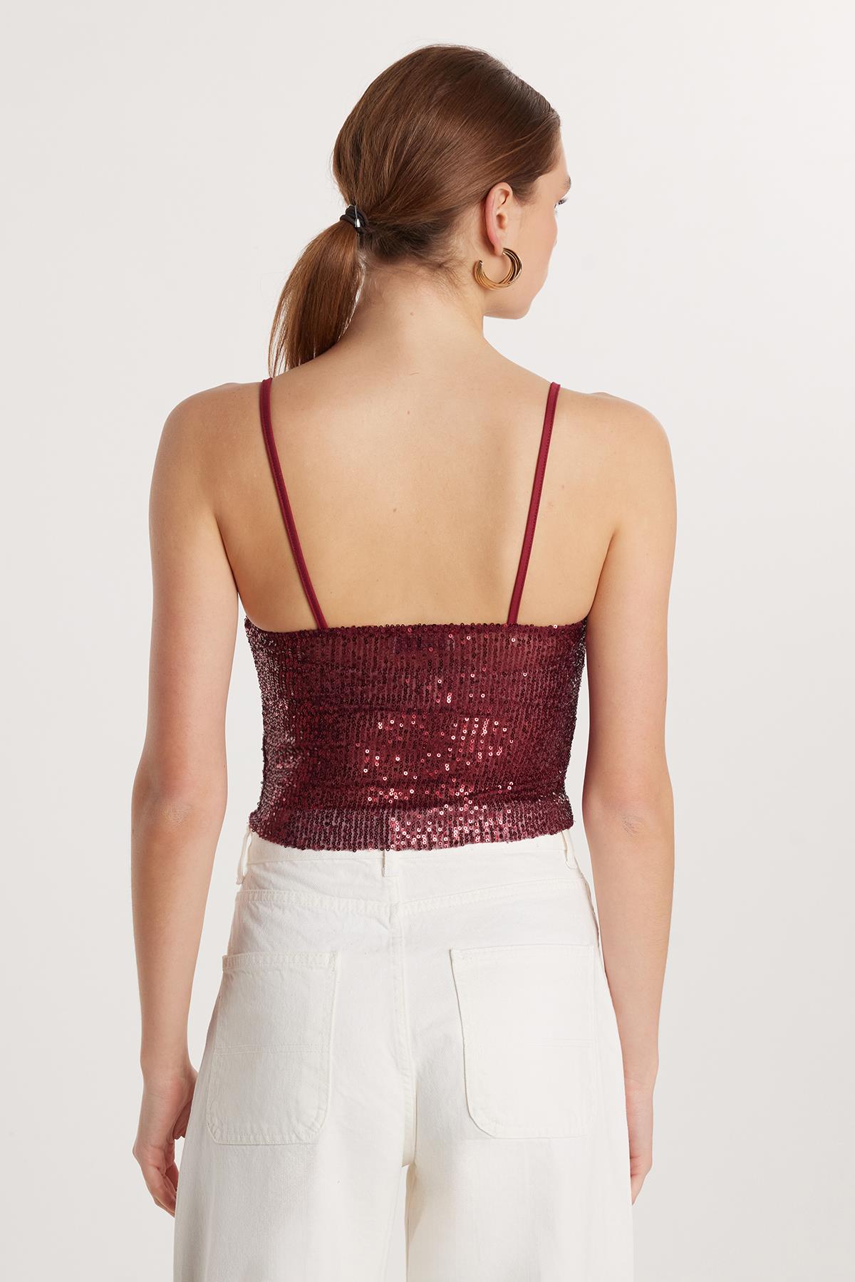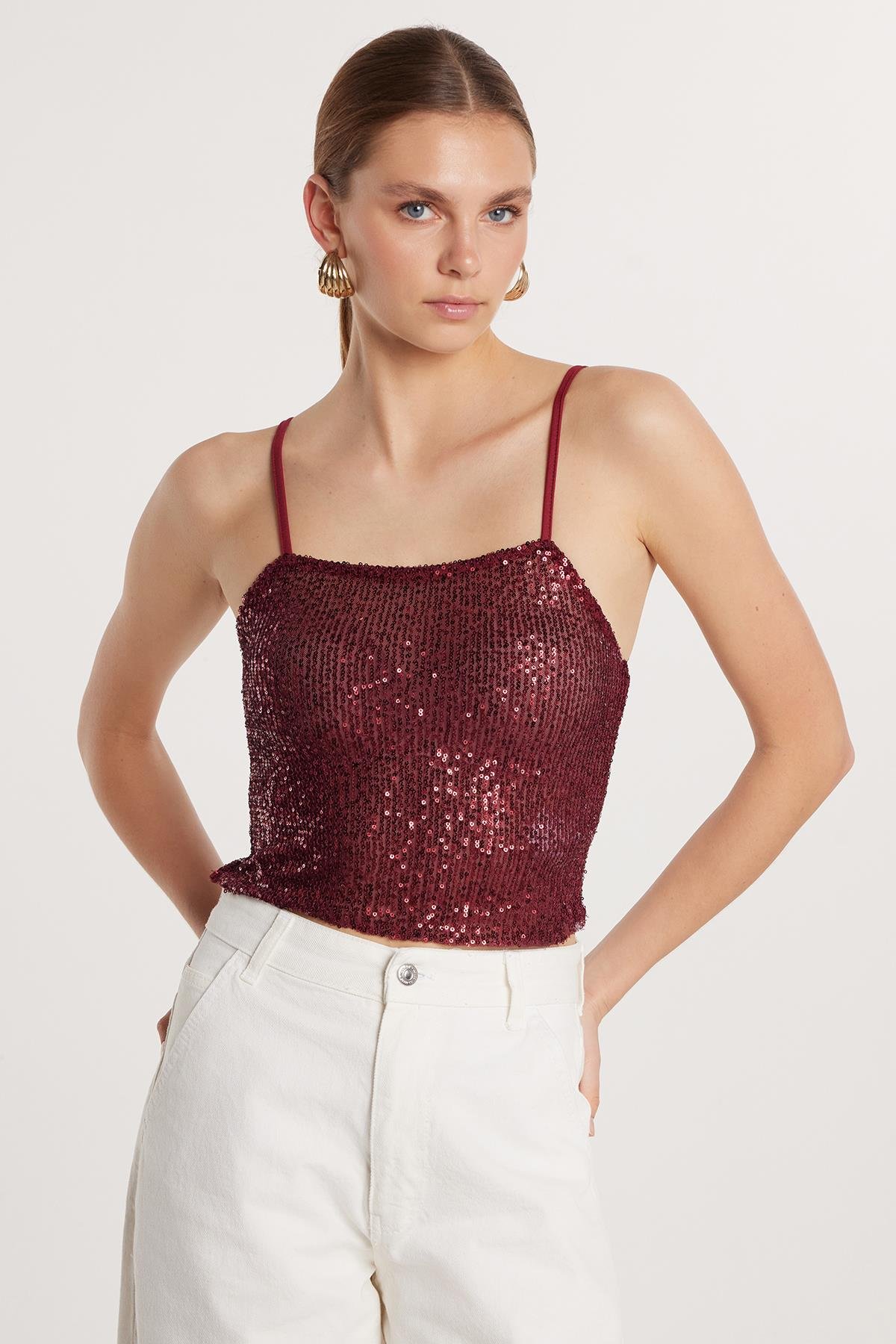 Kadın Slim Fit Dar Kesim Bordo Sıfır Kol U Yaka Bluz (KDN25233-08)