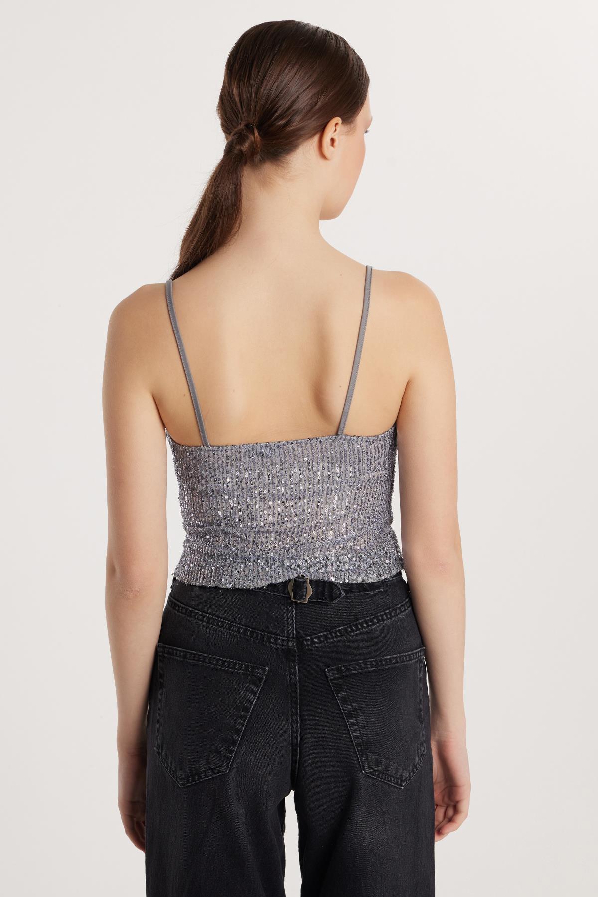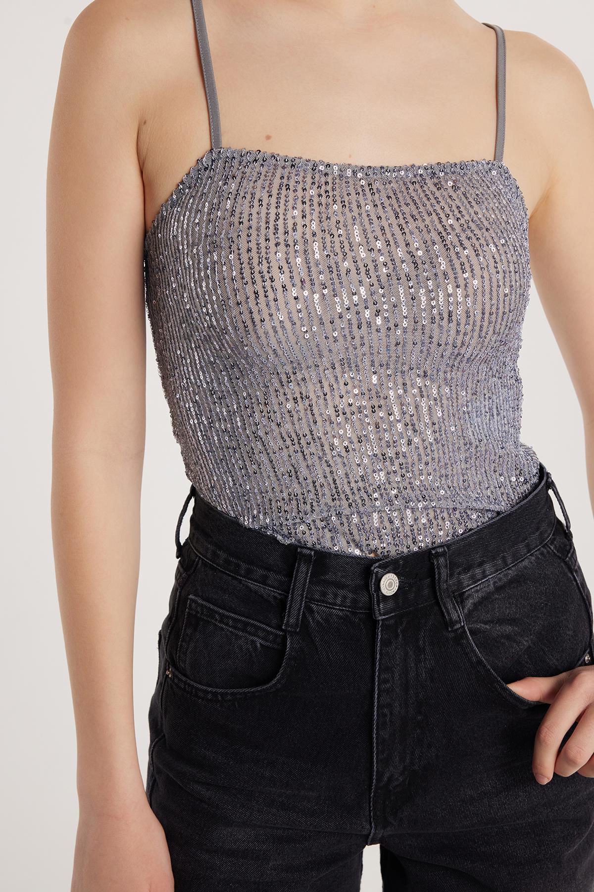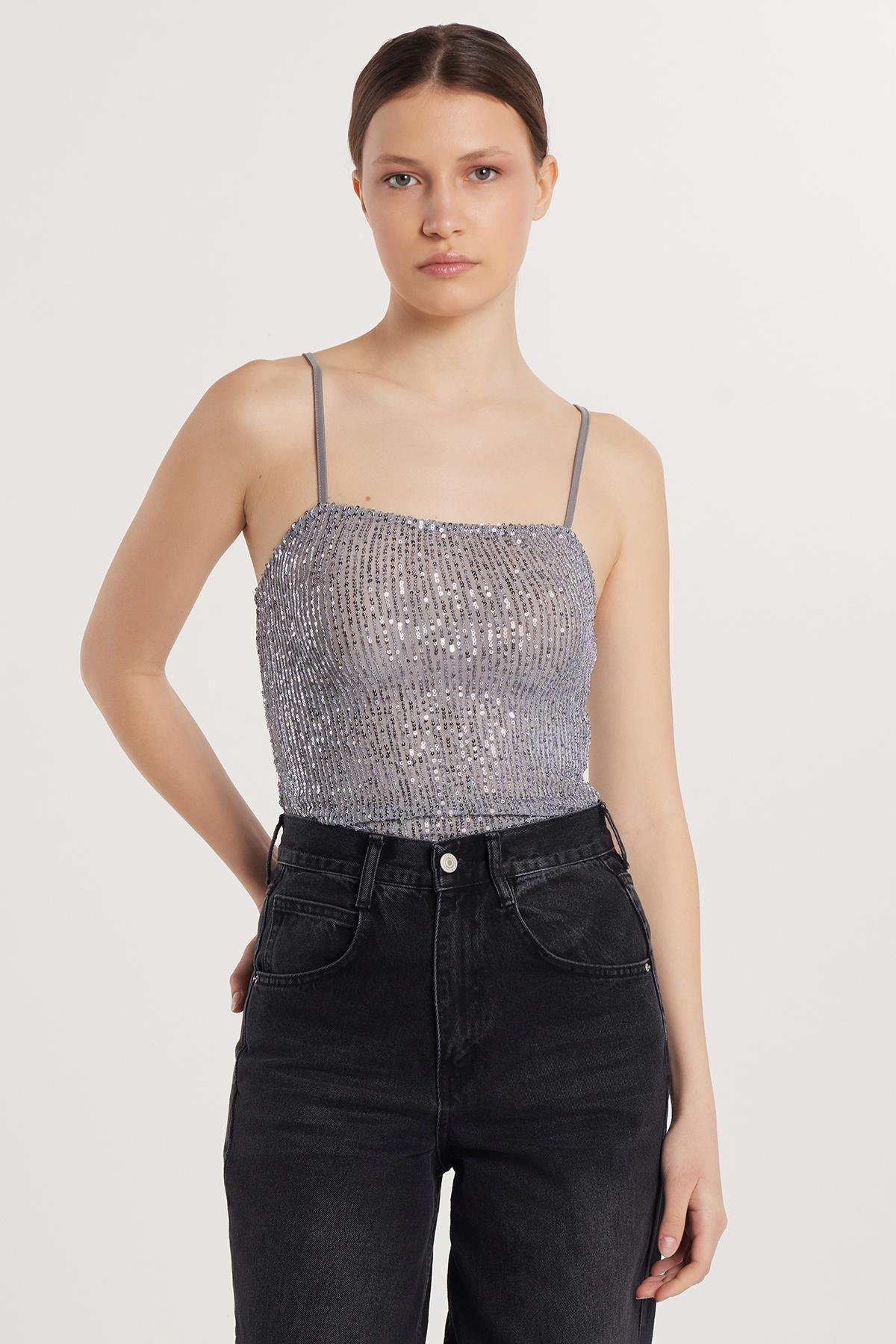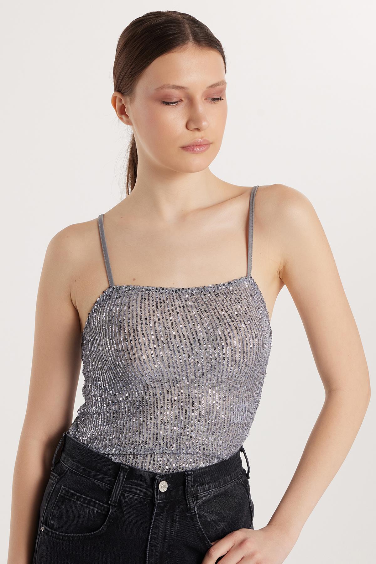 Kadın Slim Fit Dar Kesim Gri Sıfır kol U Yaka Bluz