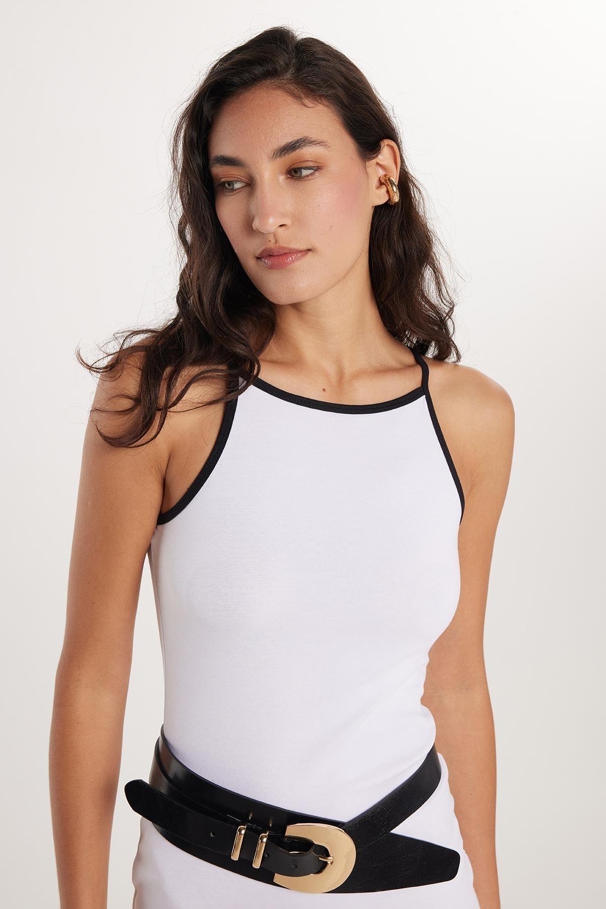 Kadın Slim Fit Dar Kesim İnce Askılı Halter Yaka Mini Beyaz Elbise (KDN25073-01)