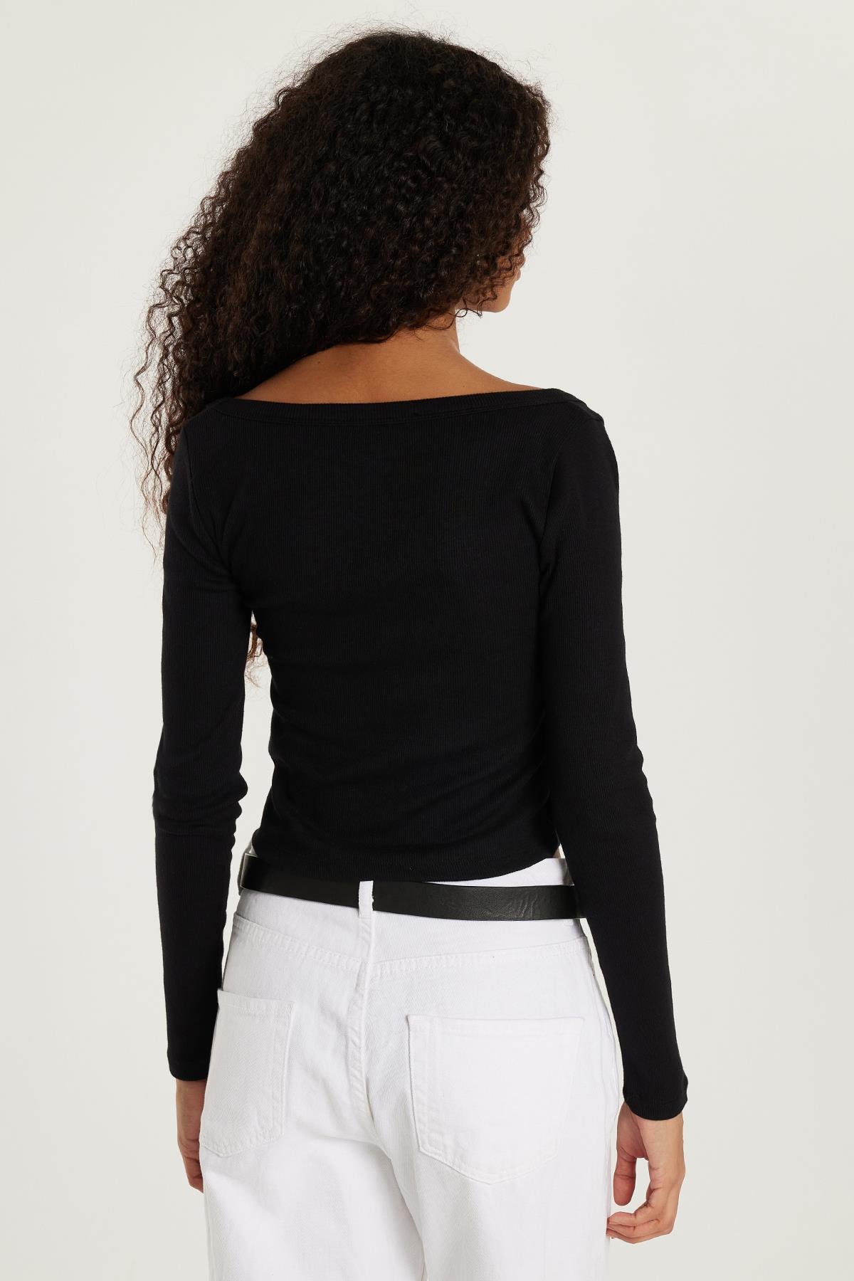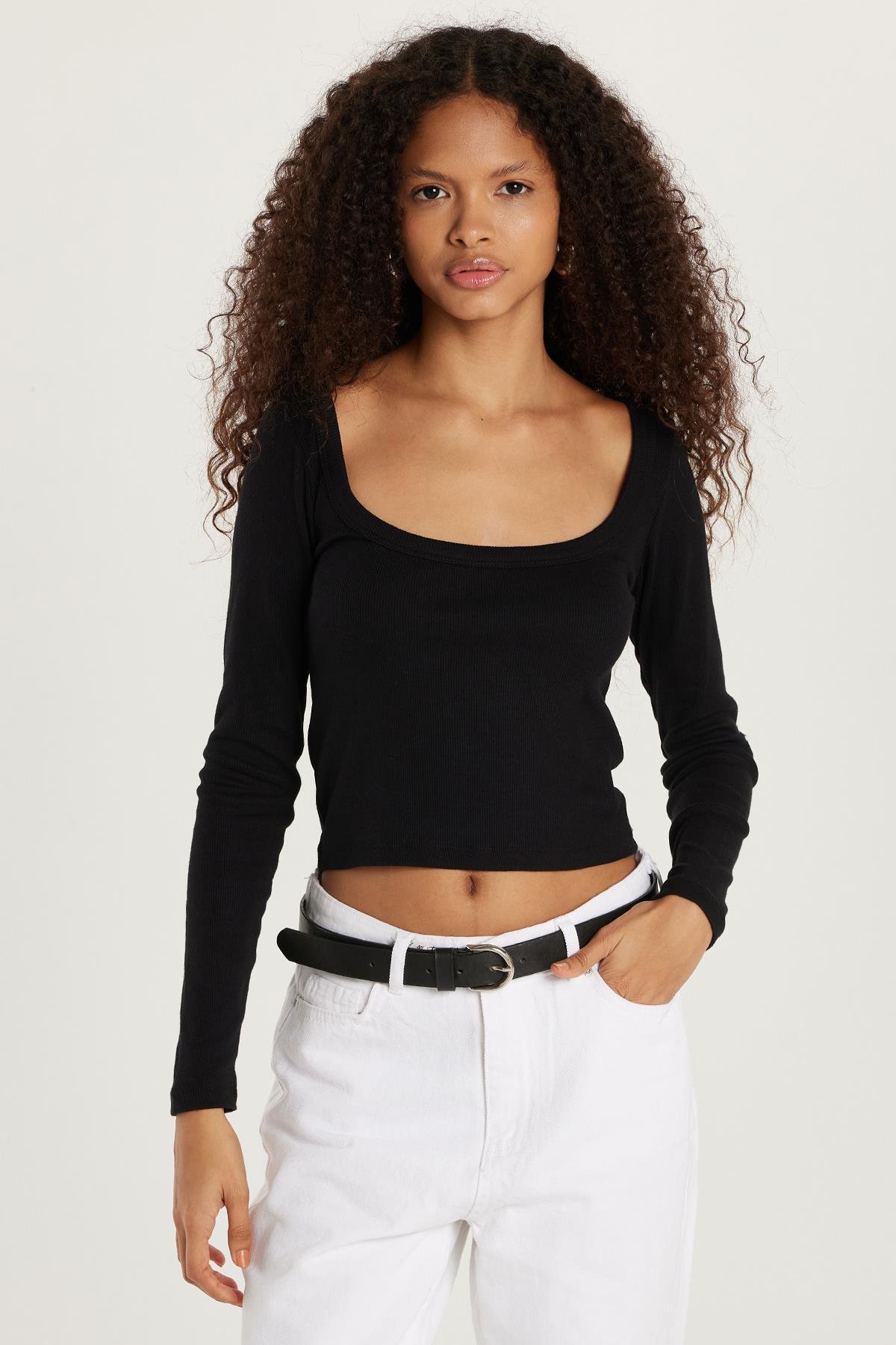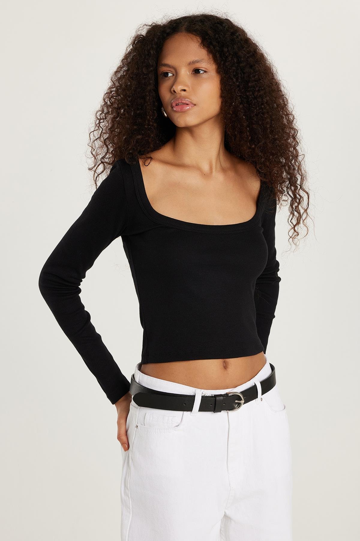 Kadın Modal Kumaş Slim Fit Dar Kesim Kare Yaka Siyah Bluz (KDN25066-02)