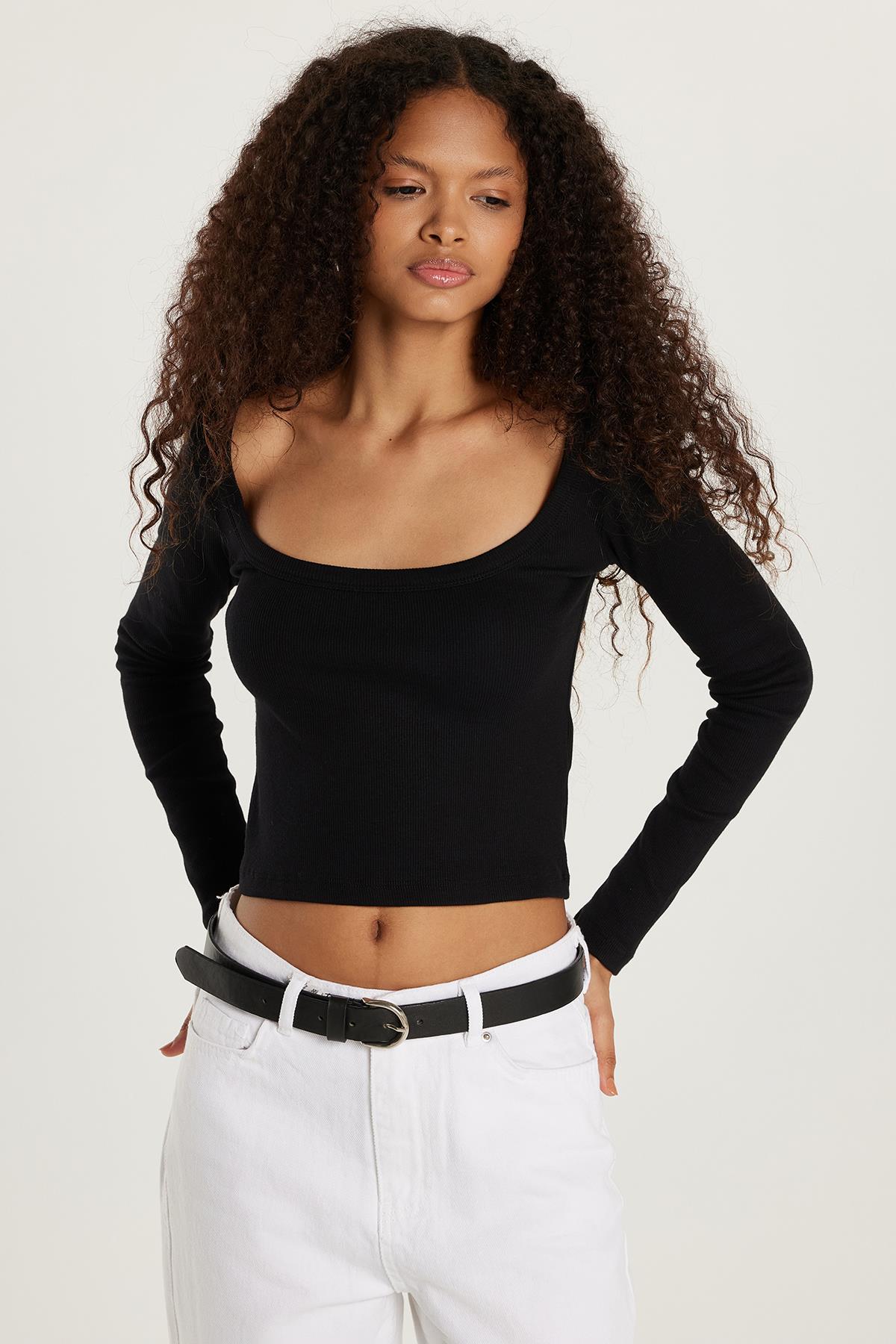 Kadın Modal Kumaş Slim Fit Dar Kesim Kare Yaka Siyah Bluz