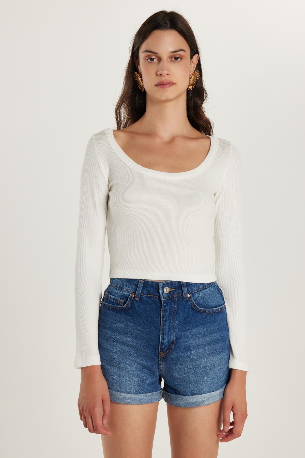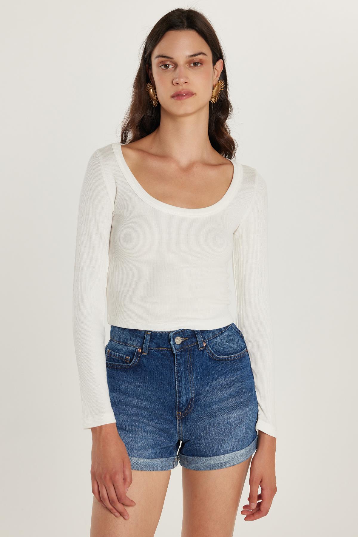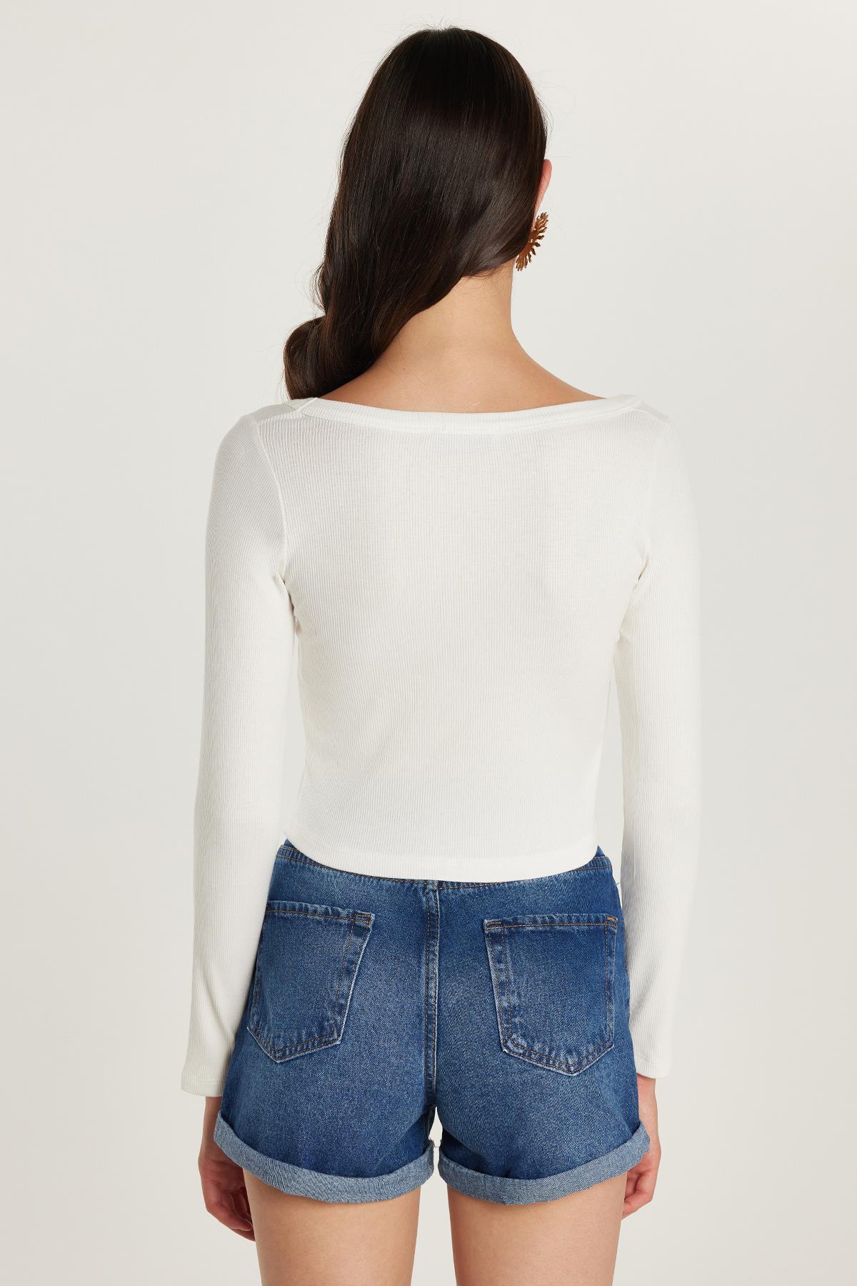 Kadın Slim Fit Dar Kesim Kısa Kollu Geniş Yaka Ekru Bluz (KDN25102-84)