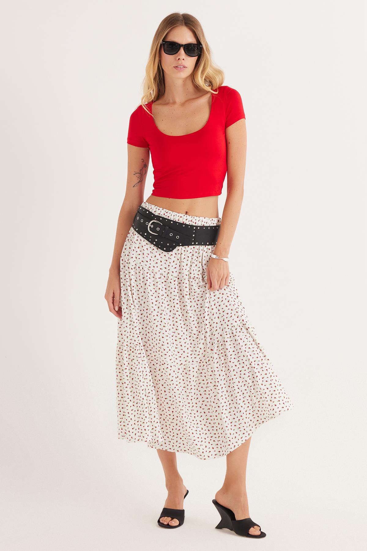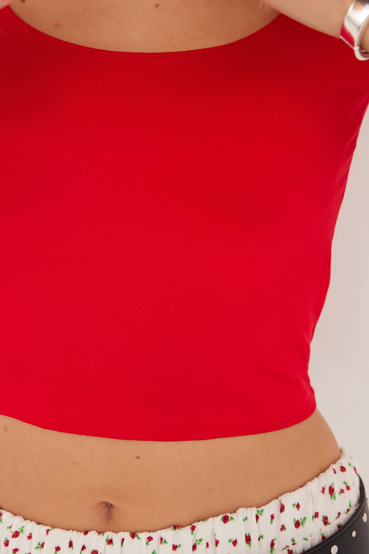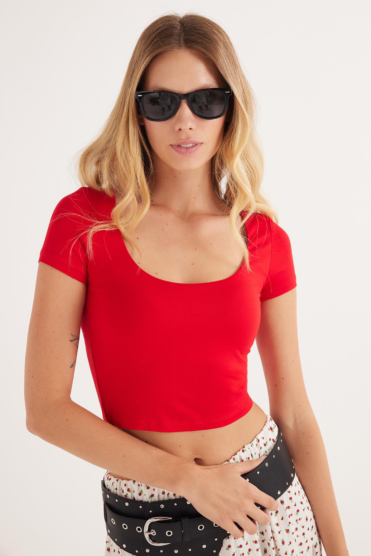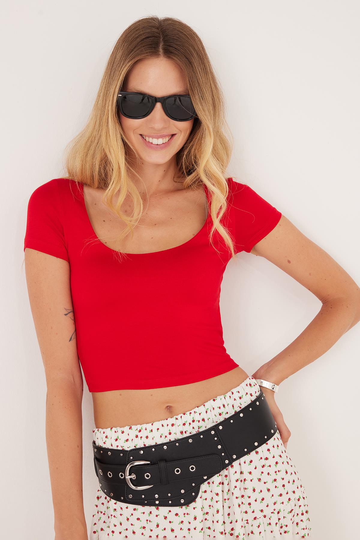 Kadın Slim Fit Dar Kesim Kısa Kollu U Yaka Kırmızı Bluz (KDN25178-06)