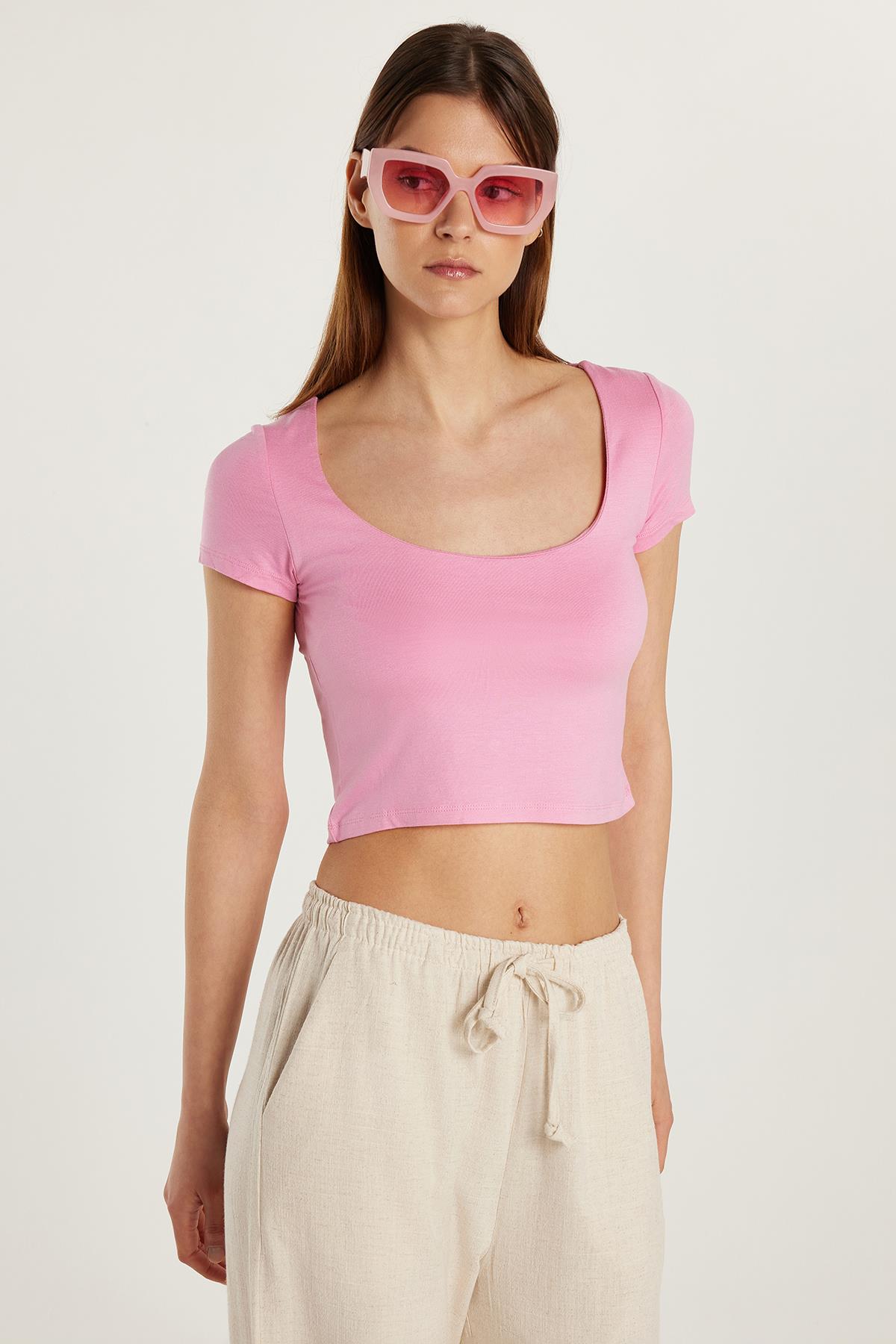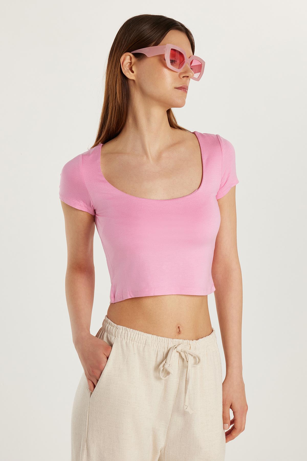 Kadın Slim Fit Dar Kesim Kısa Kollu U Yaka Pembe Bluz (KDN25178-15)