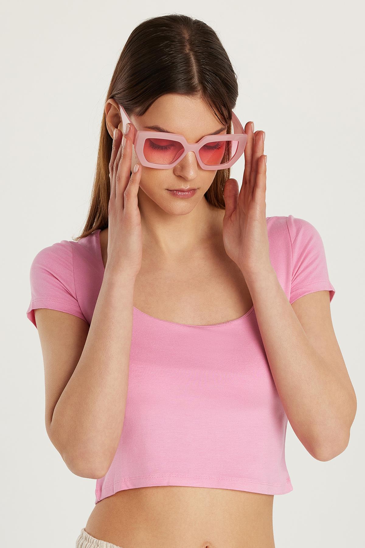 Kadın Slim Fit Dar Kesim Kısa Kollu U Yaka Pembe Bluz