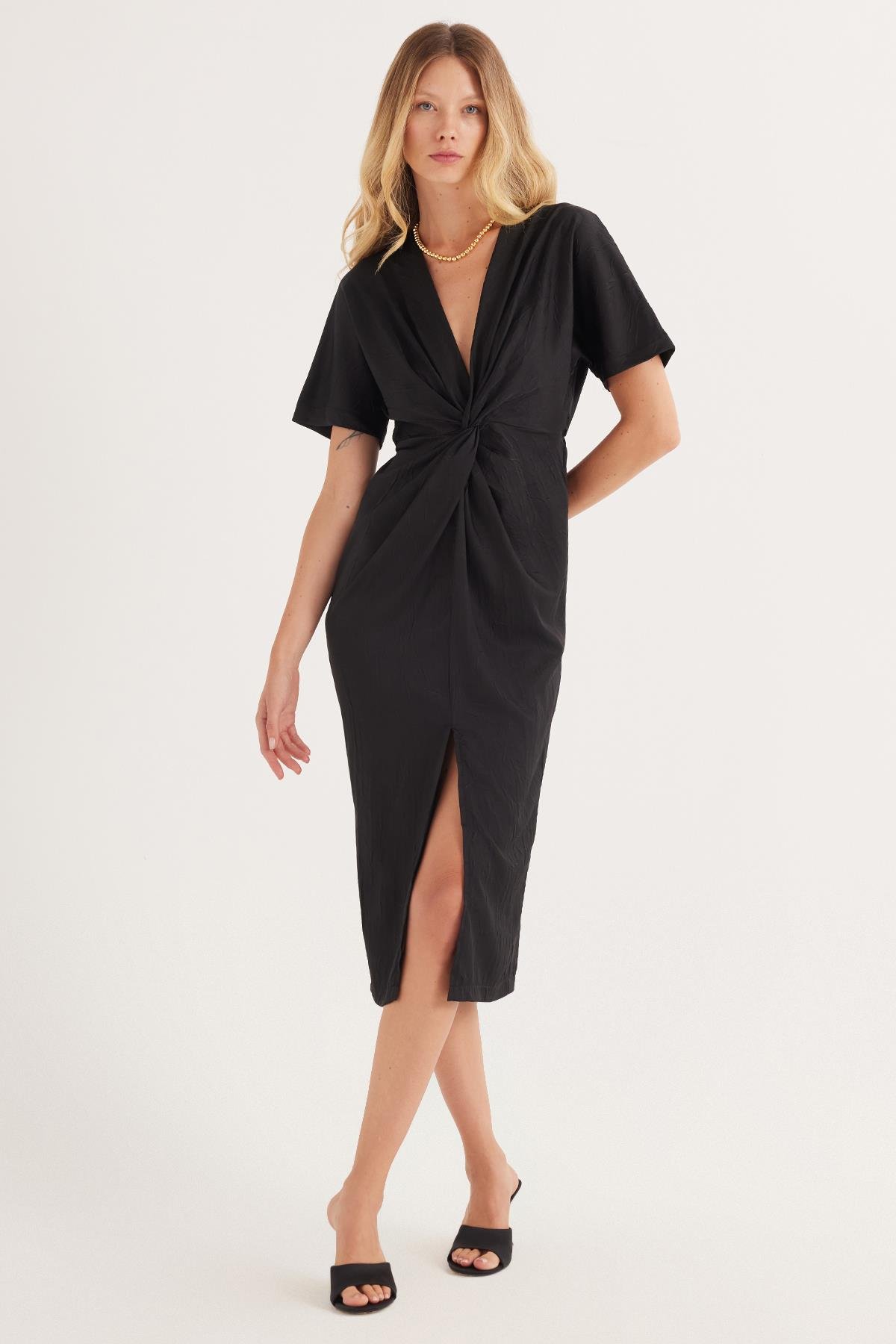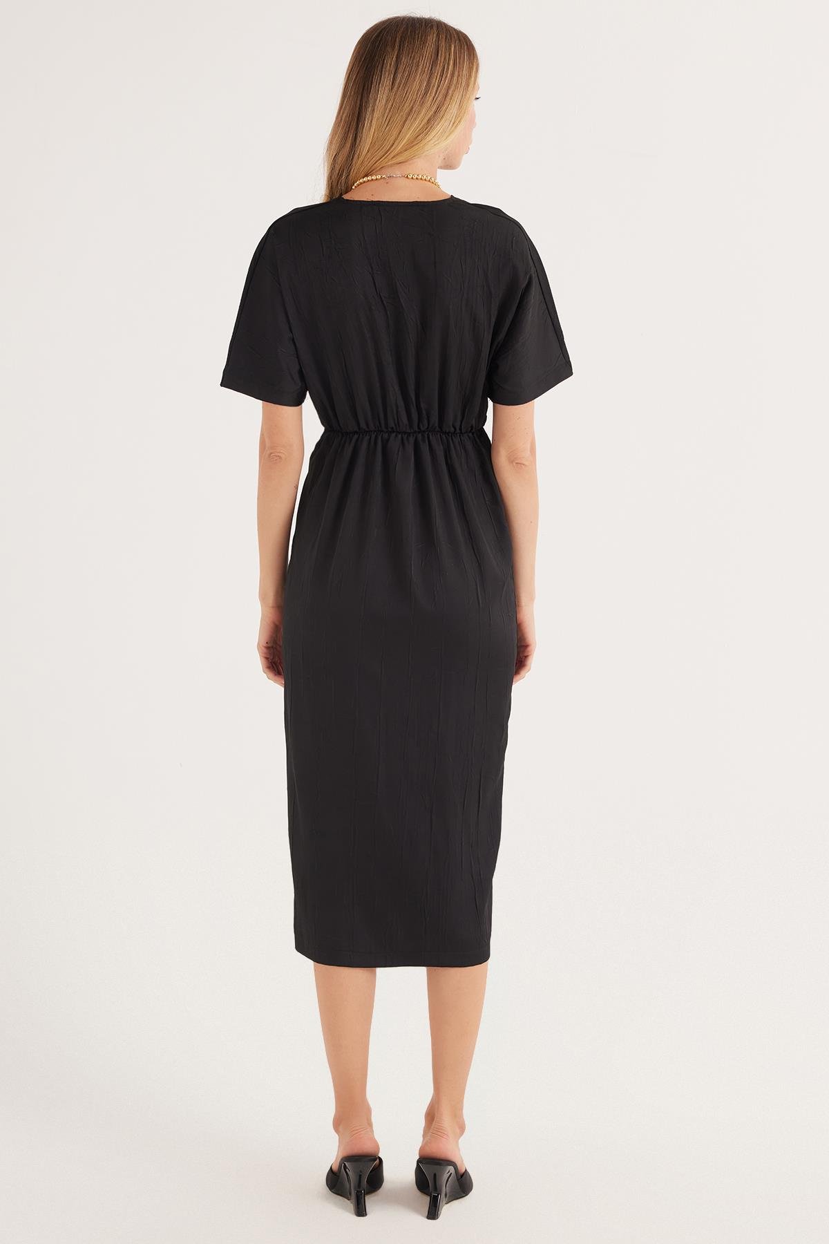 Kadın Slim Fit Dar Kesim Kısa Kollu V Yaka Siyah Elbise (KDN25216-02)