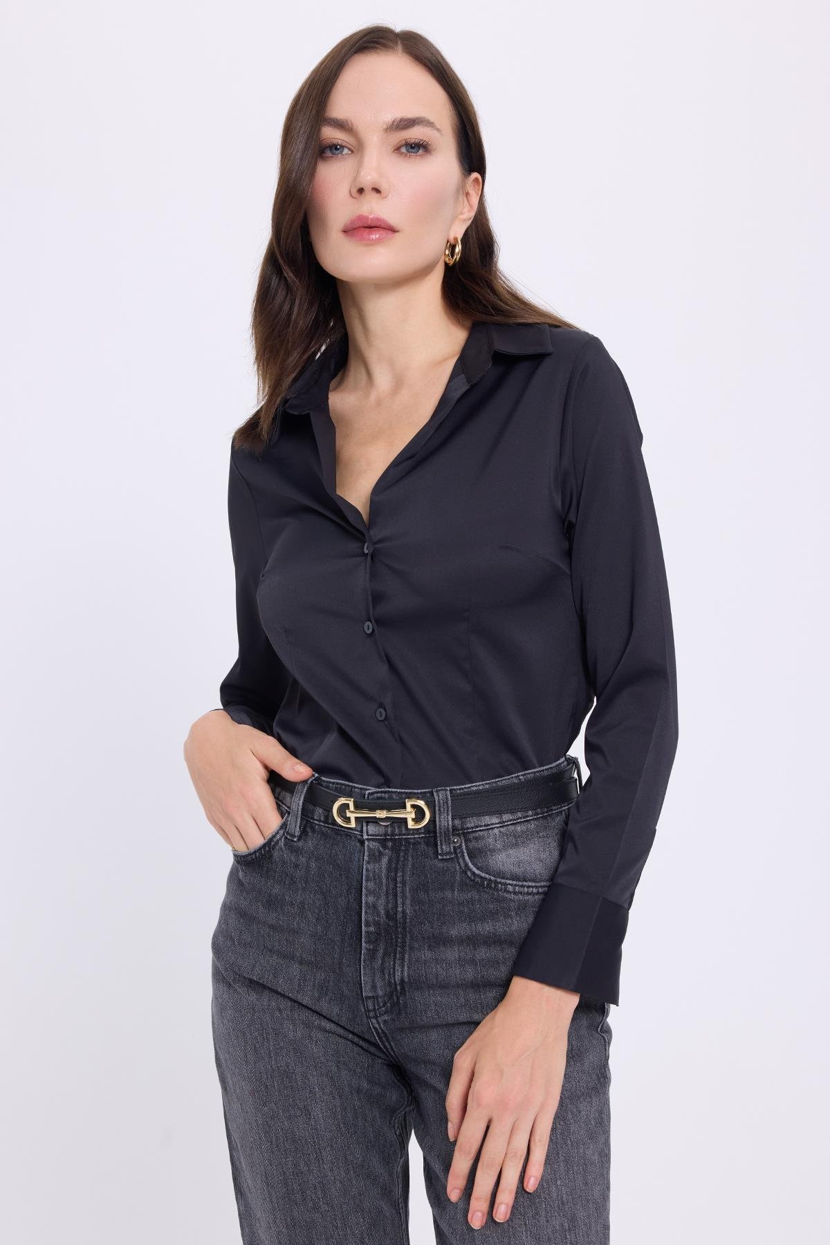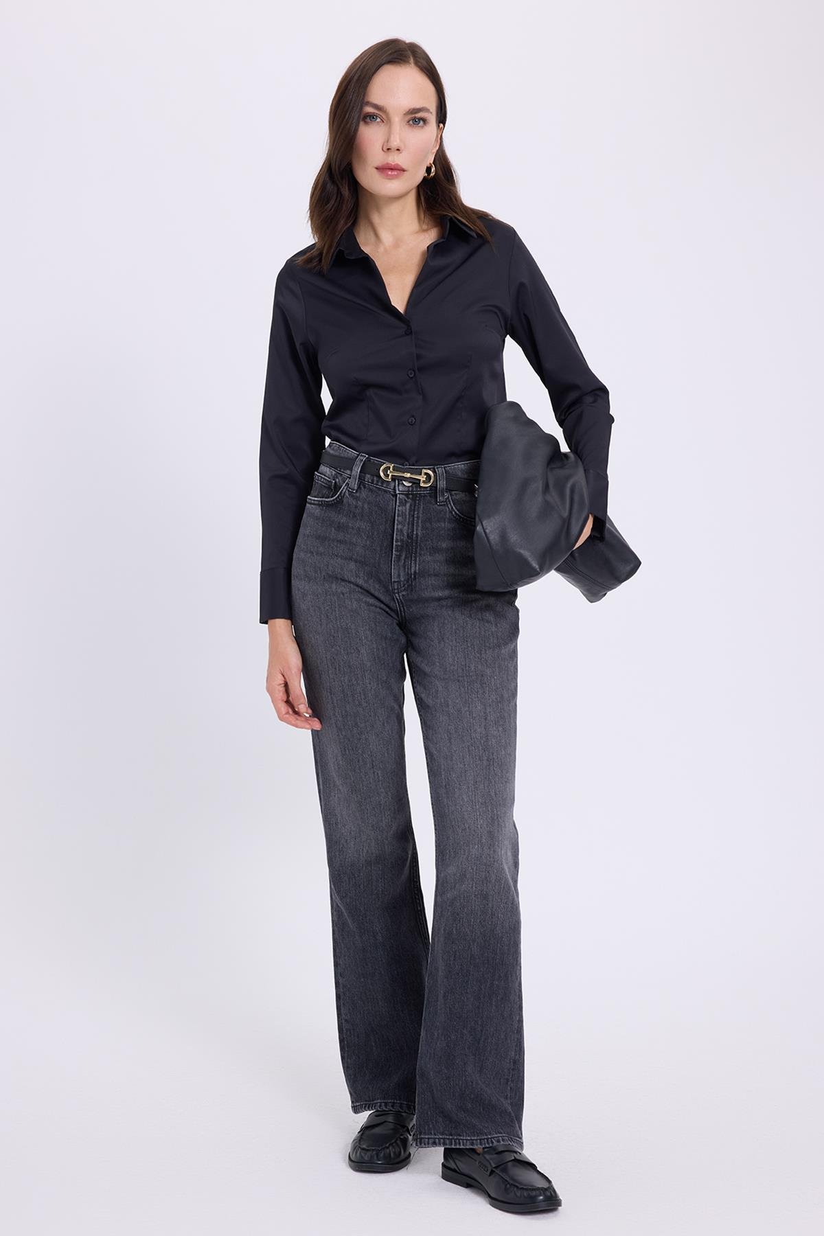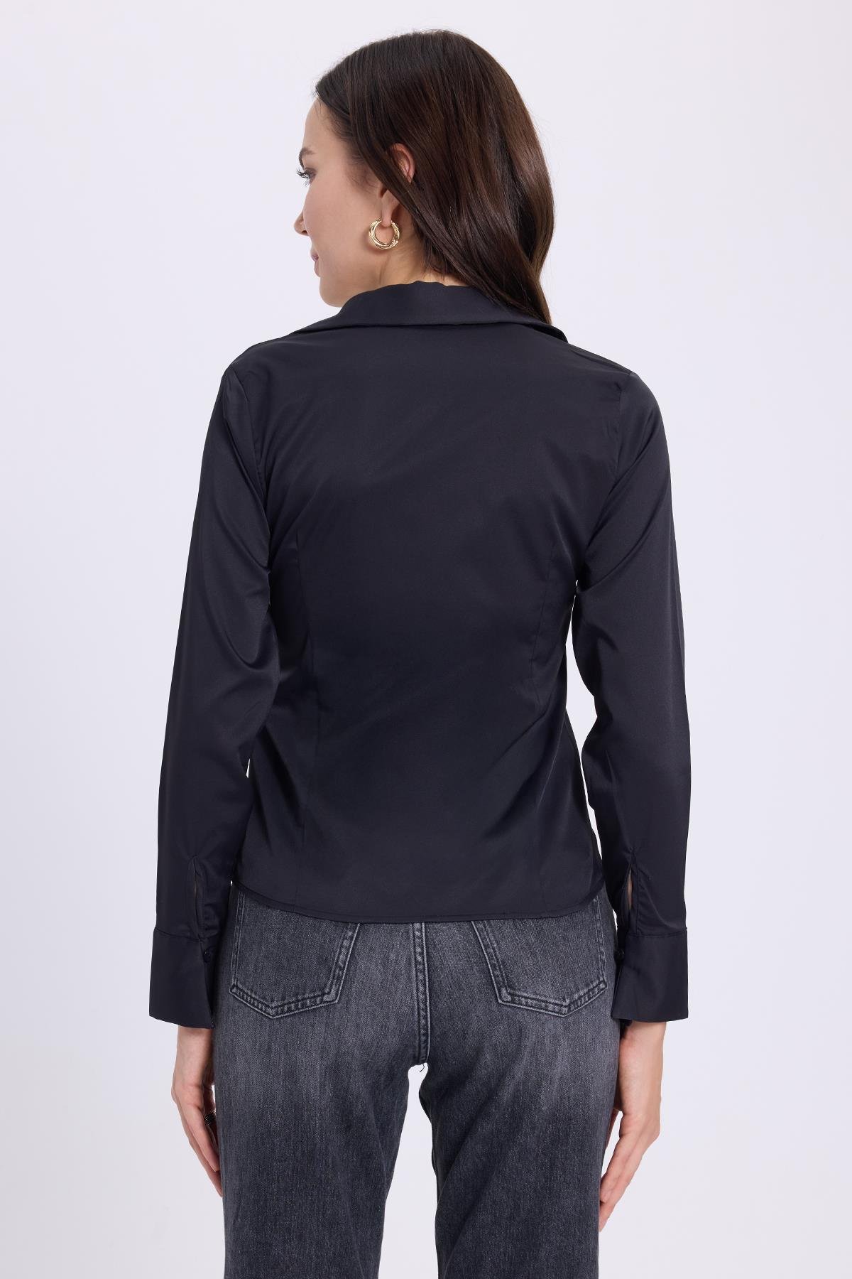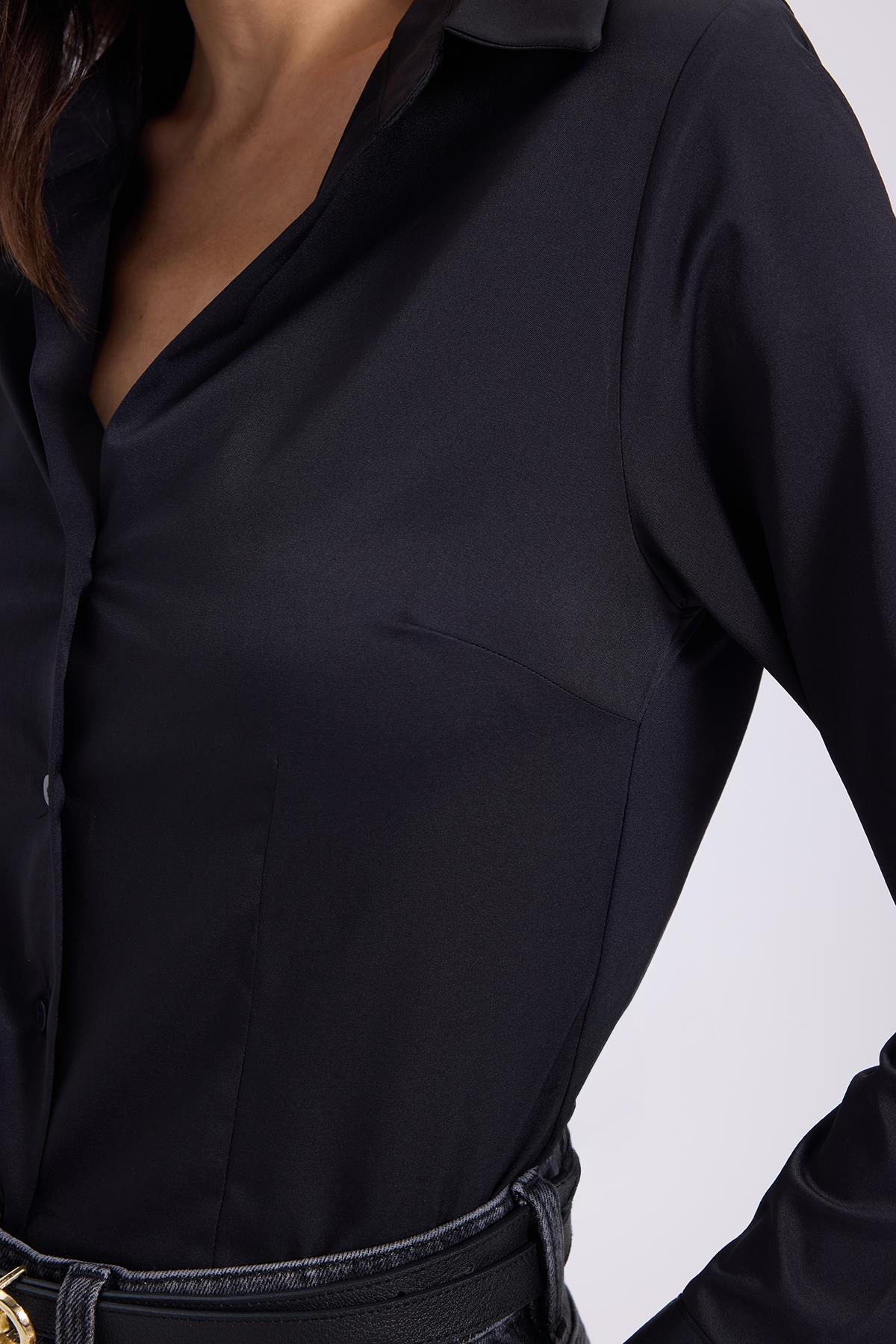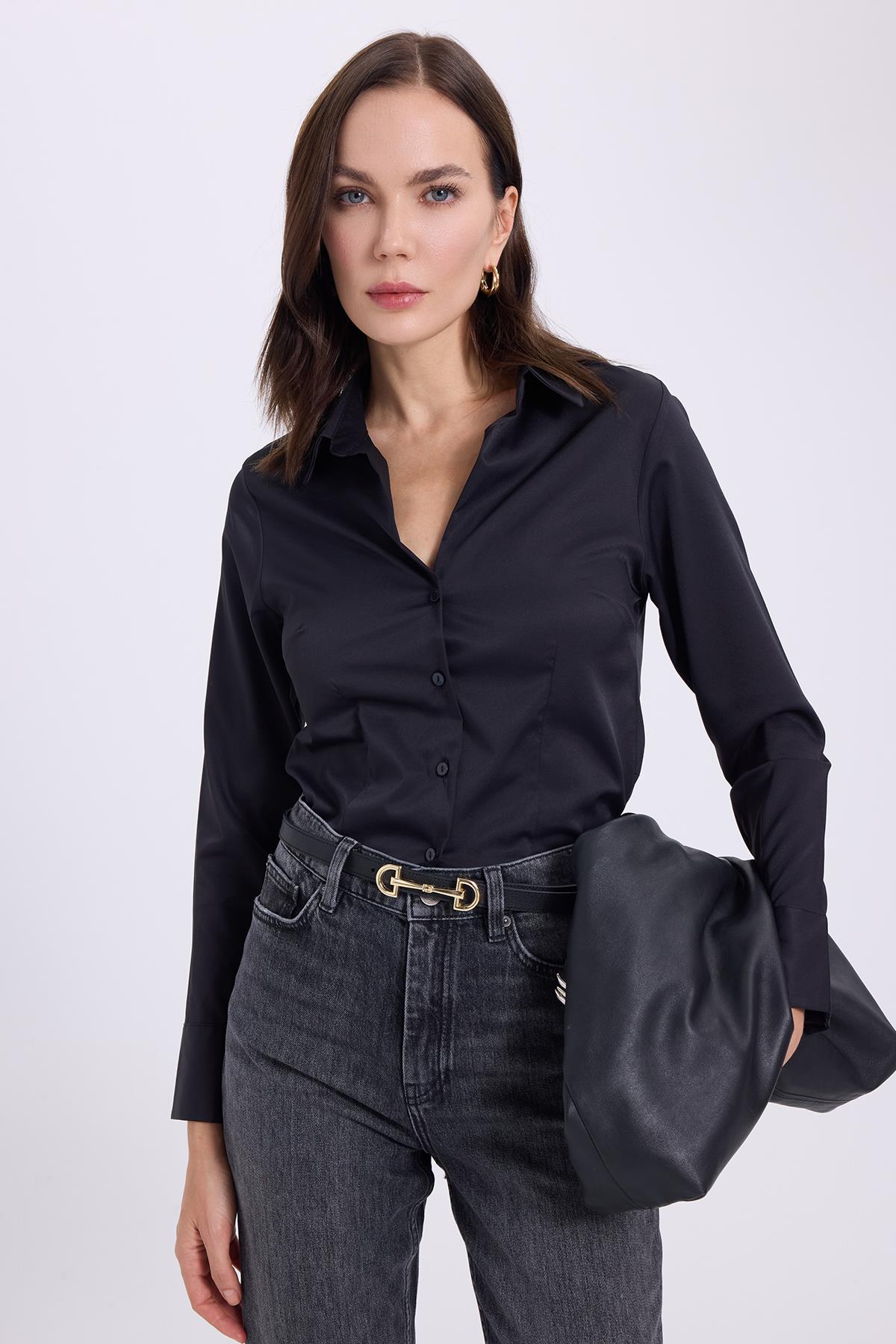 Kadın Slim Fit Dar Kesim Klasik Yaka Uzun Kollu Siyah Gömlek