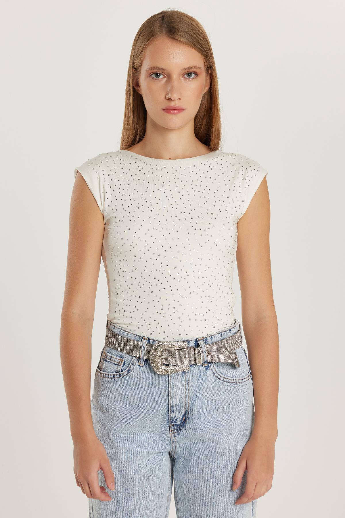 Kadın Slim Fit Dar Kesim Sırt Detaylı Bisiklet Yaka Ekru Tişört