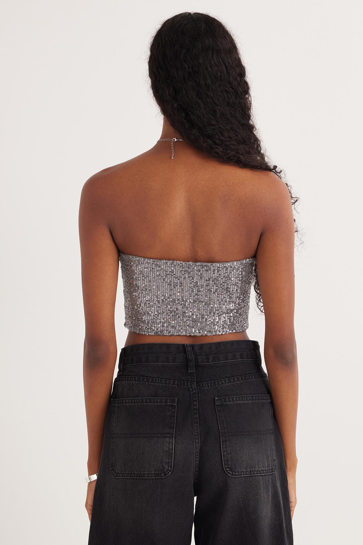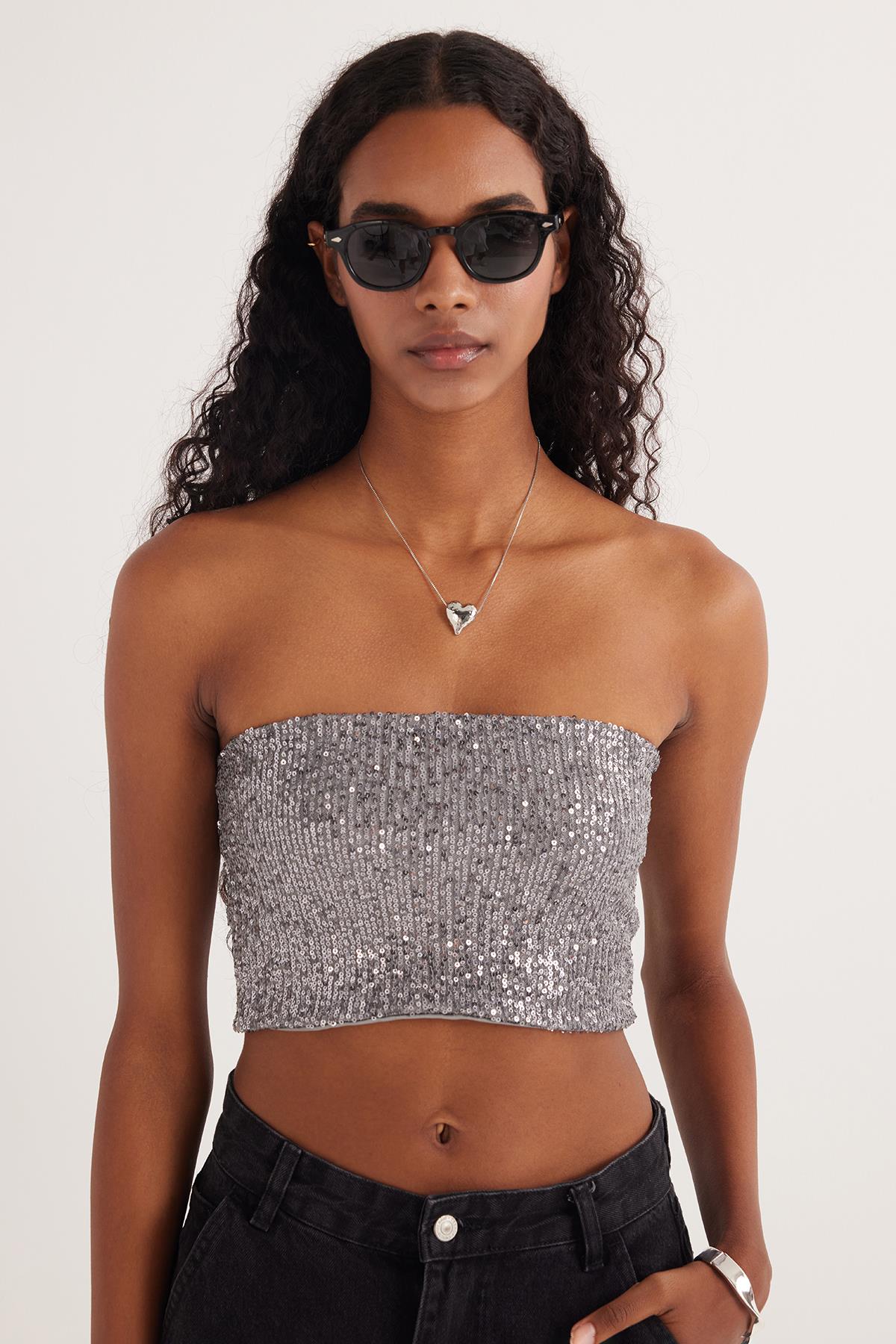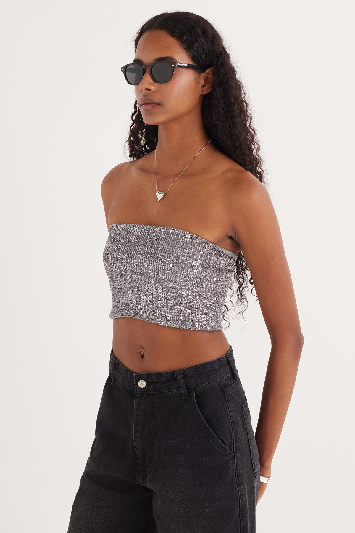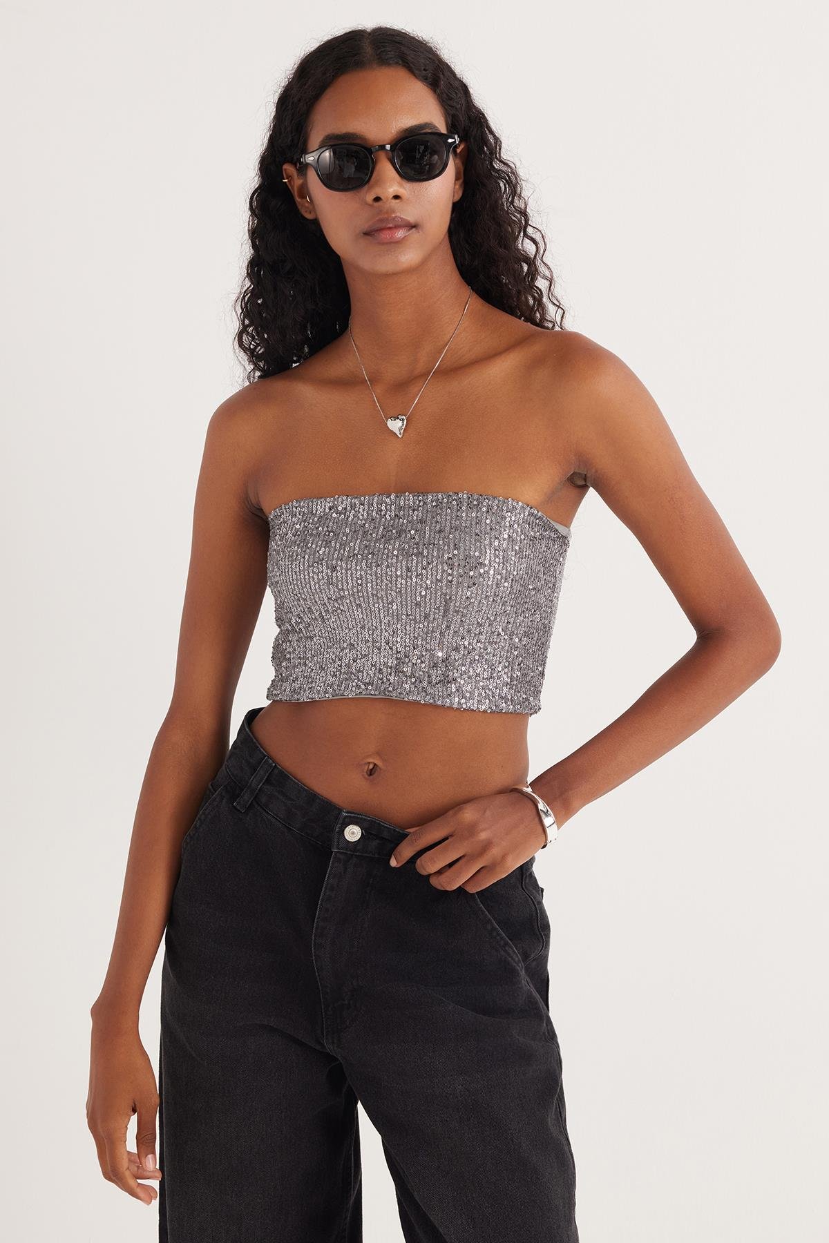 Kadın Slim Fit Dar Kesim Straplez Payetli Gri Bluz (KDN25191-11)