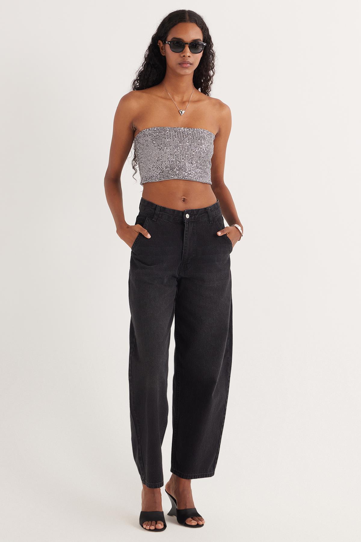 Kadın Slim Fit Dar Kesim Straplez Payetli Gri Bluz