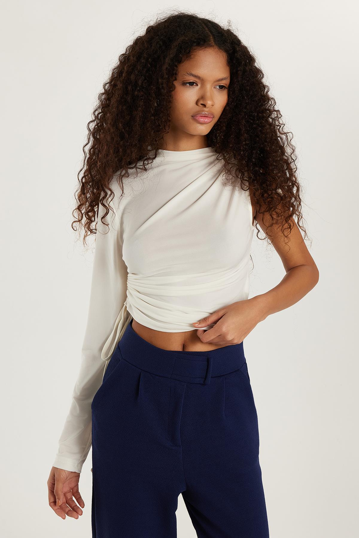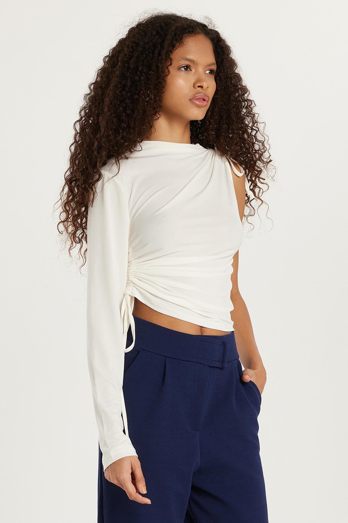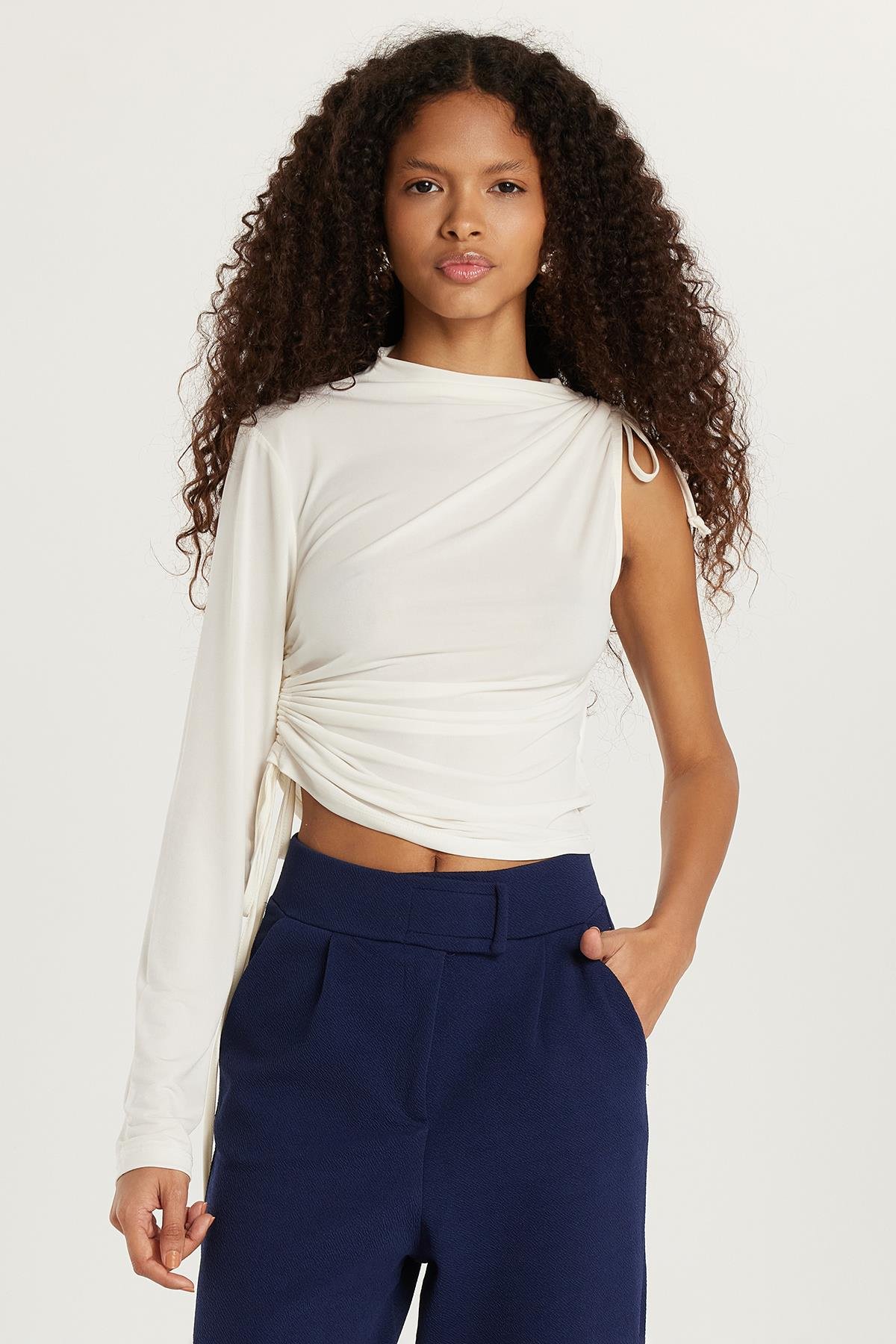 Kadın Slim Fit Dar Kesim Tek Kollu Yandan Bağcık Detaylı Ekru Bluz