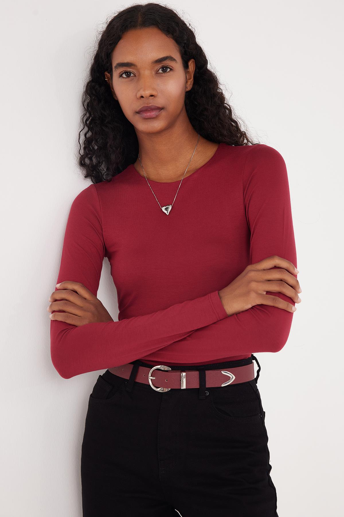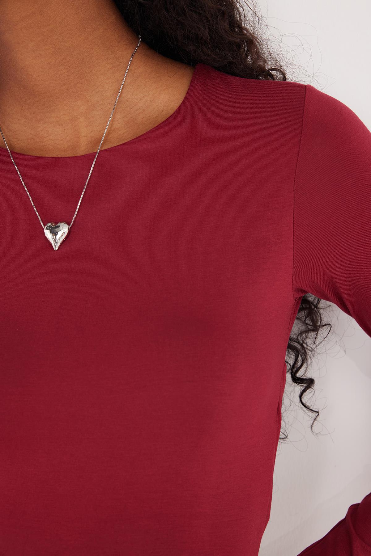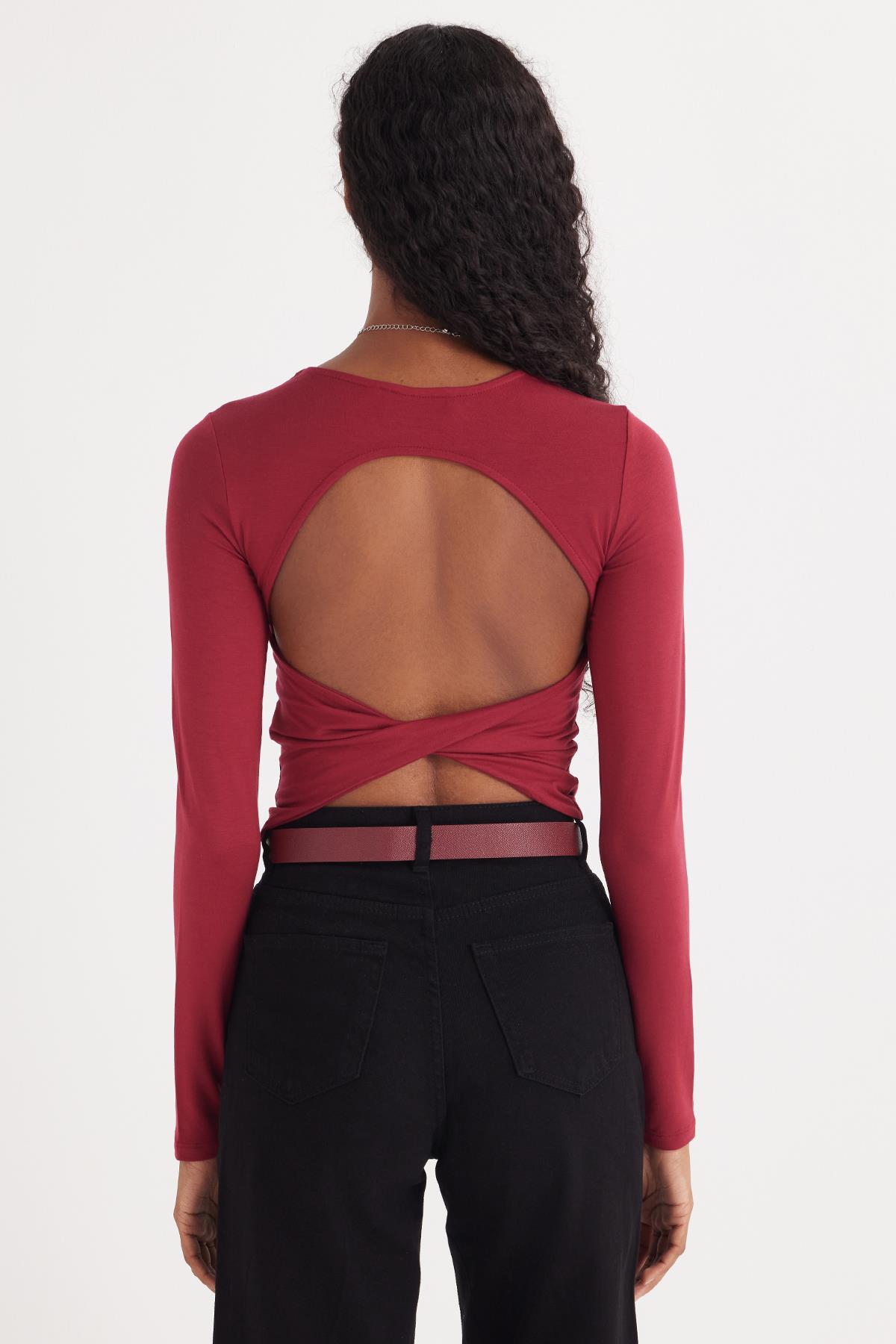 Kadın Slim Fit Dar Kesim Uzun Kollu Bisiklet Yaka Sırt Detaylı Bordo Viskon Bluz