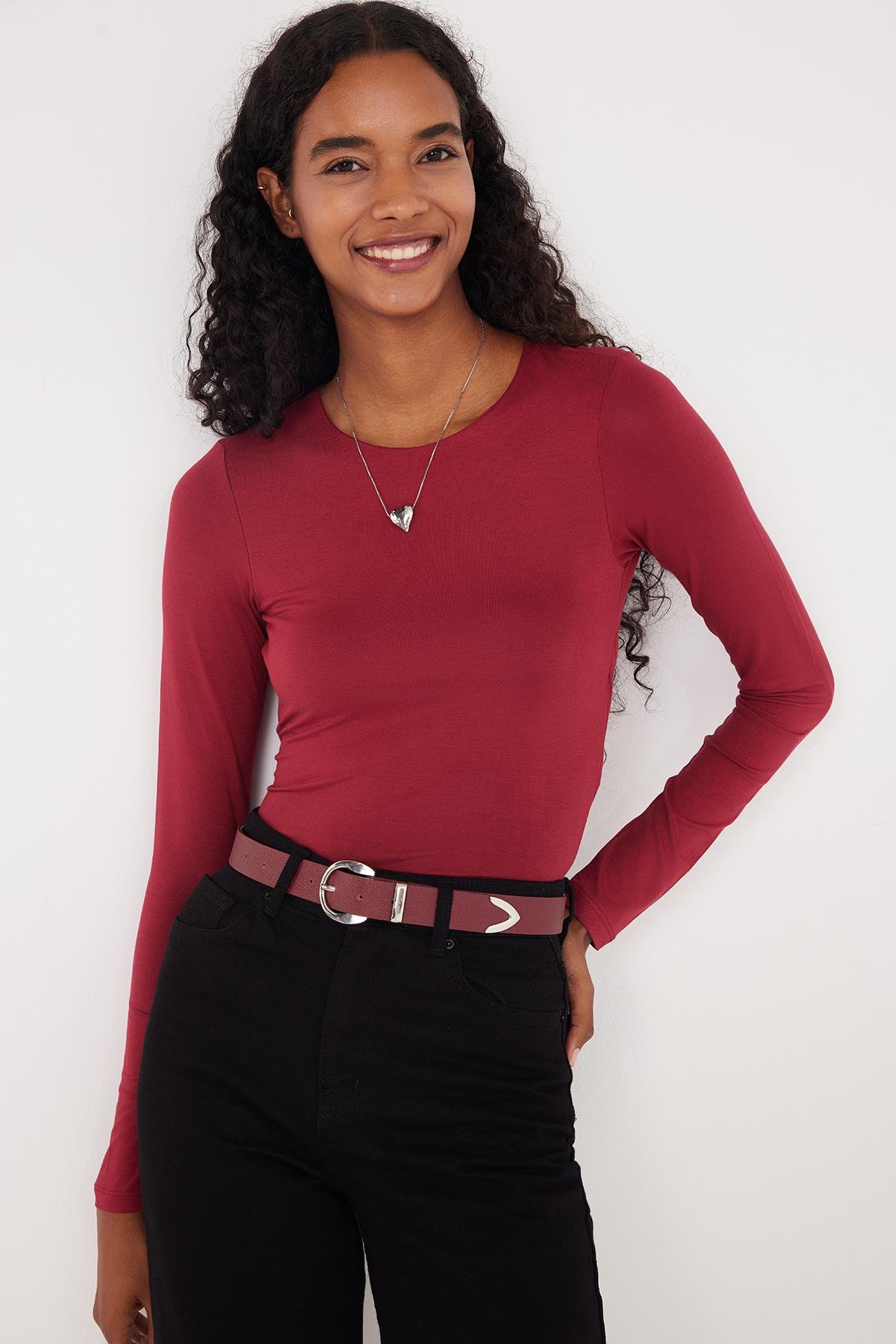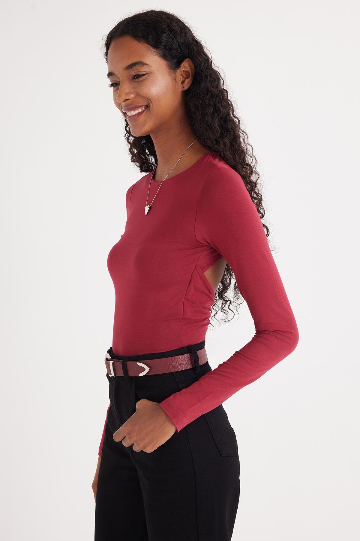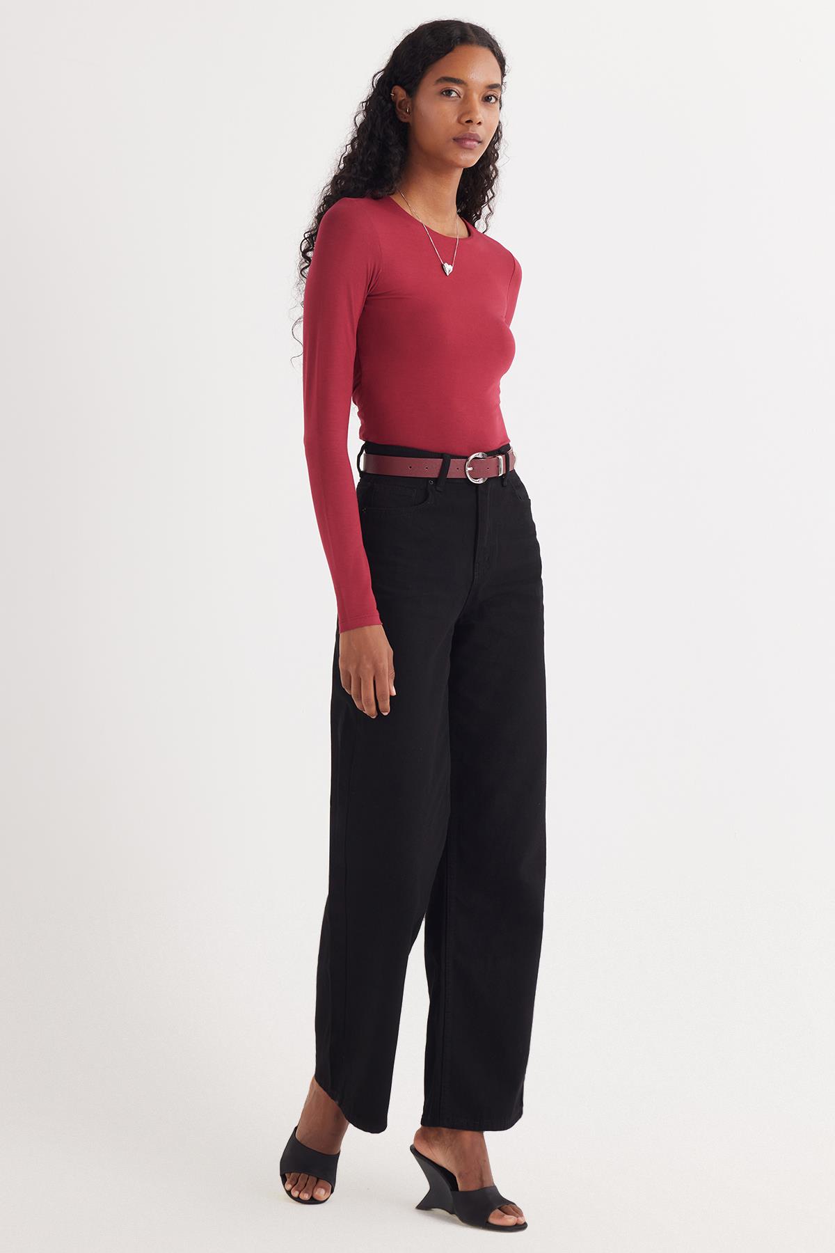 Kadın Slim Fit Dar Kesim Uzun Kollu Bisiklet Yaka Sırt Detaylı Bordo Viskon Bluz