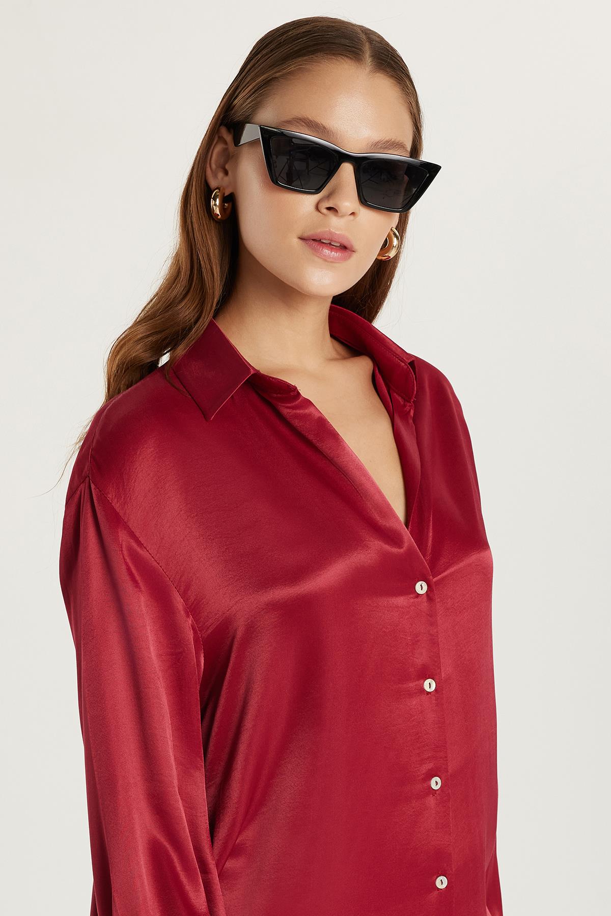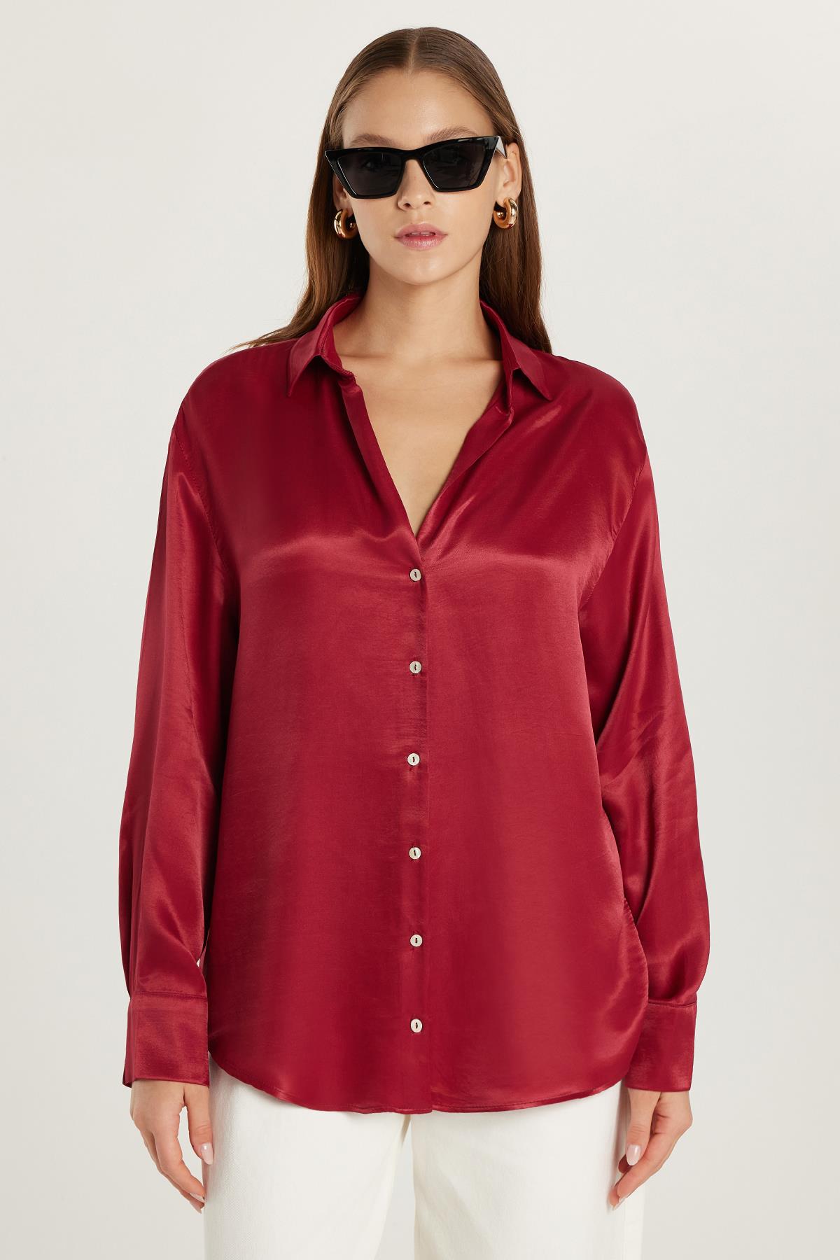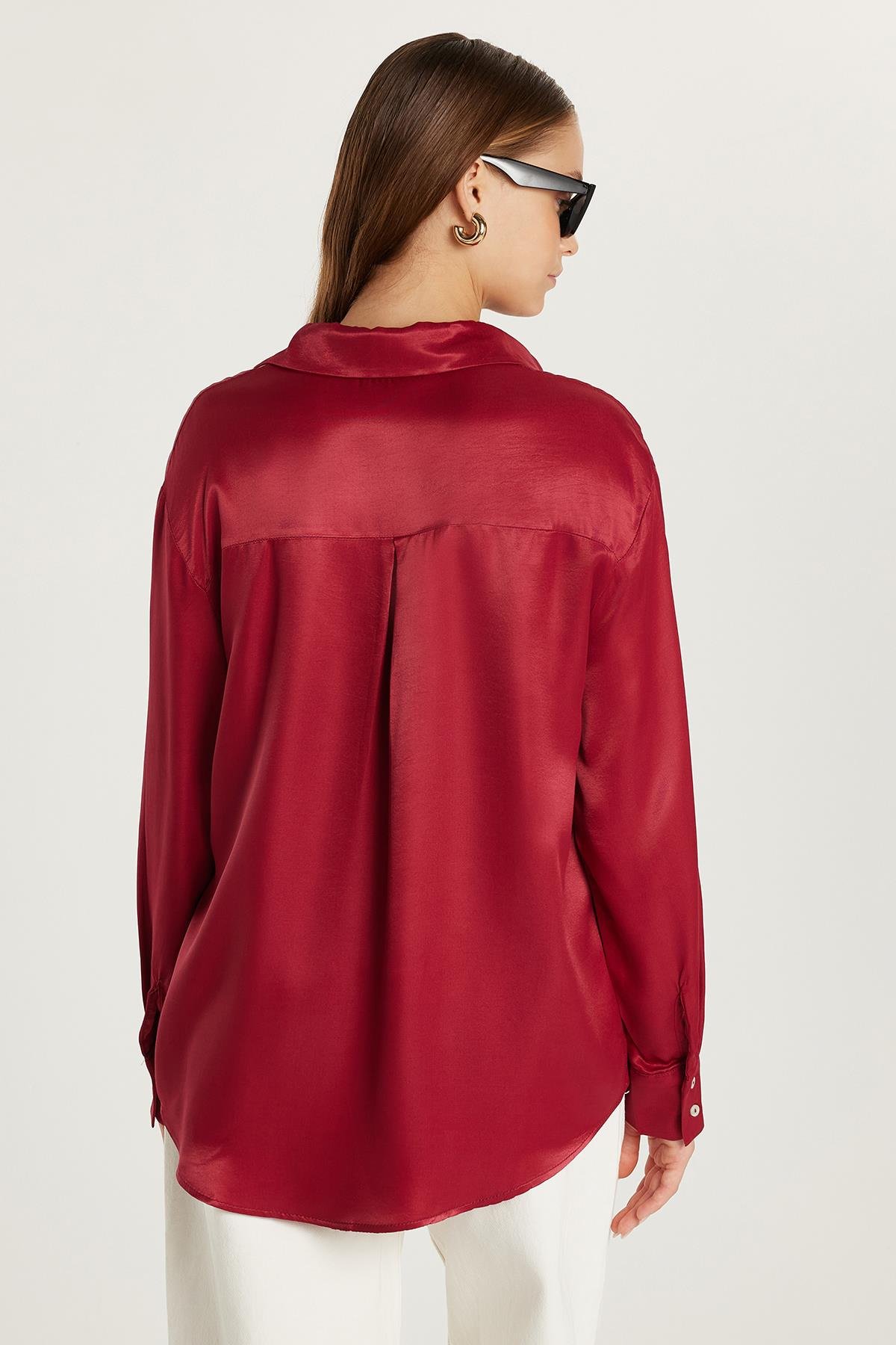 Kadın Slim Fit Dar Kesim Uzun Kollu Saten Bordo Gömlek (KDN25007-8)