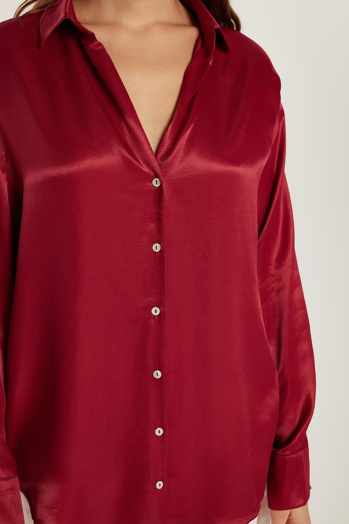 Kadın Slim Fit Dar Kesim Uzun Kollu Saten Bordo Gömlek