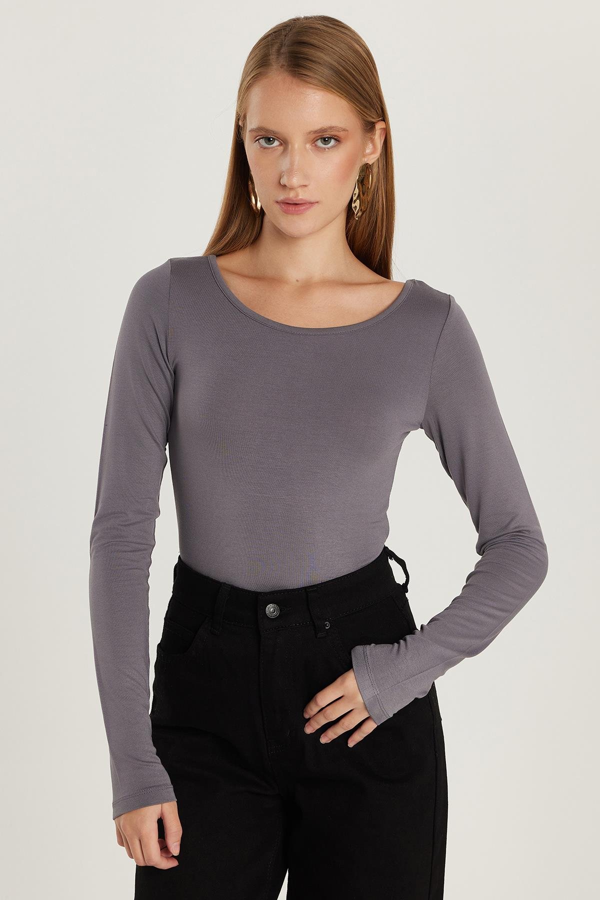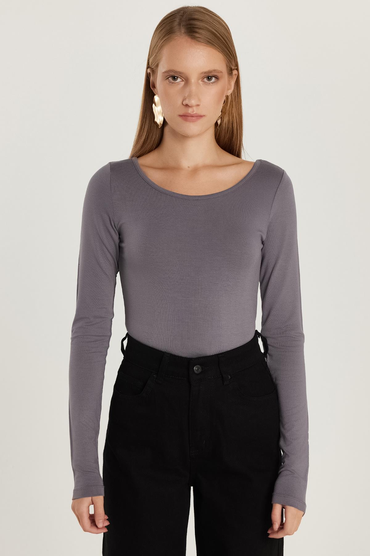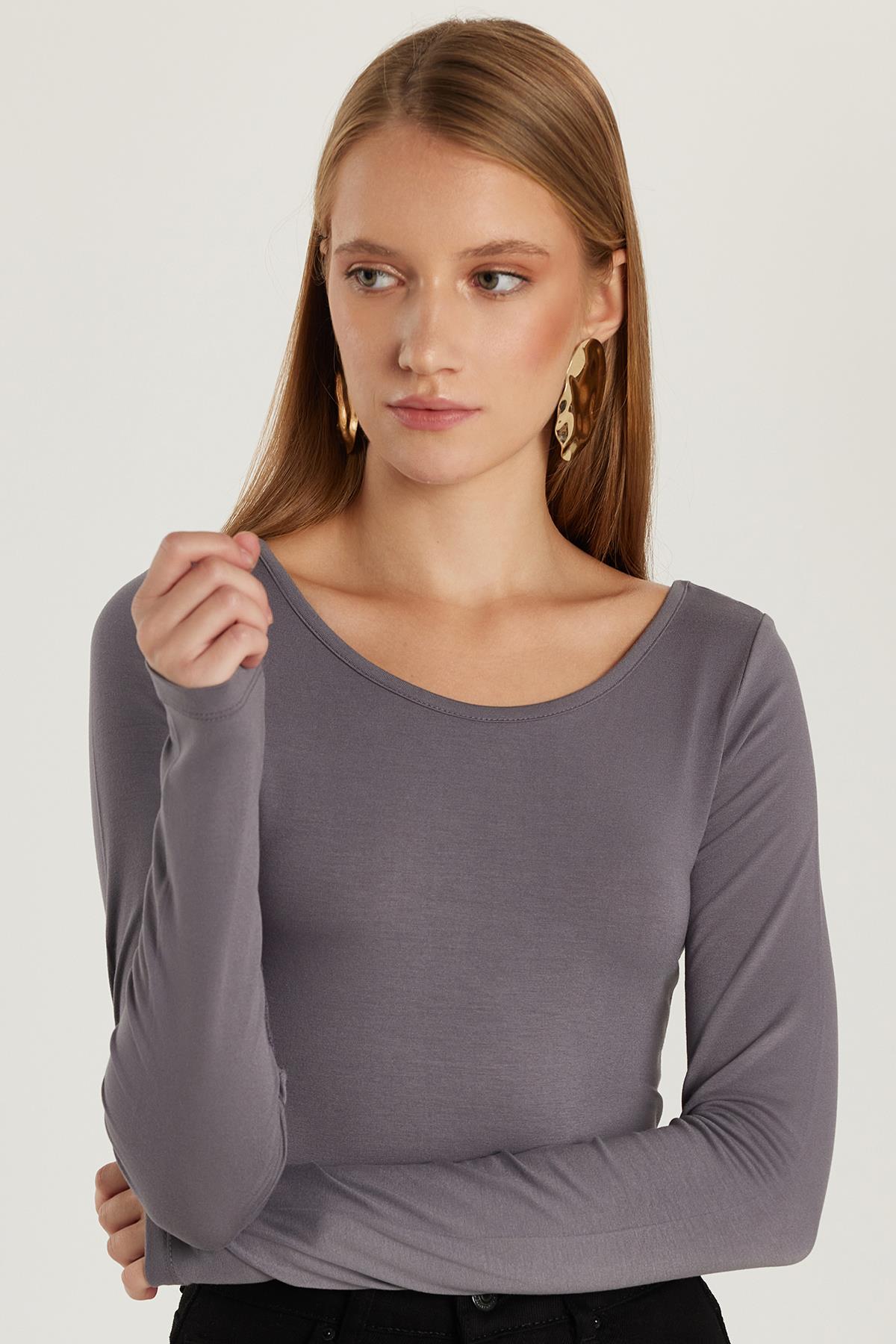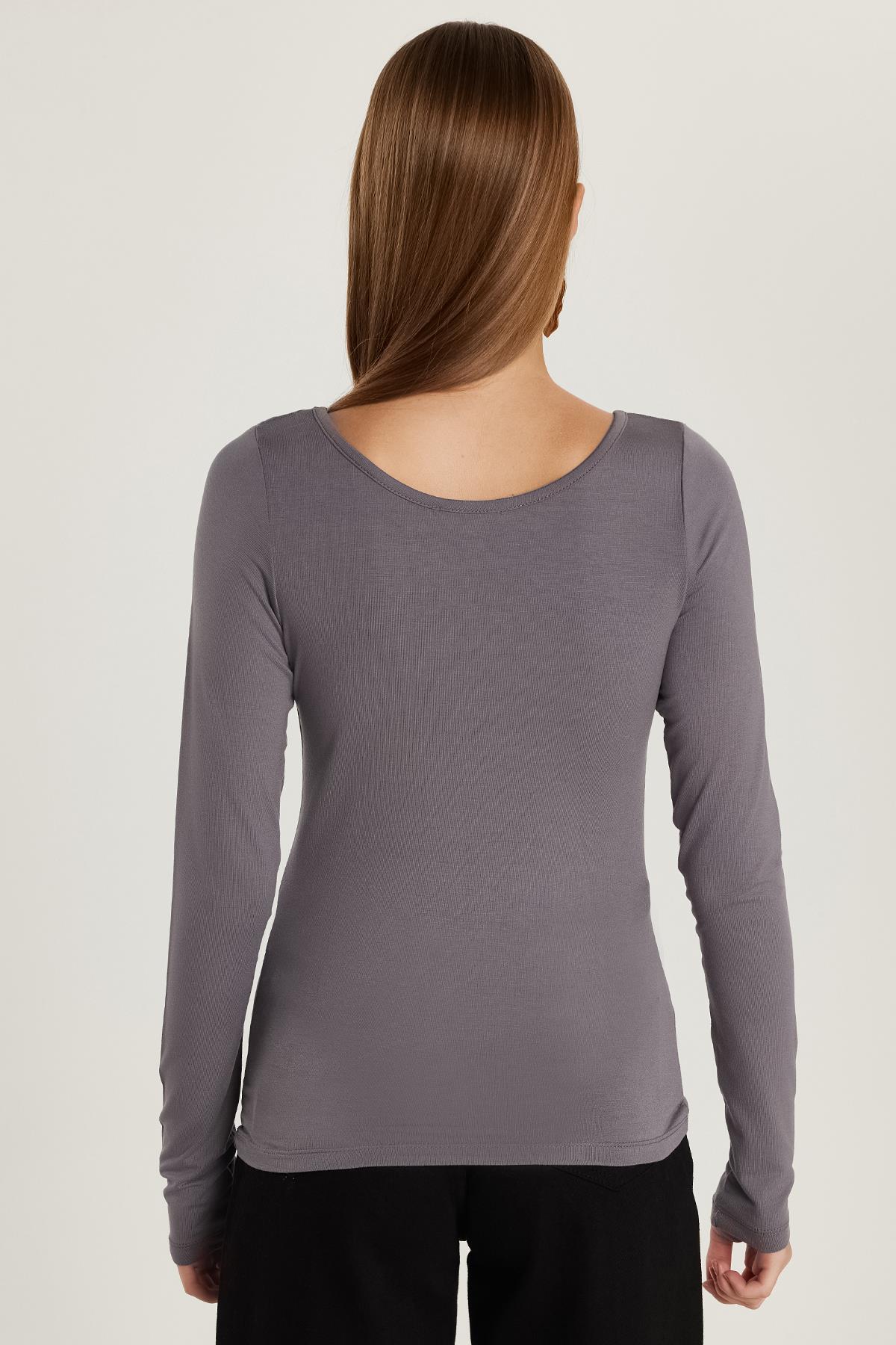 Kadın Slim Fit Dar Kesim Uzun Kollu Viskon Gri Bluz