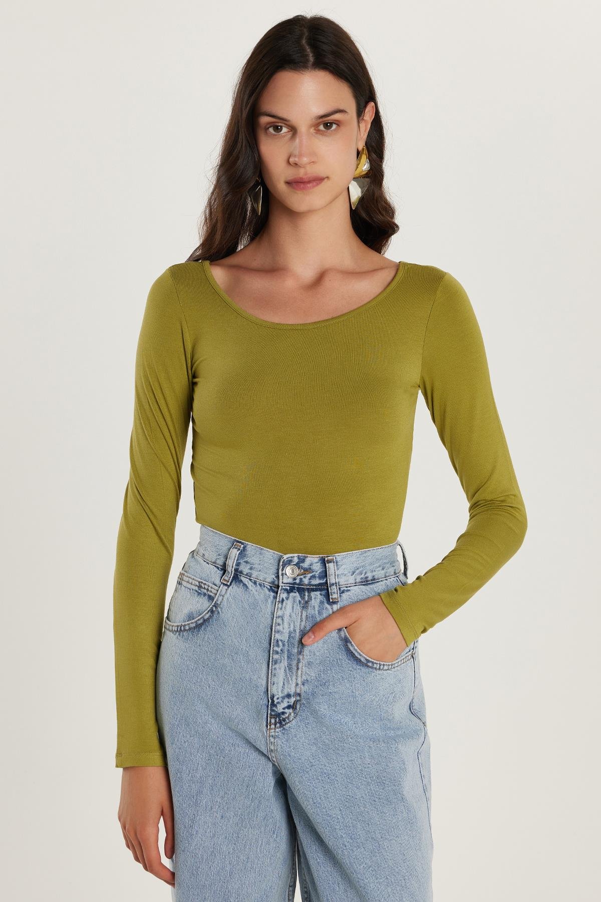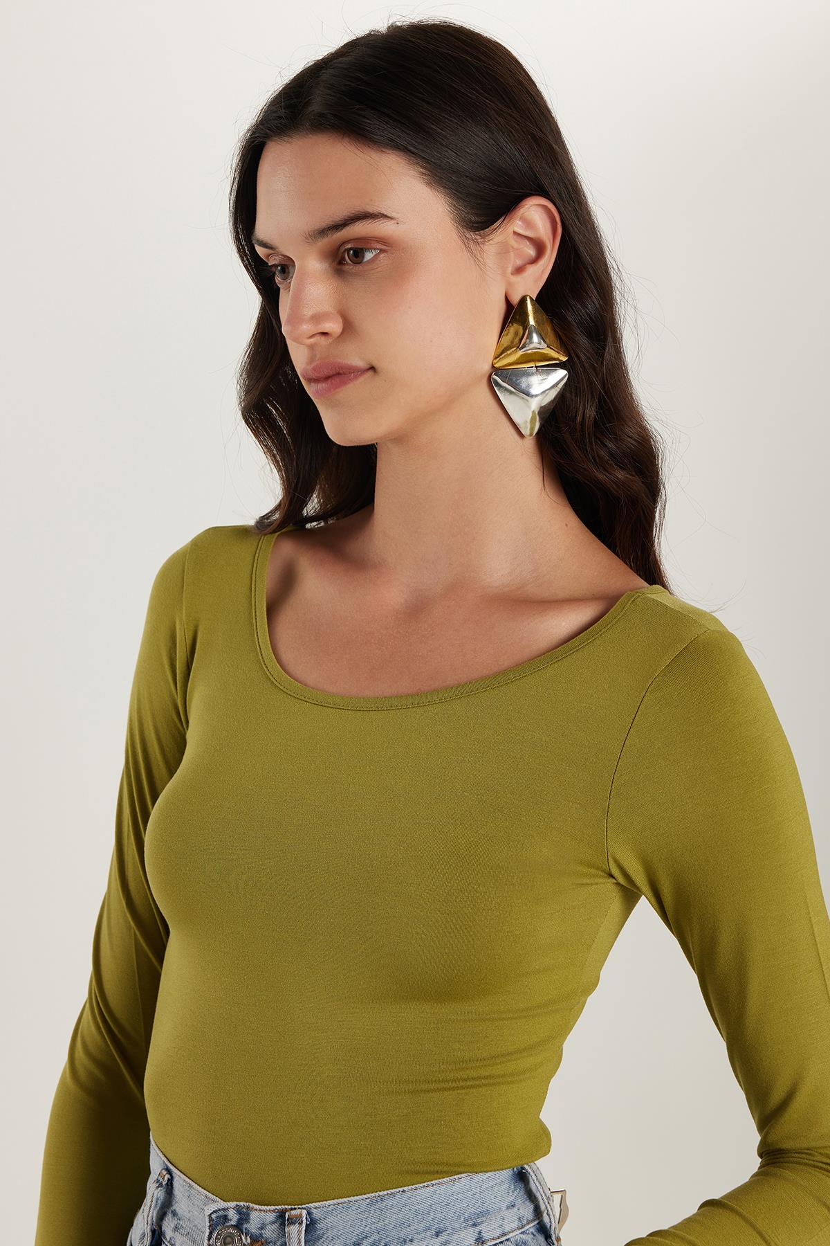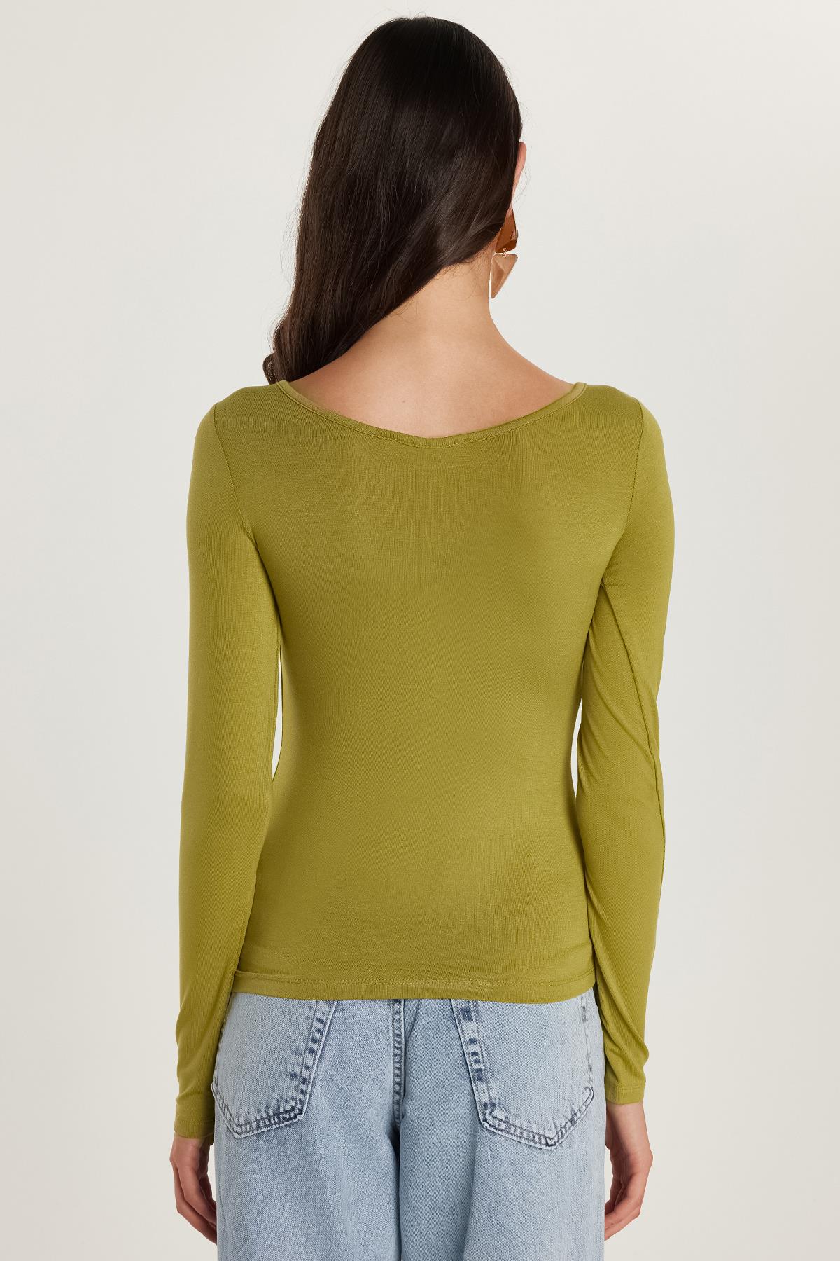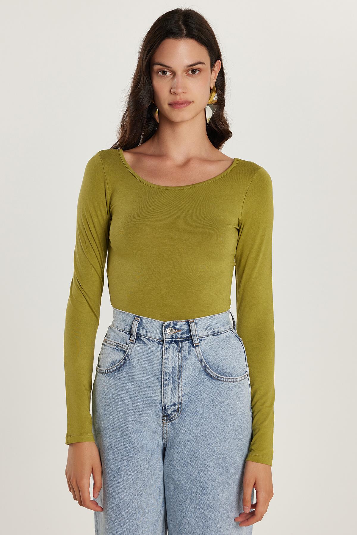 Kadın Slim Fit Dar Kesim Uzun Kollu Viskon Yeşil Bluz