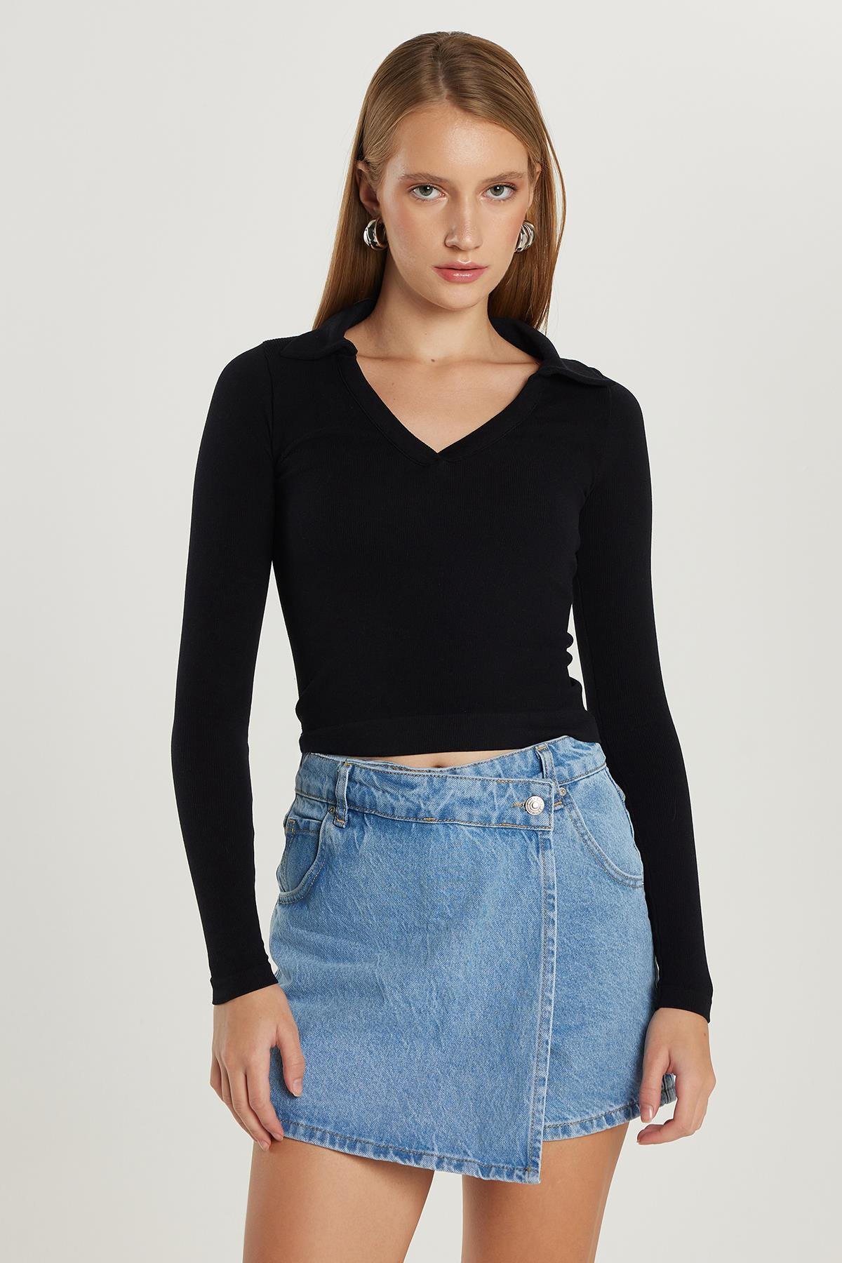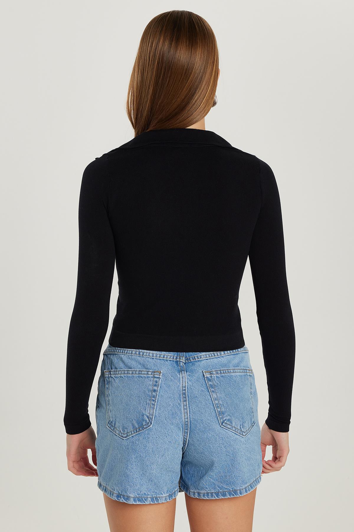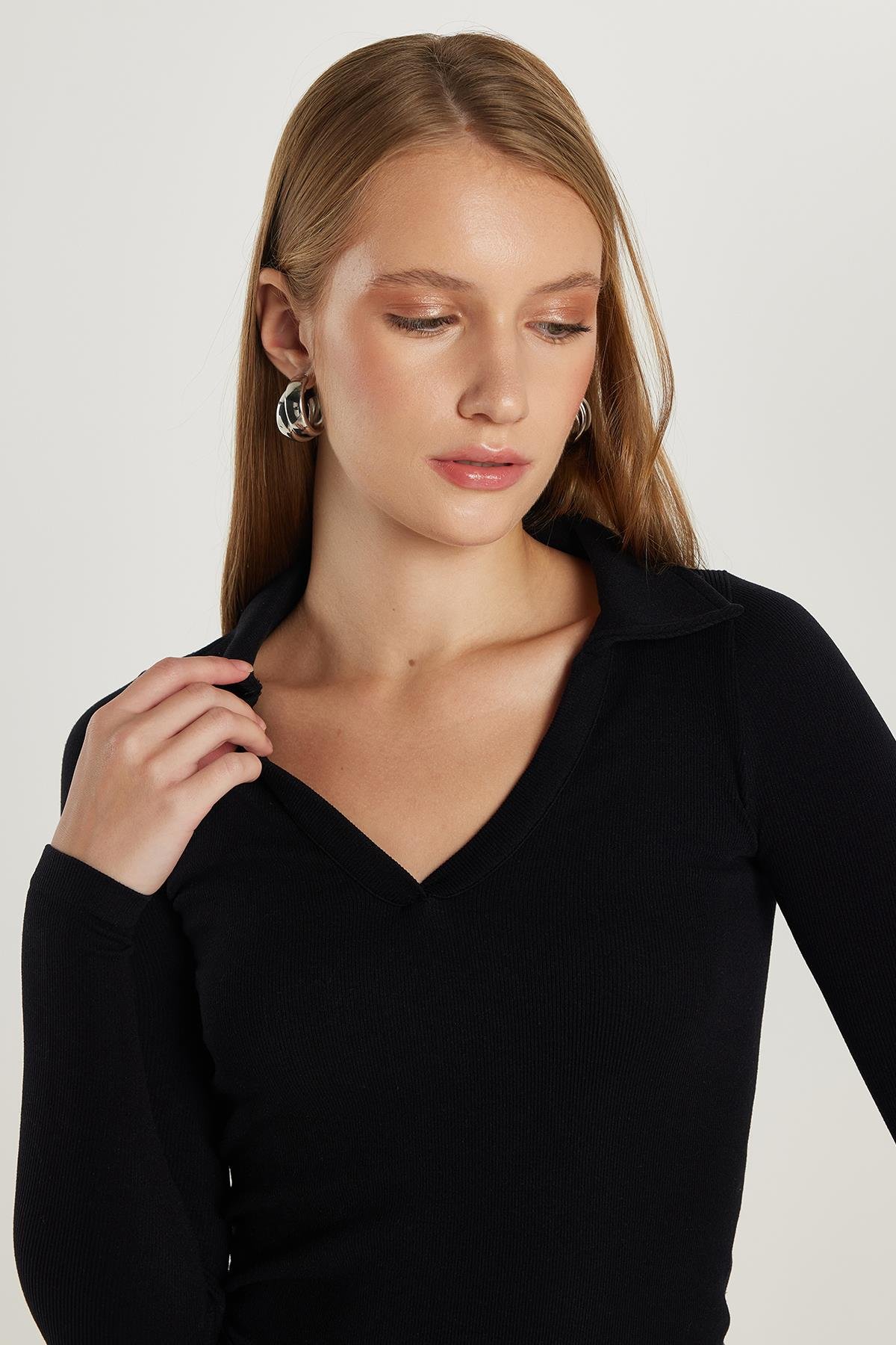 Kadın Slim Fit Dar Kesim V Yaka Siyah Bluz (KDN25259-02)