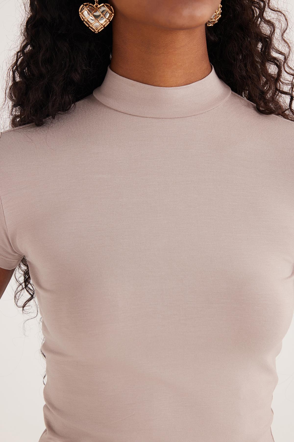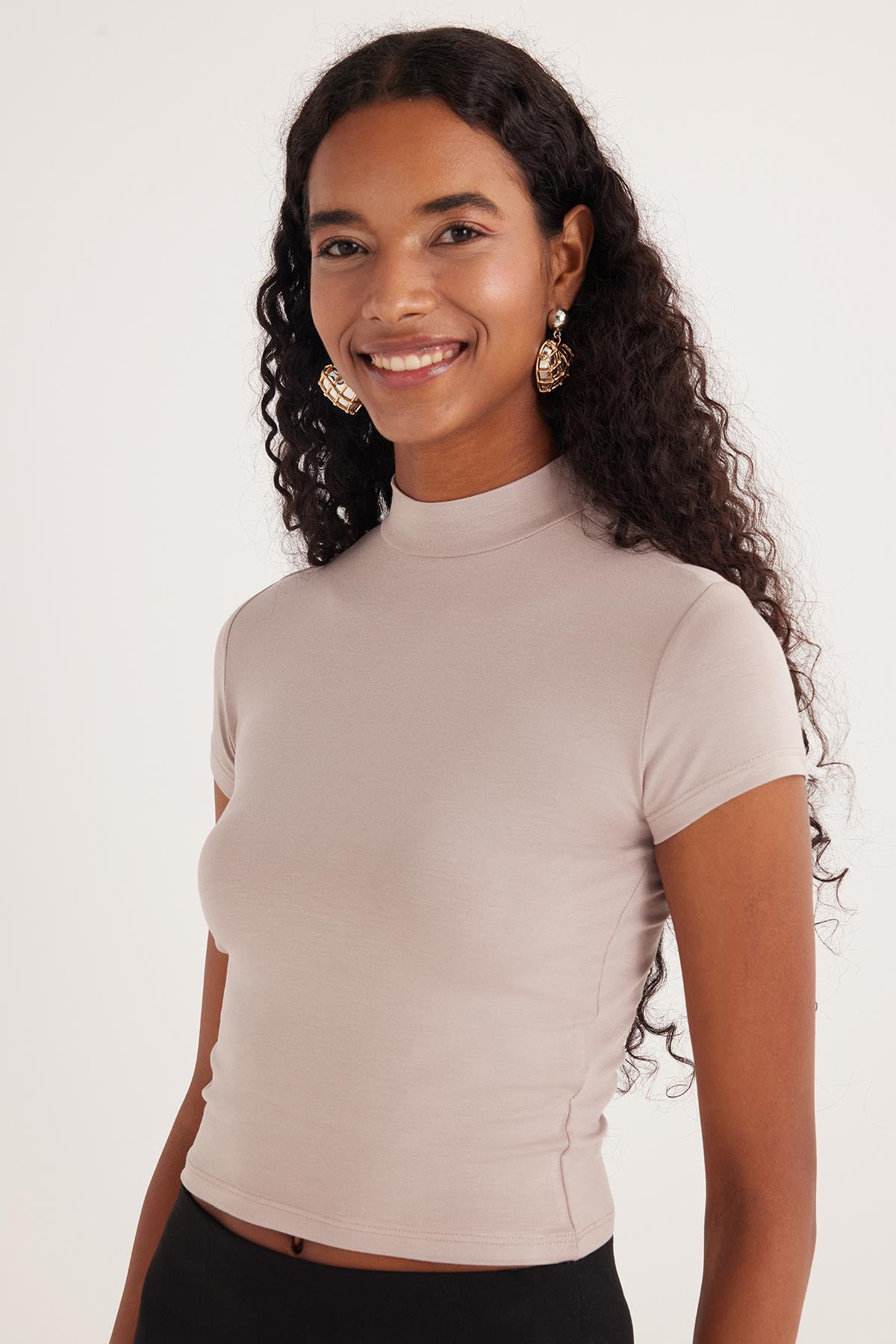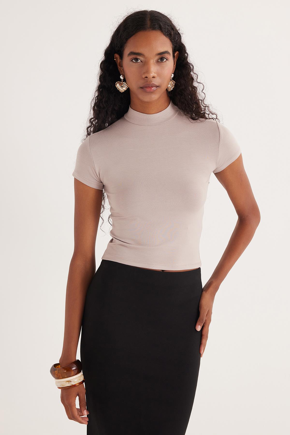 Kadın Slim Fit Dar Kesim Viskon Kumaş Yarım Balıkçı Yaka Vizon Bluz (KDN25070-MNK)