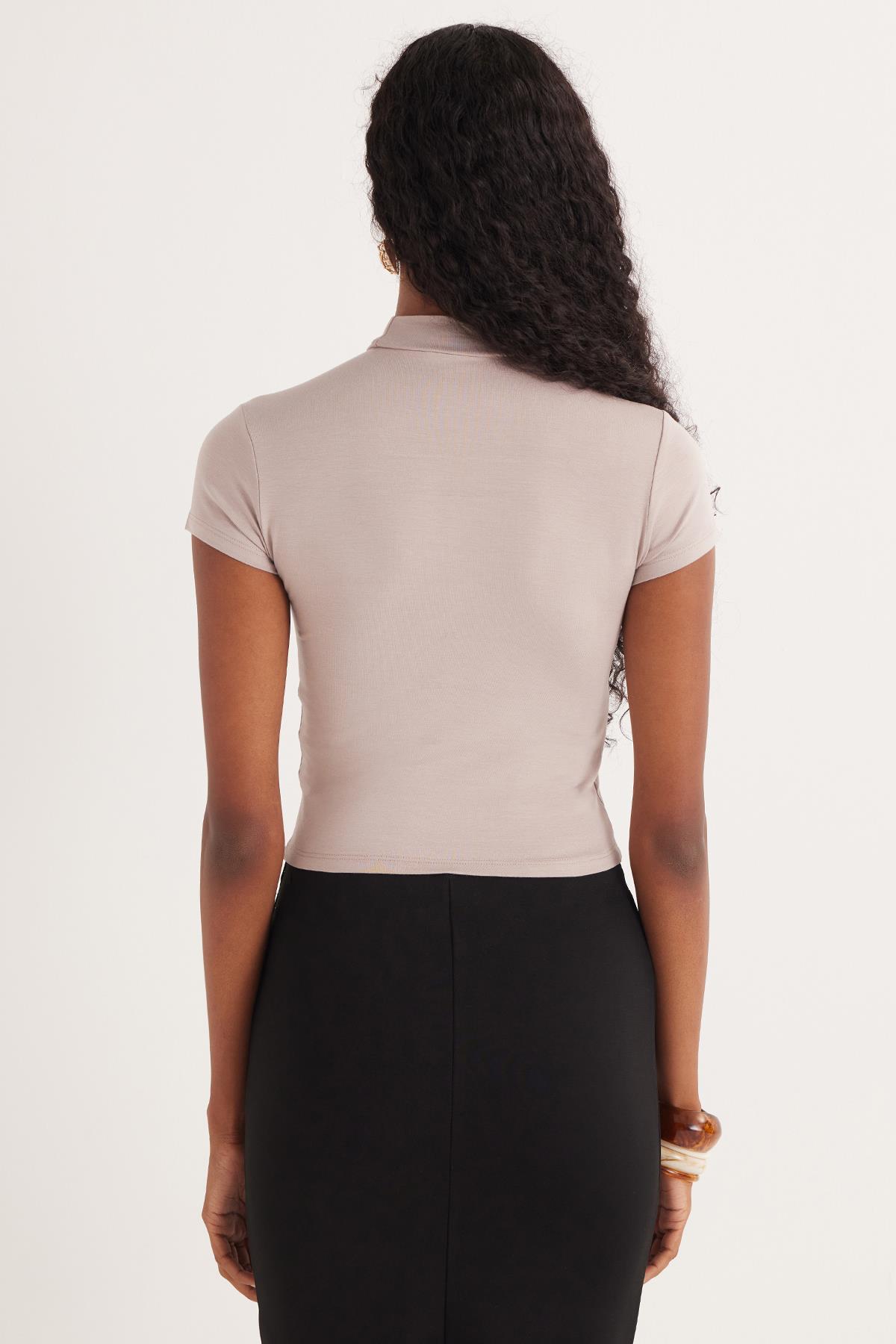 Kadın Slim Fit Dar Kesim Viskon Kumaş Yarım Balıkçı Yaka Vizon Bluz