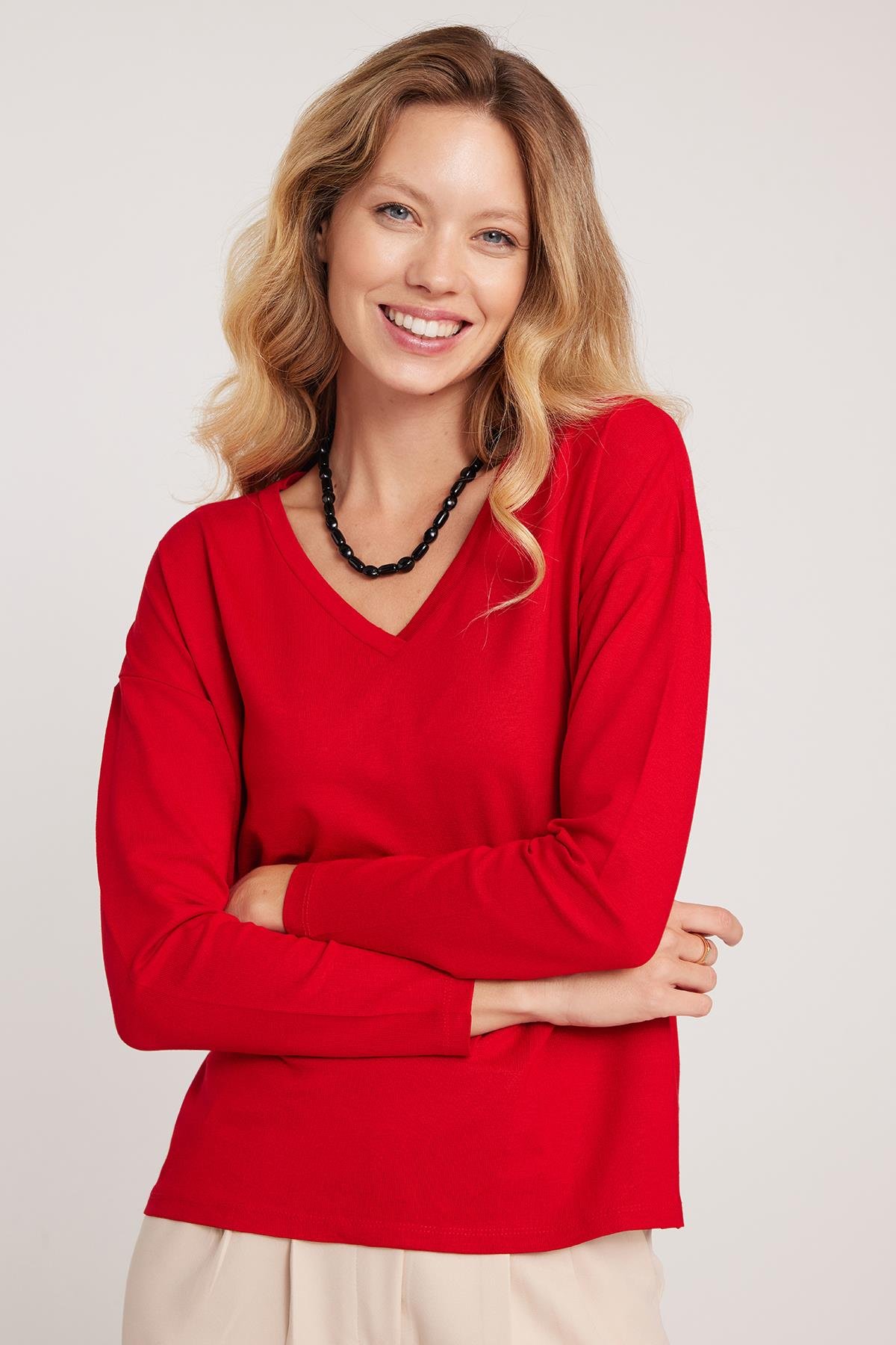 Kadın Slim Fit Dar Kesim Viskonlu Kumaş V Yaka Kırmızı Bluz