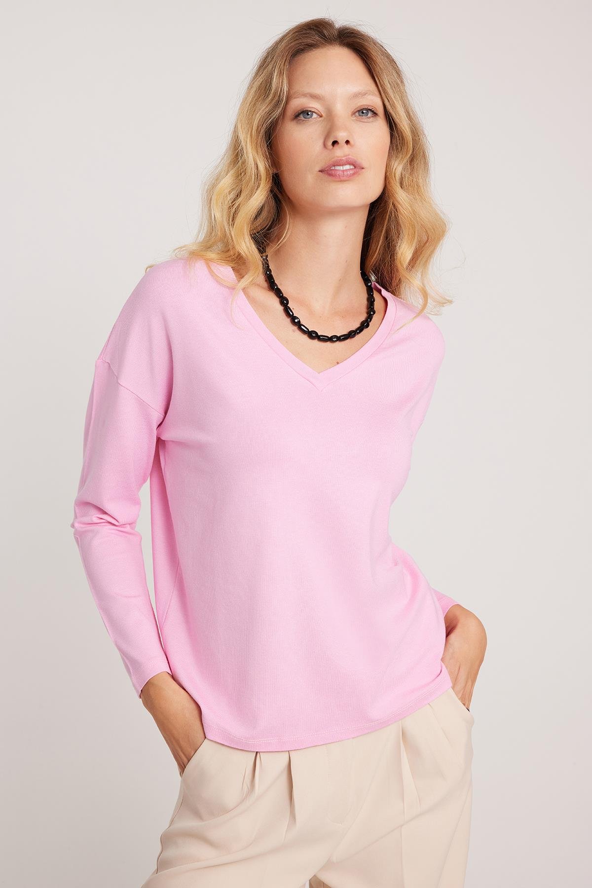 Kadın Slim Fit Dar Kesim Viskonlu Kumaş V Yaka Pembe Bluz