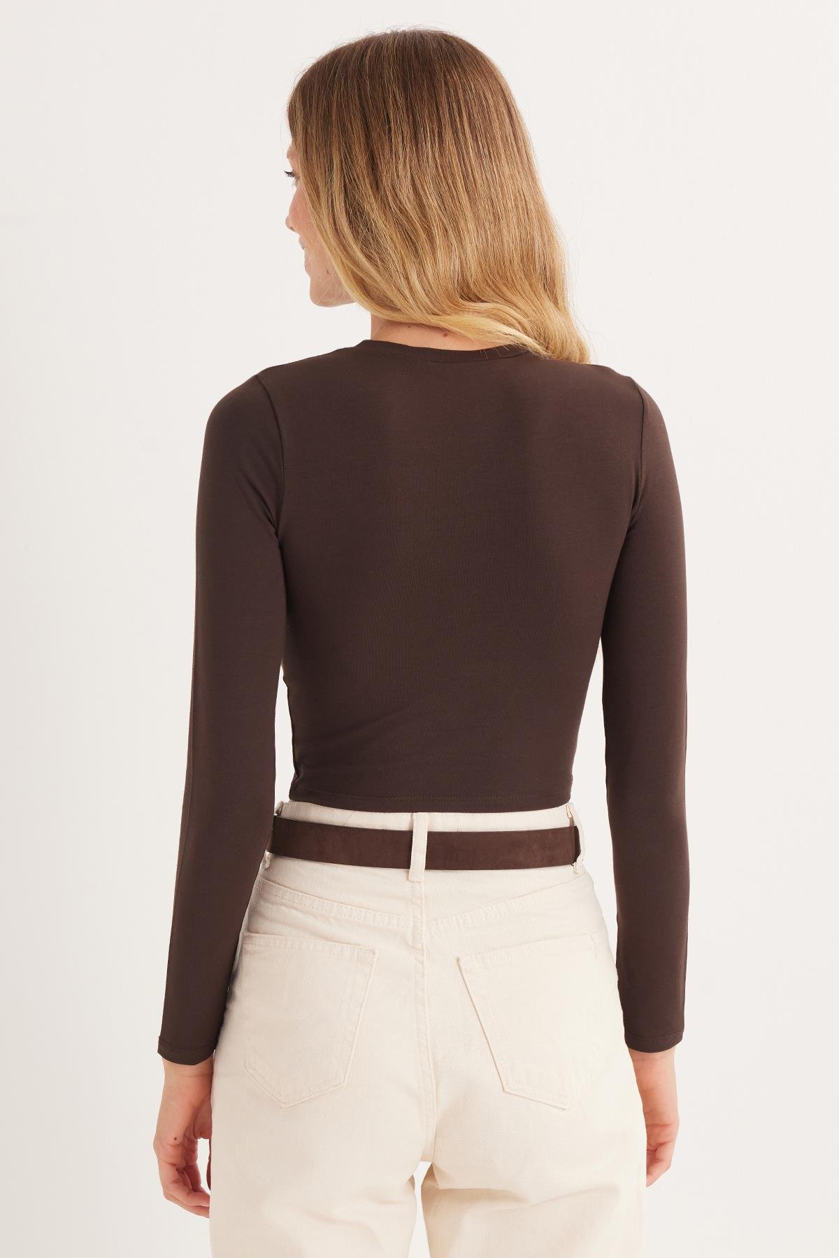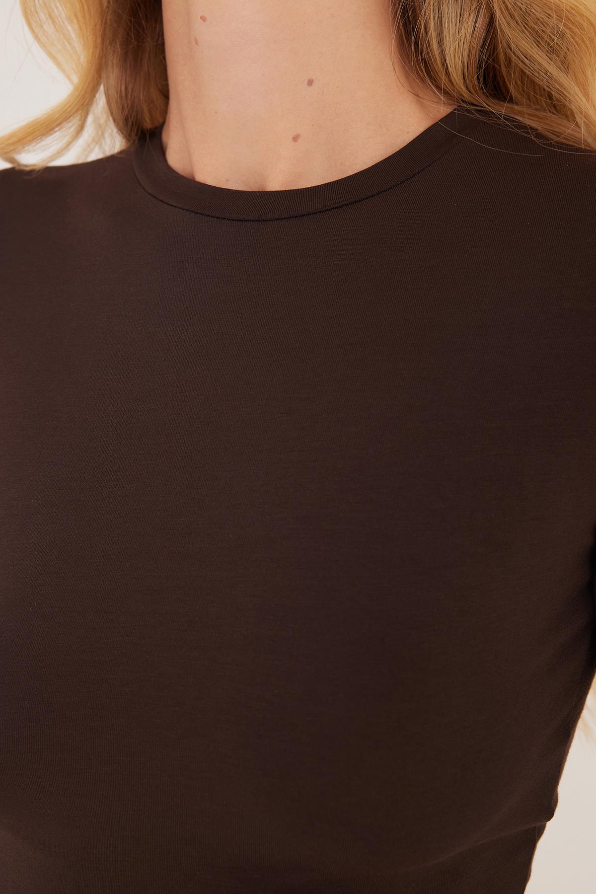 Kadın Slim Fit Pamuklu Düz Bisiklet Yaka Kahverengi Bluz (BYGM2509-07)