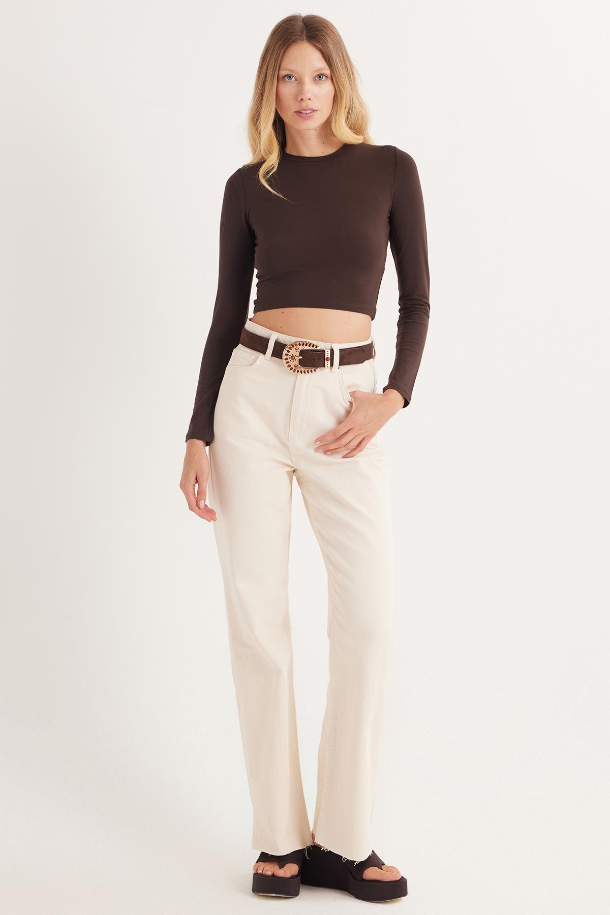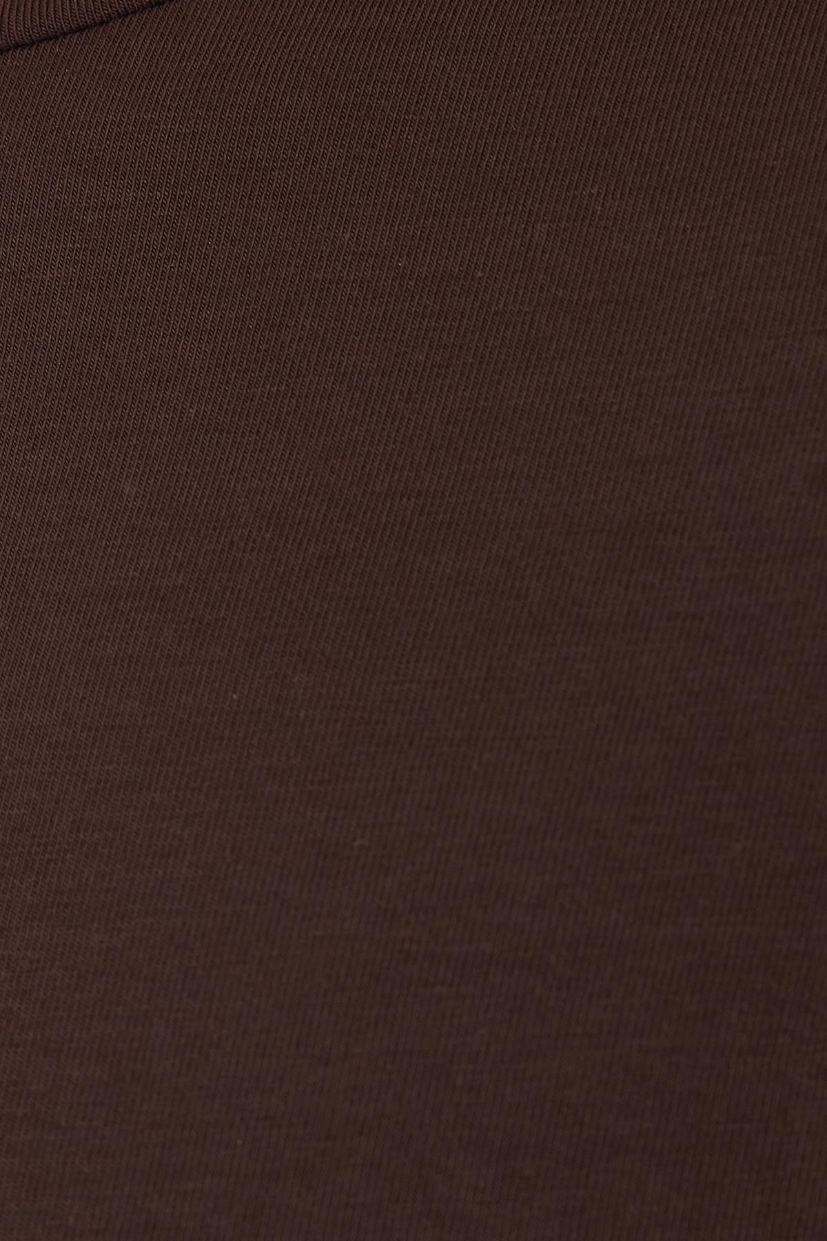 Kadın Slim Fit Pamuklu Düz Bisiklet Yaka Kahverengi Bluz