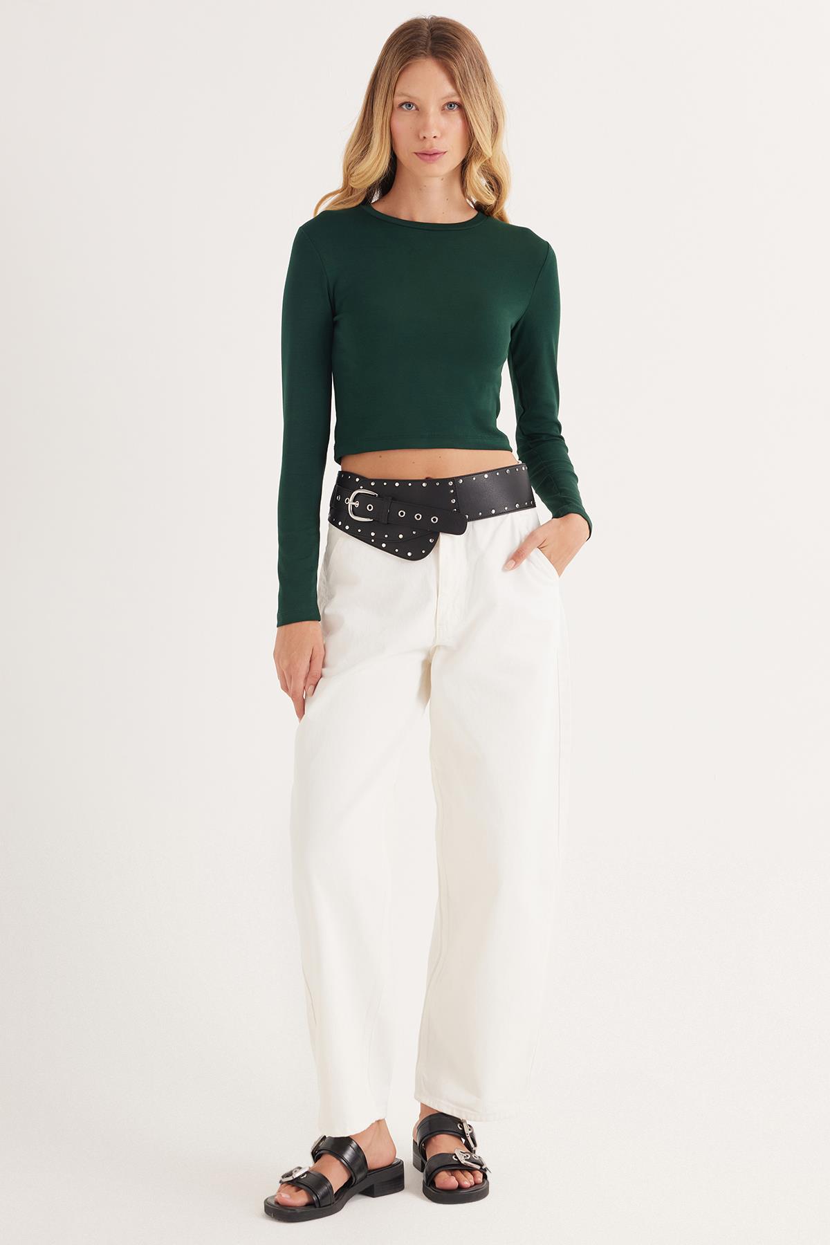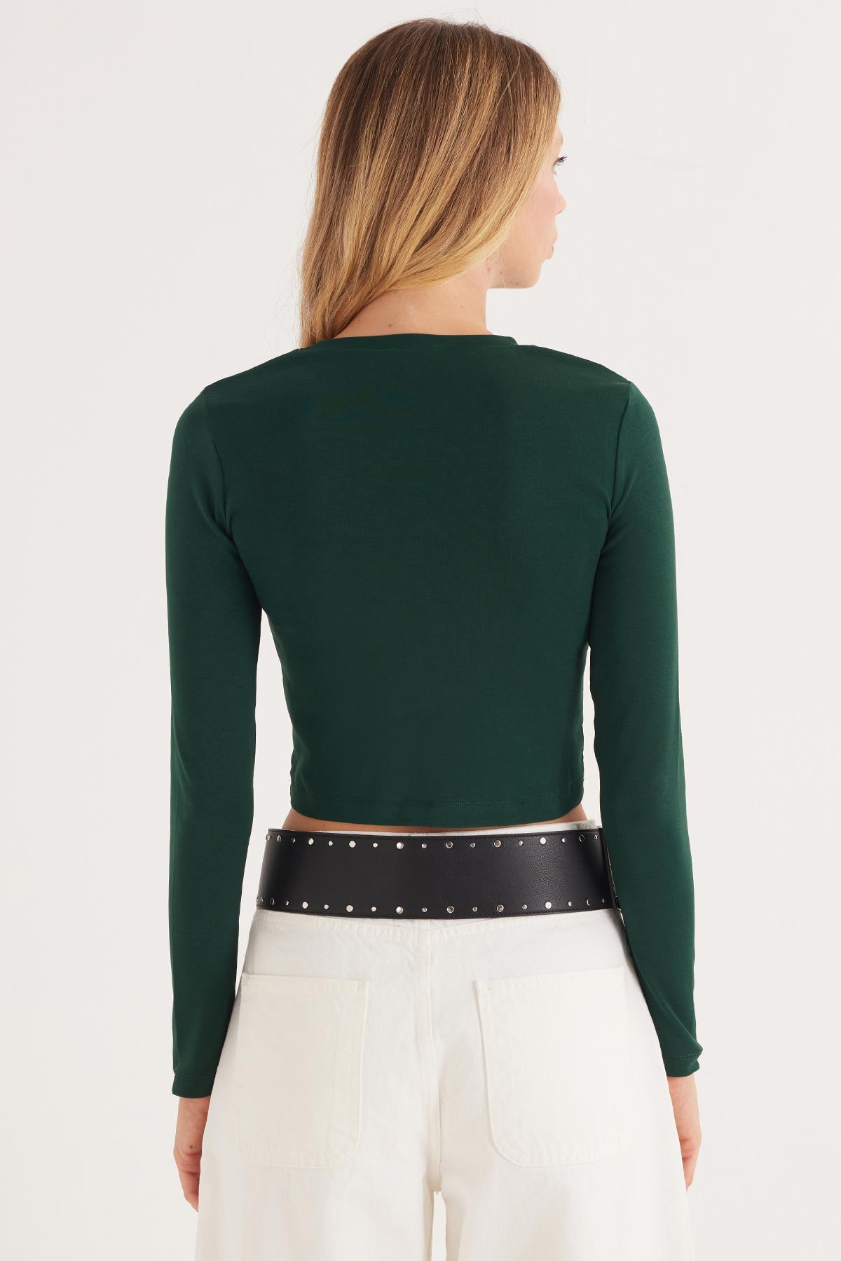 Kadın Slim Fit Pamuklu Uzun Kol Düz Bisiklet Yaka Yeşil Bluz (KDN25046-OG01)