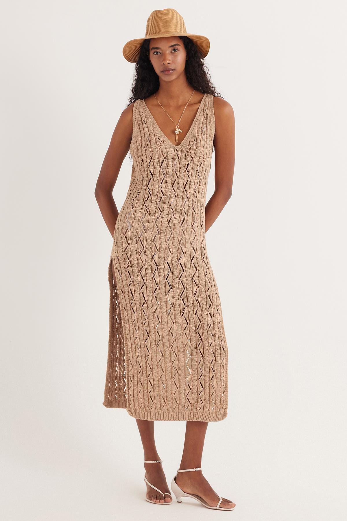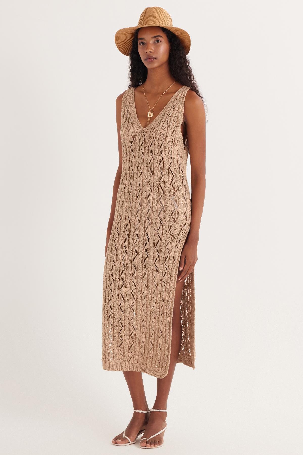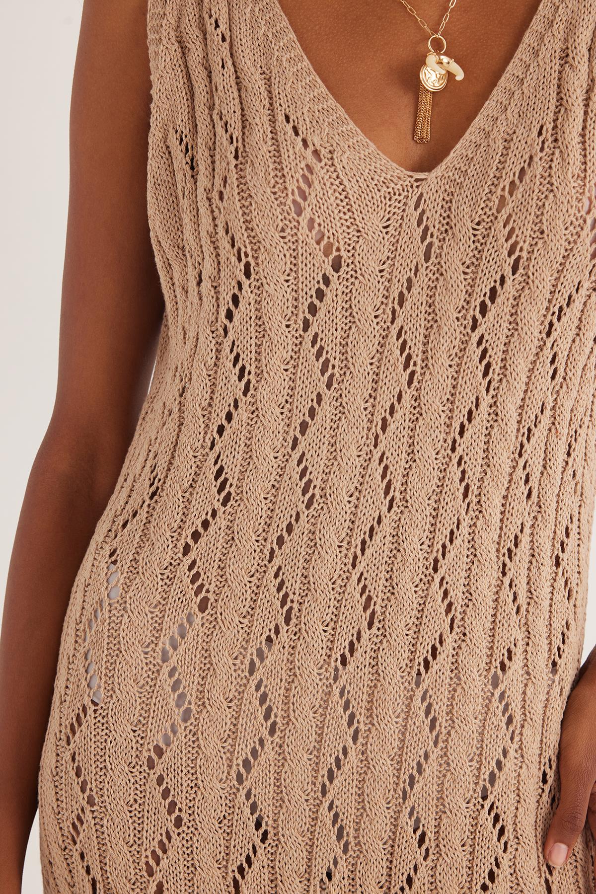 Kadın Standart Fit Akrilik Örme Desenli V Yaka Asklı Kahverengi Plaj Elbise (ELB25029-07)