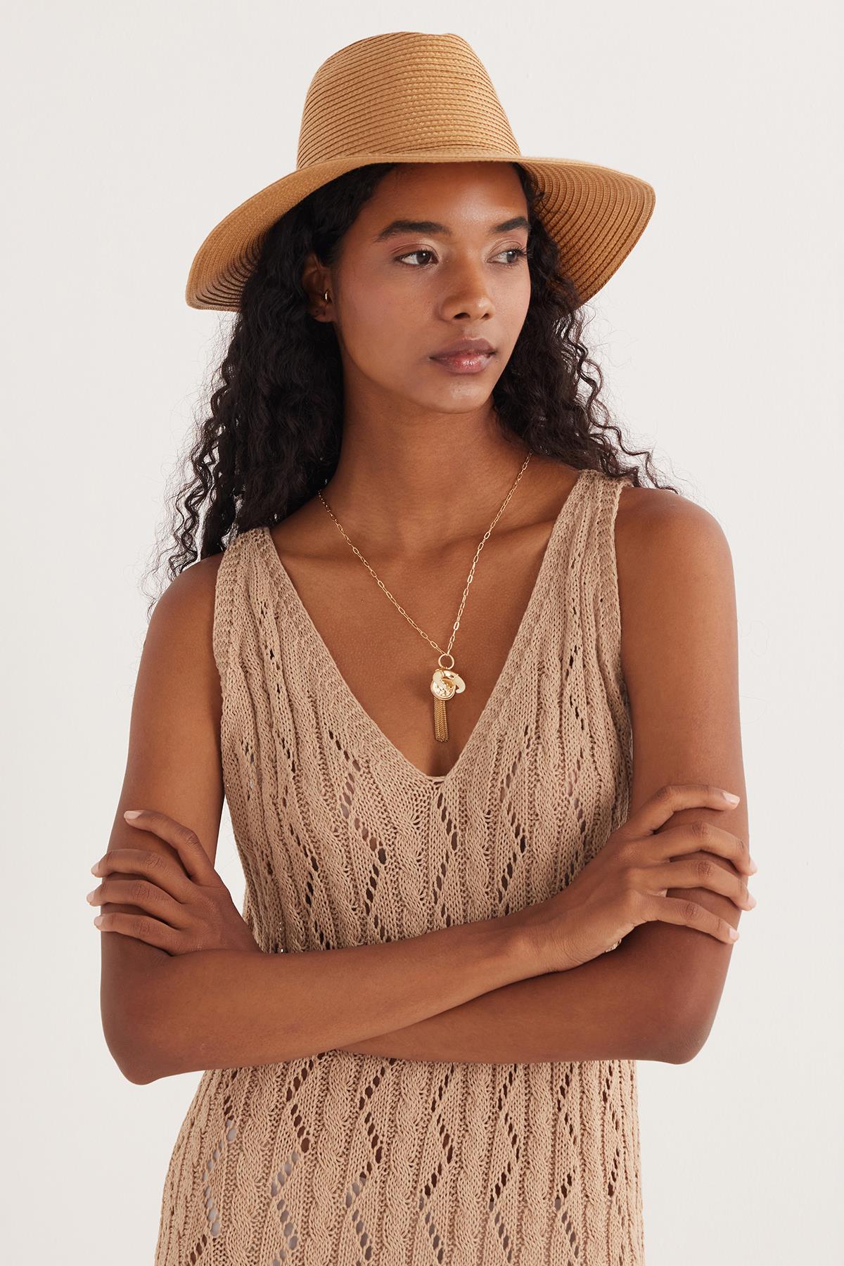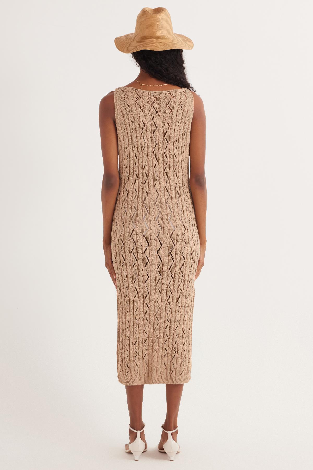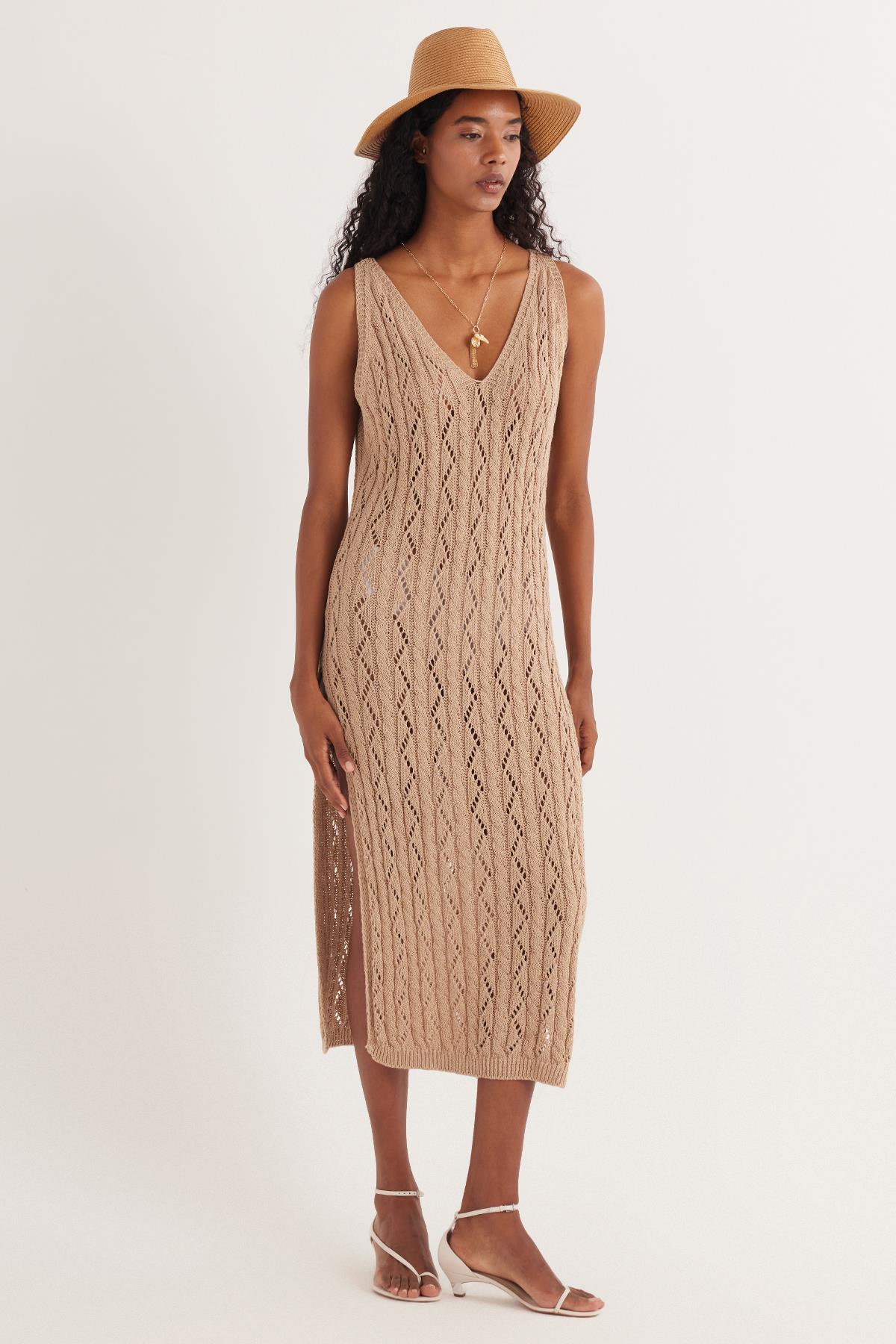 Kadın Standart Fit Akrilik Örme Desenli V Yaka Asklı Kahverengi Plaj Elbise (ELB25029-07)