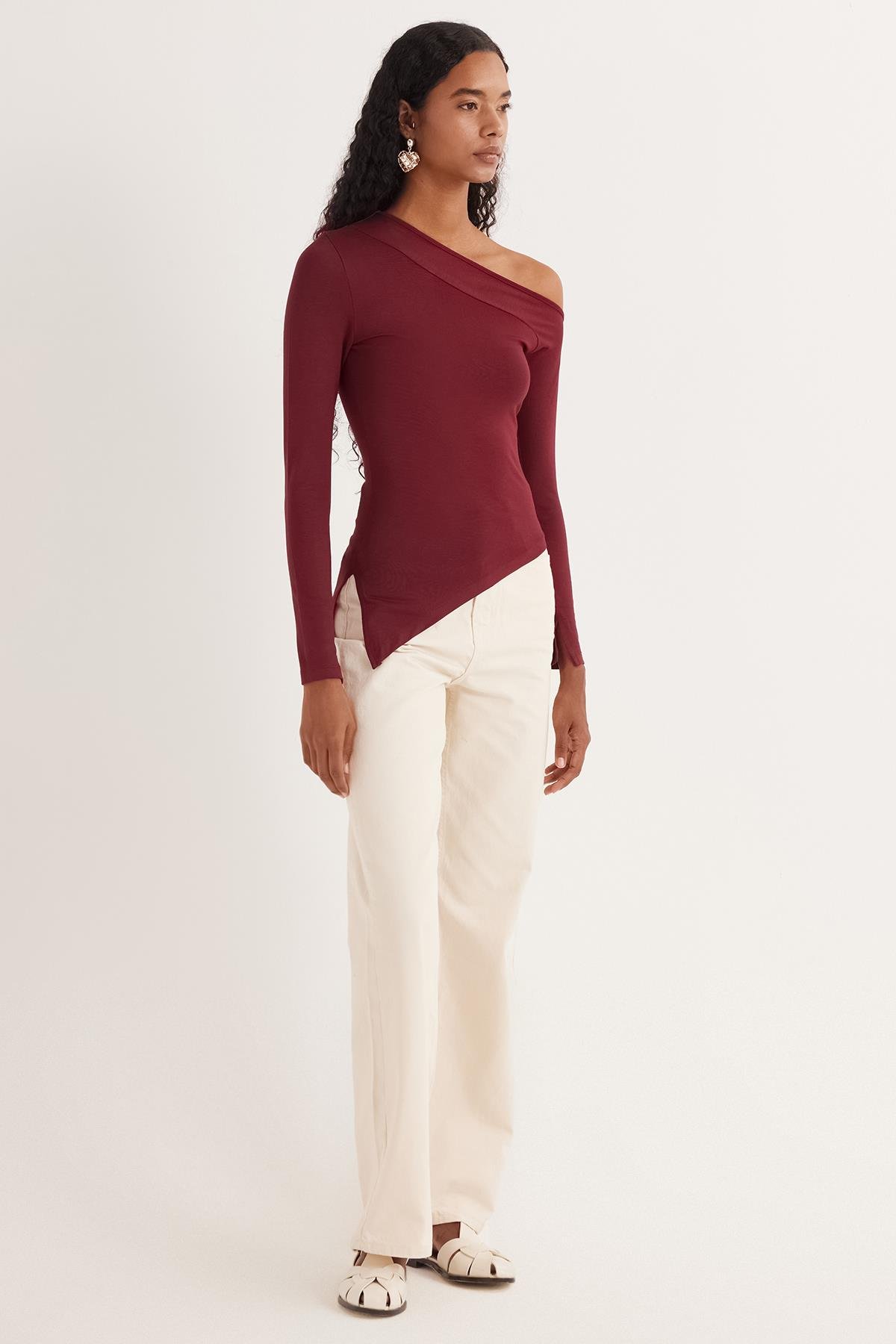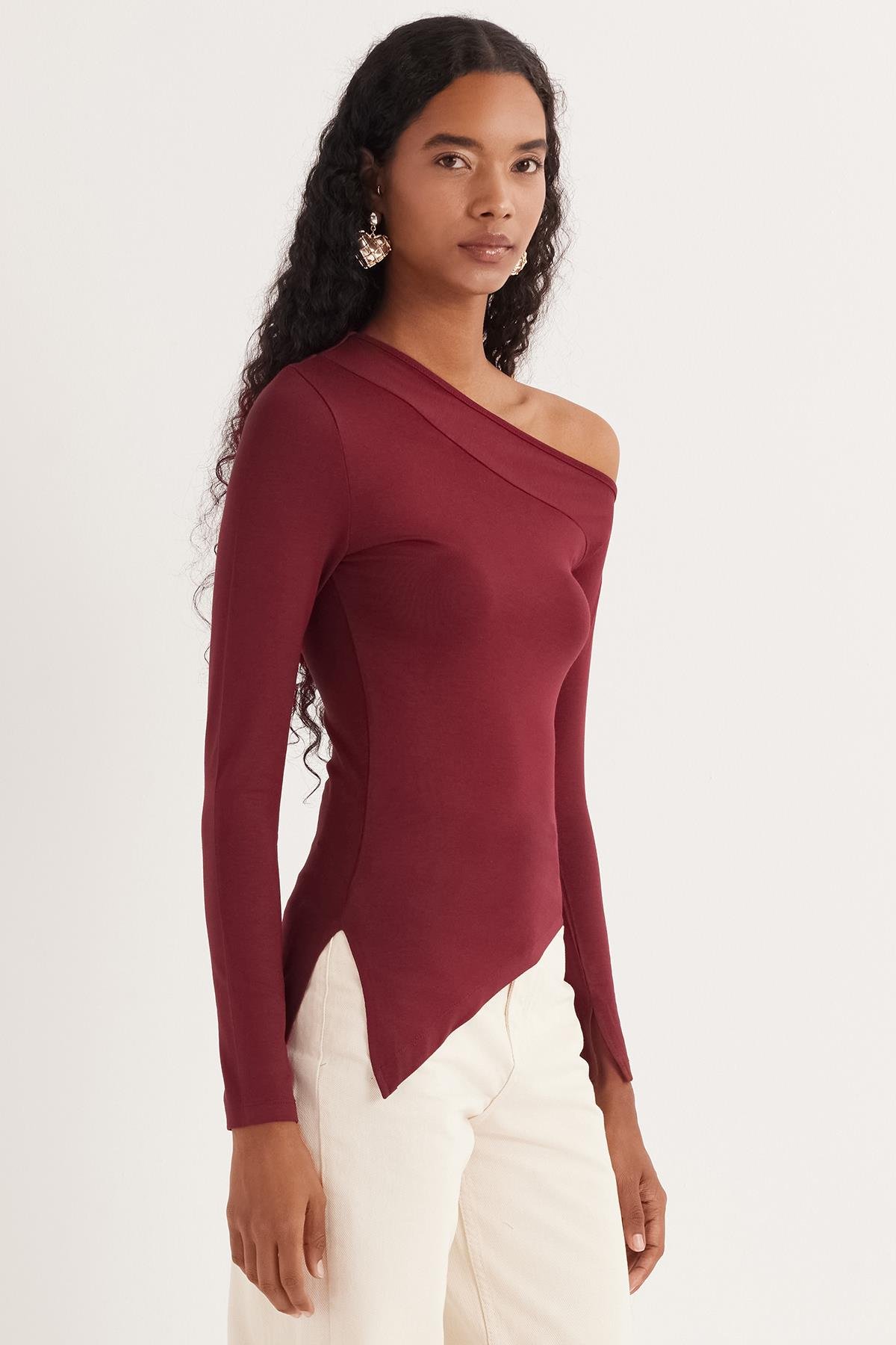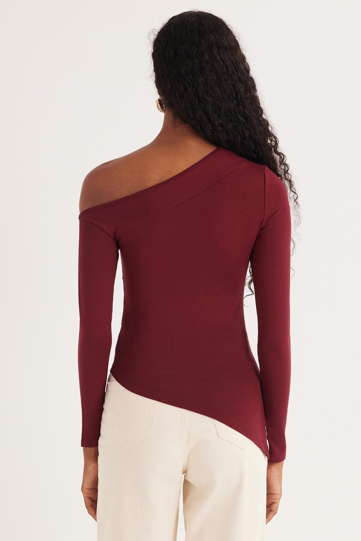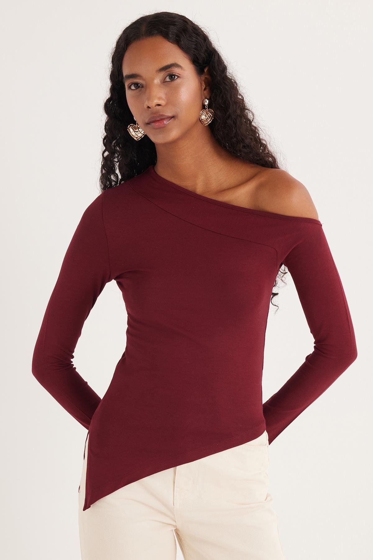 Kadın Standart Fit Asimetrik Yaka Viskon Bordo Bluz