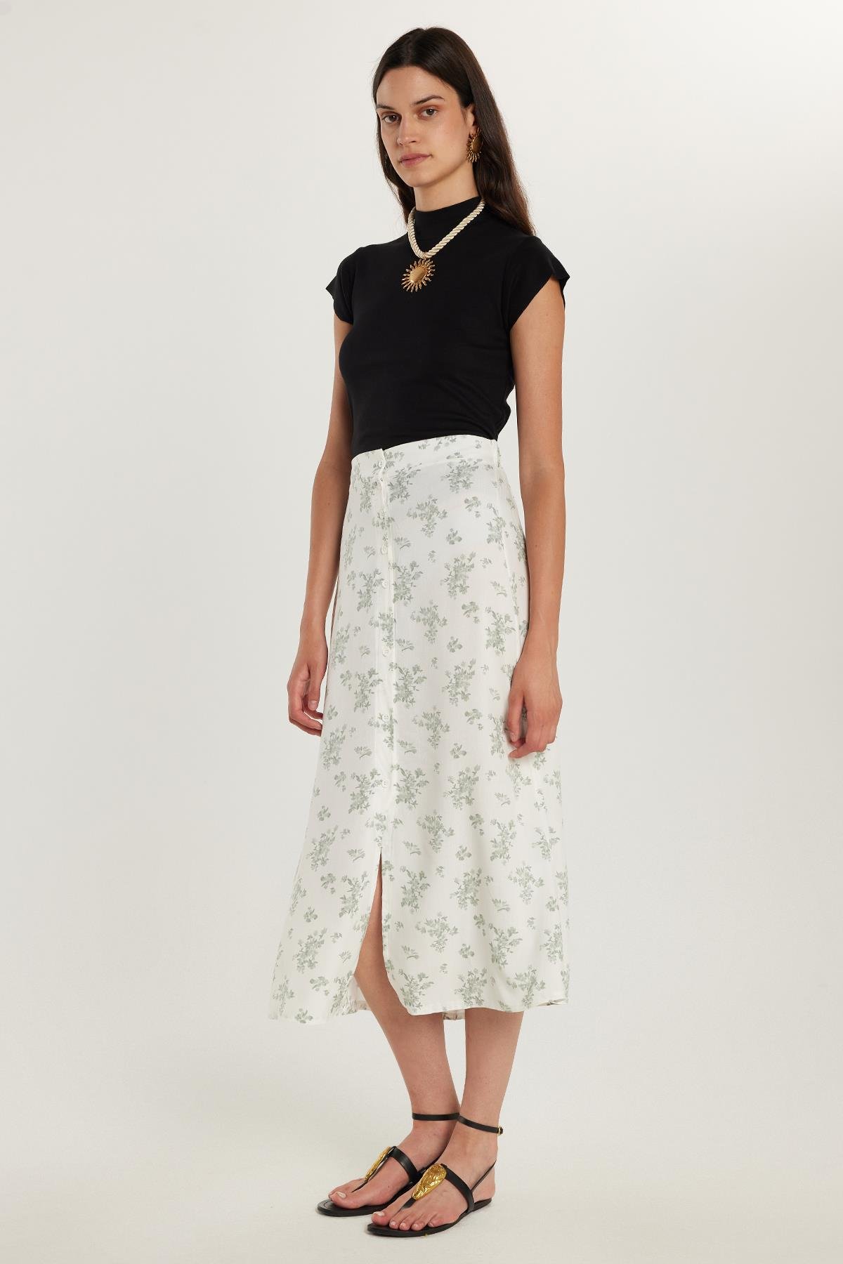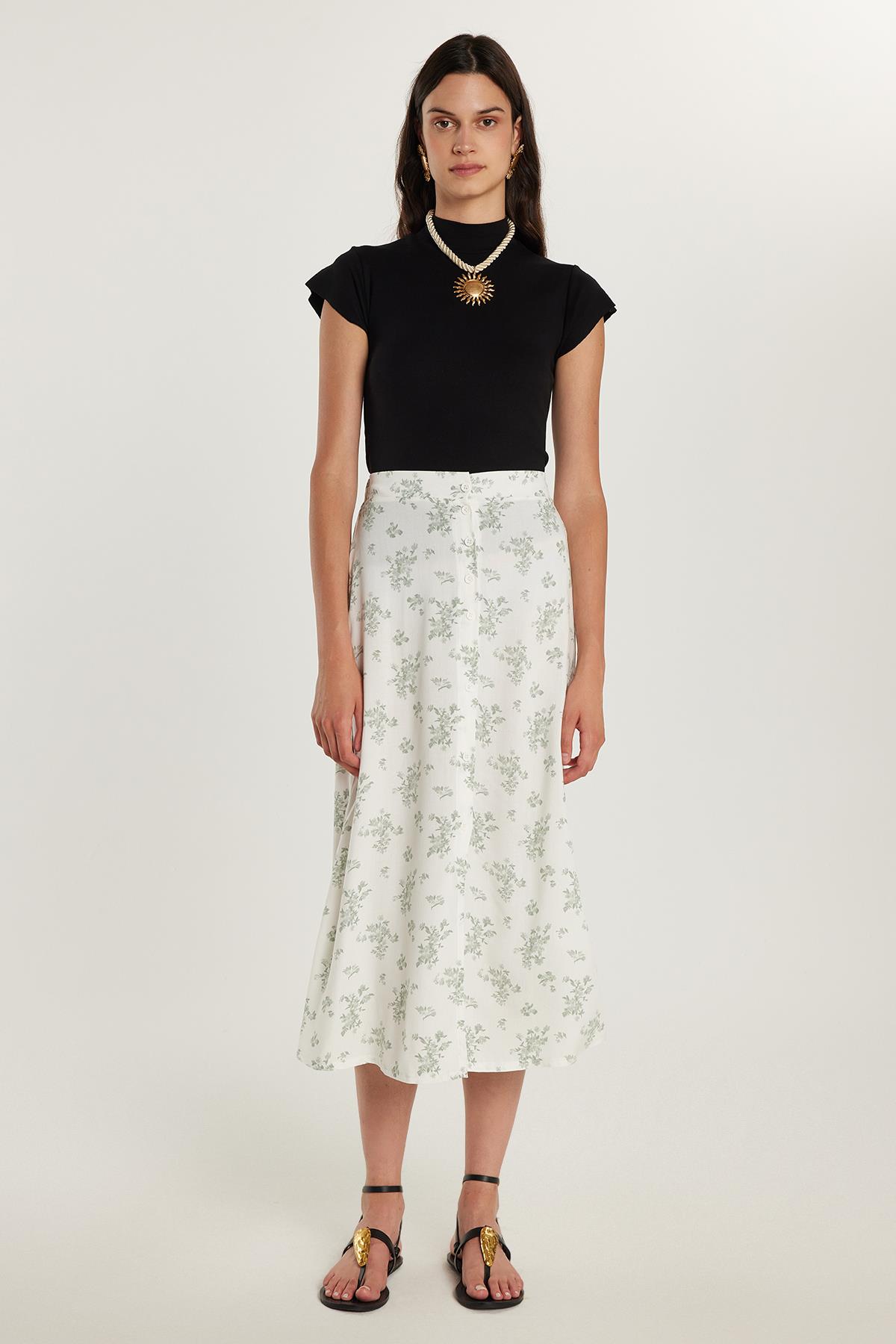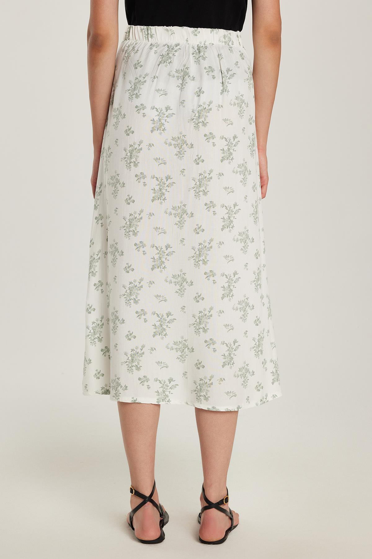 Kadın Standart Fit Düğmeli Viskon Lastikli Baskılı Midi Boy Etek (KDN25033-904)