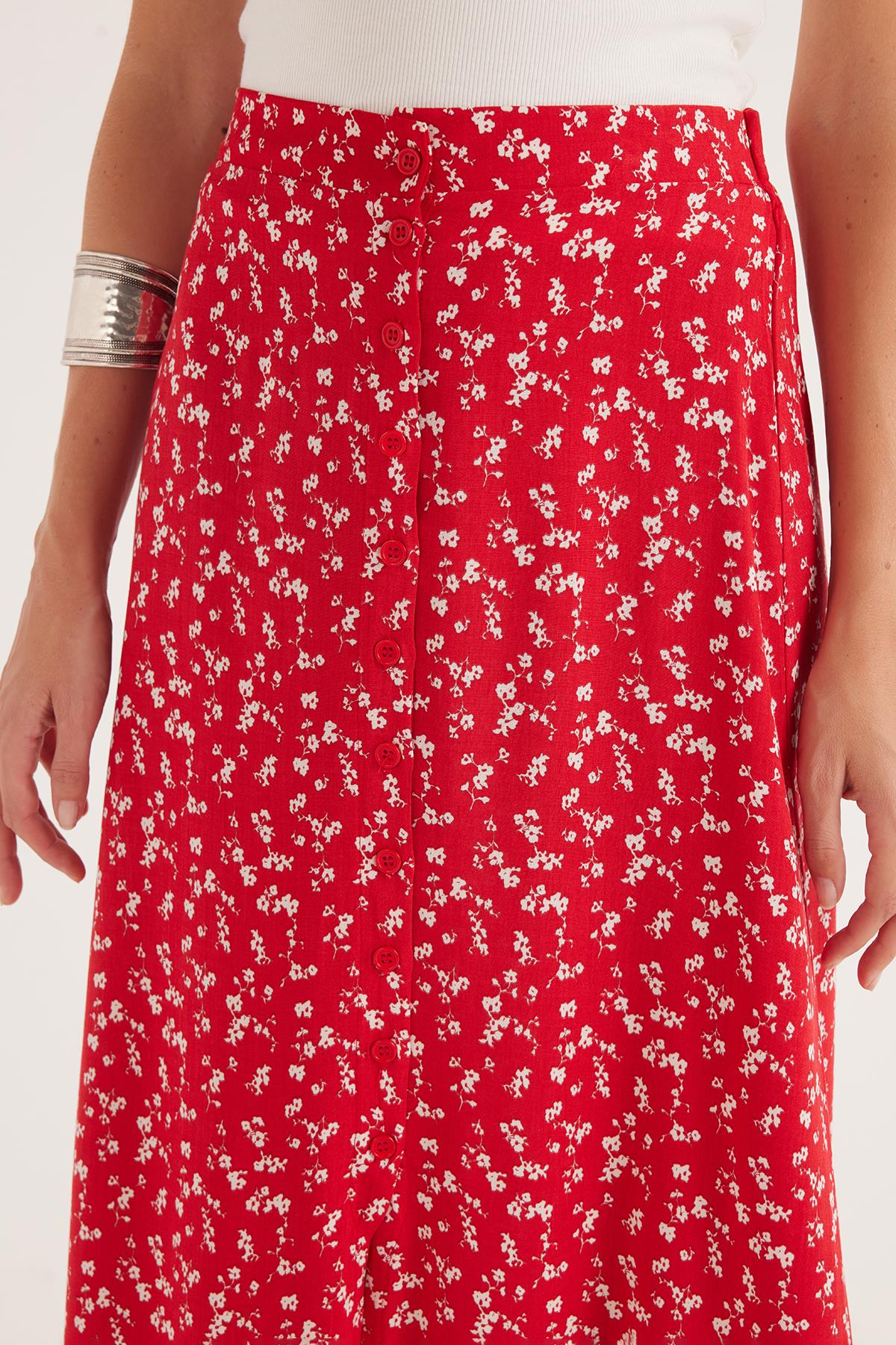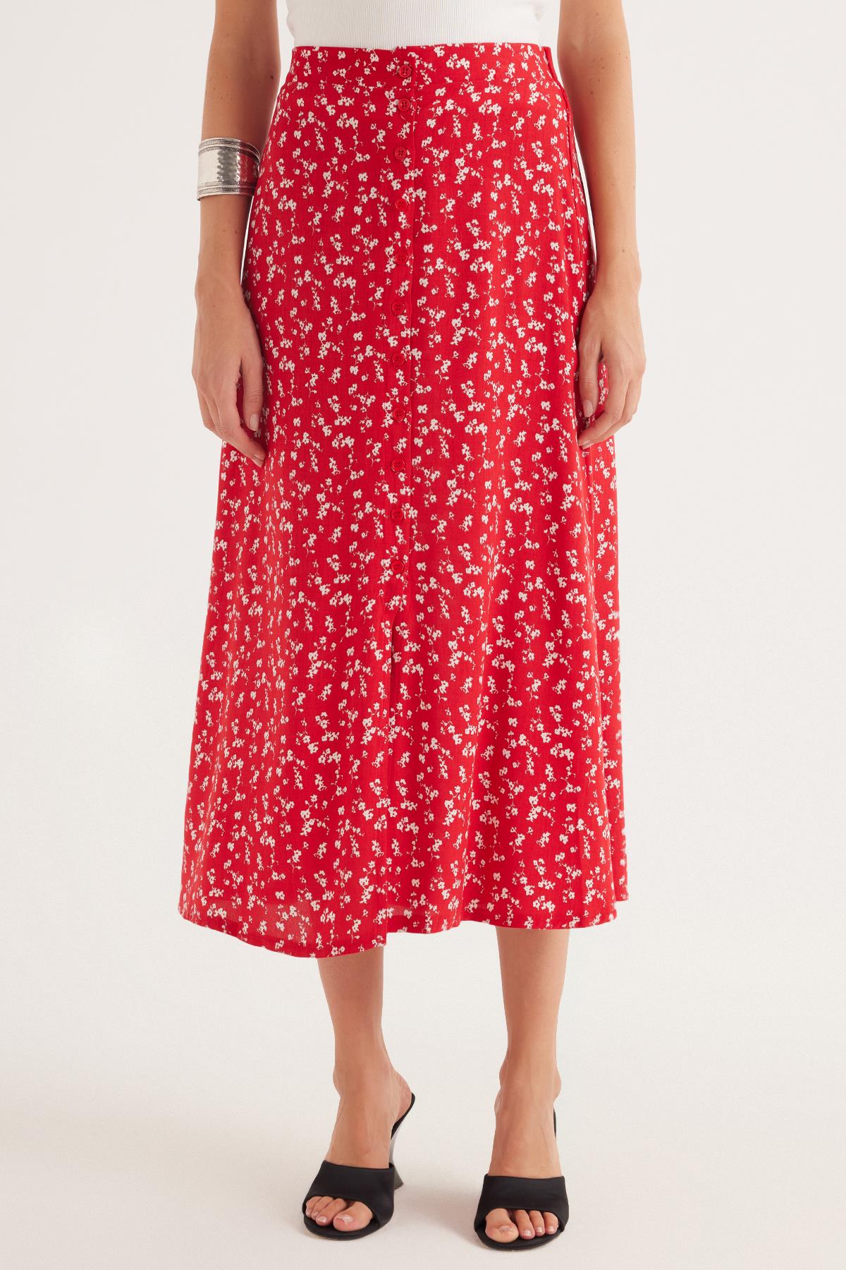 Kadın Standart Fit Düğmeli Viskon Lastikli Baskılı Midi Boy Etek