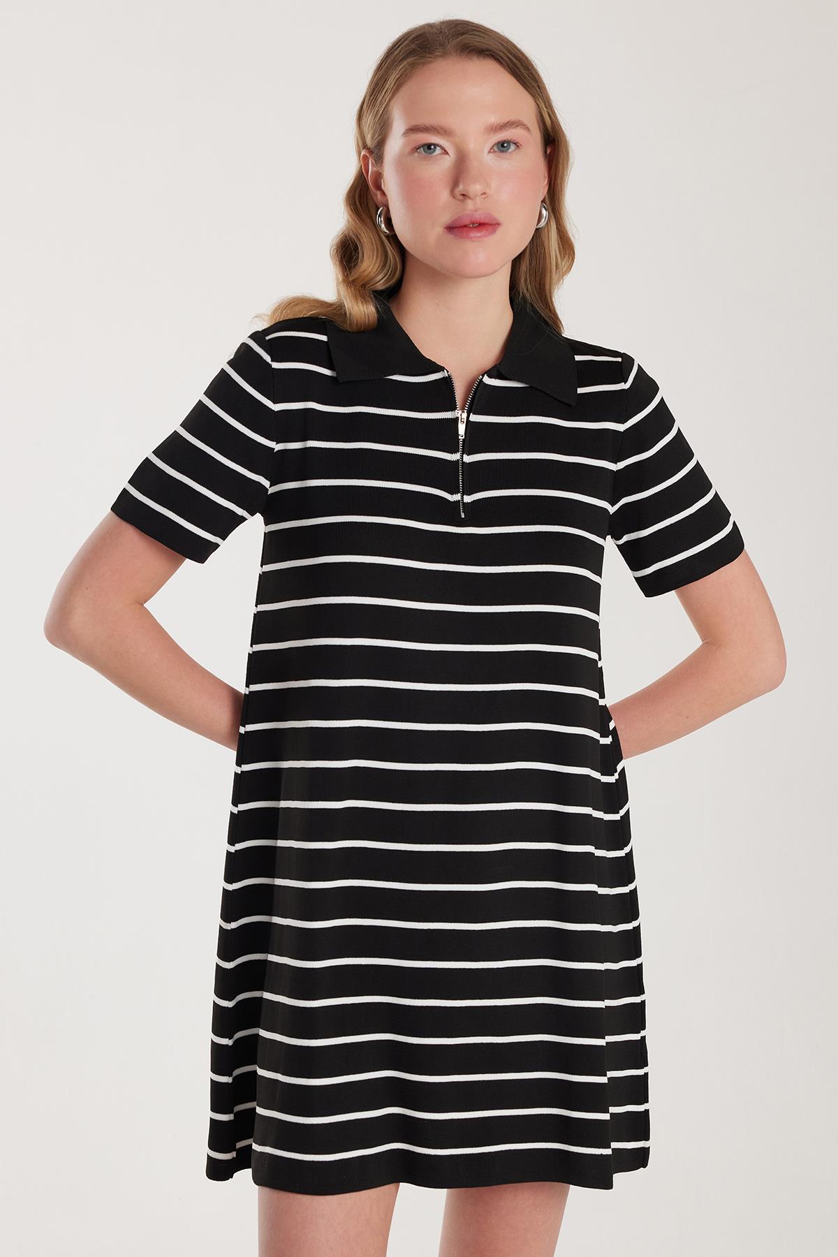 Kadın Standart Fit Kısa Kollu Fermuarlı Gömlek Yaka Çizgili Siyah Elbise (ELB25044-02)