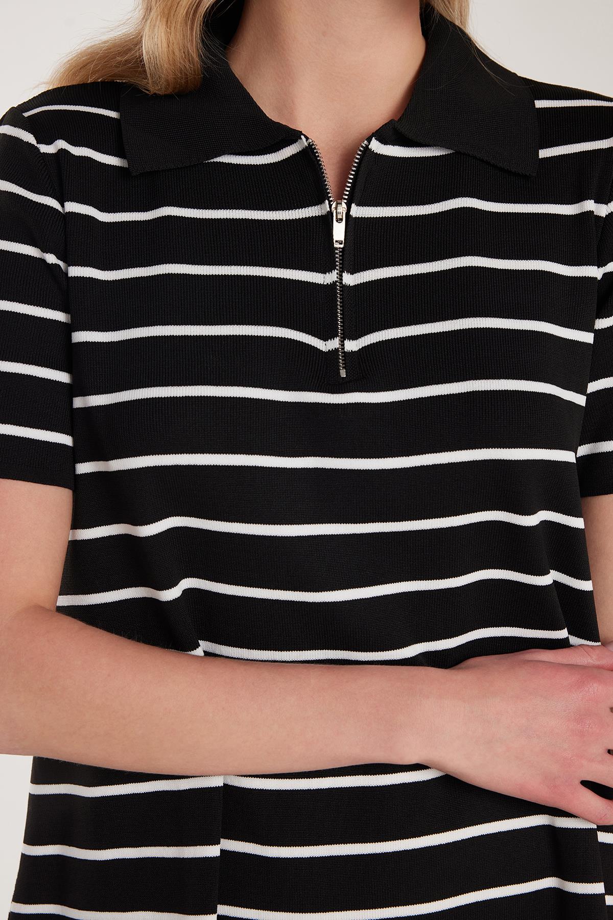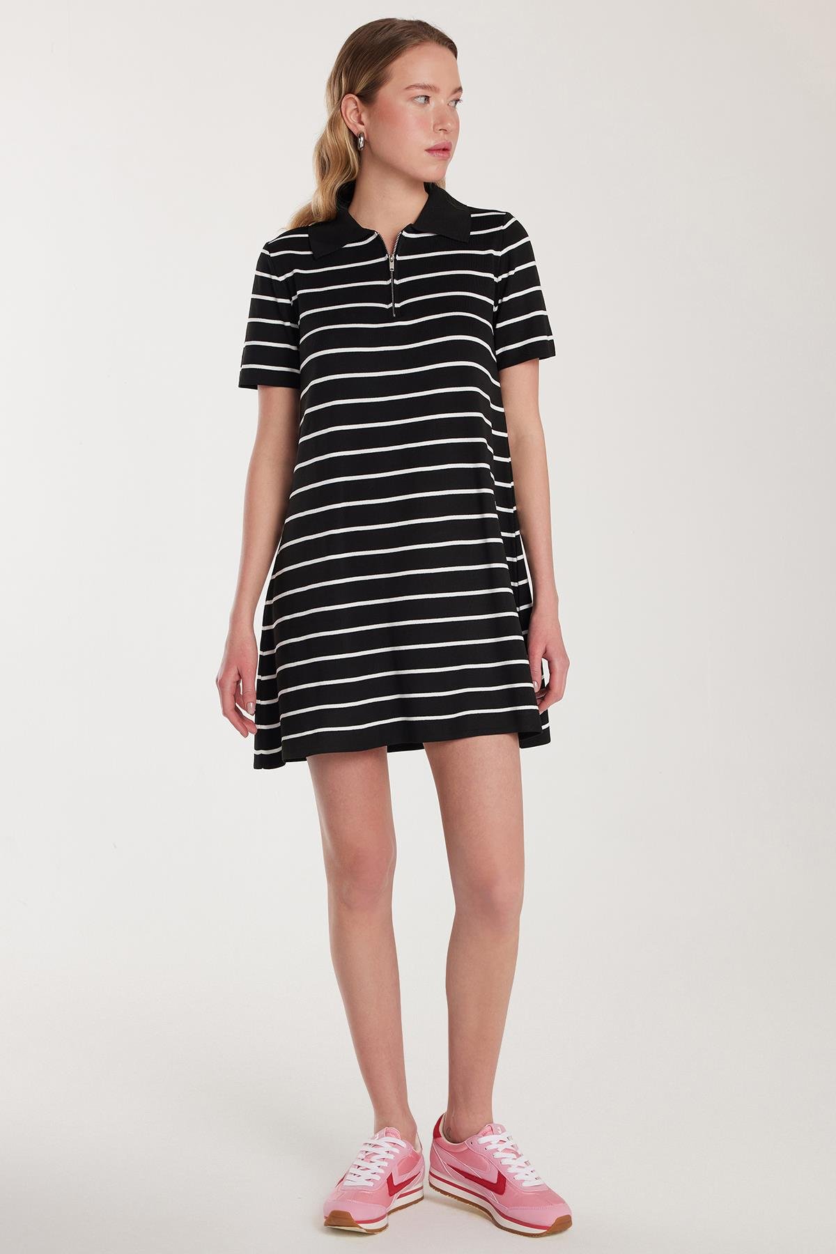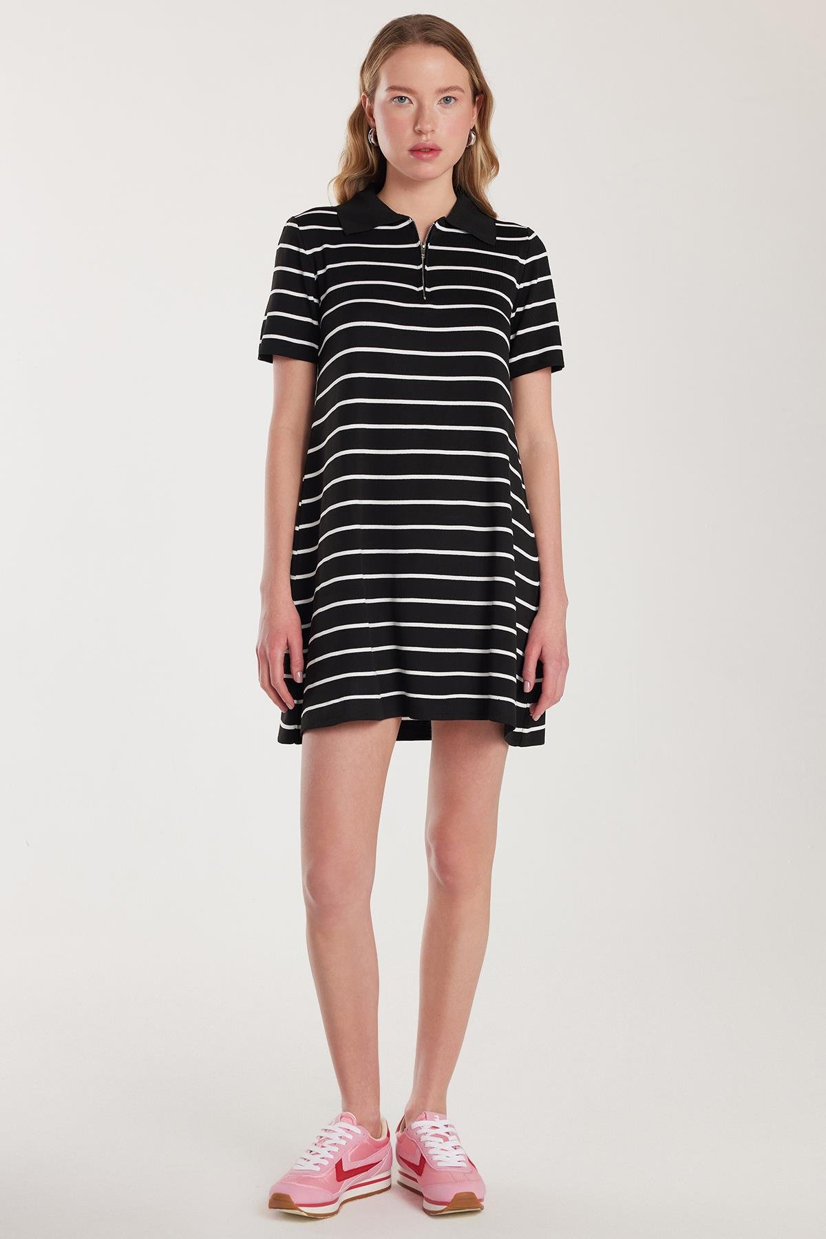 Kadın Standart Fit Kısa Kollu Fermuarlı Gömlek Yaka Çizgili Siyah Elbise