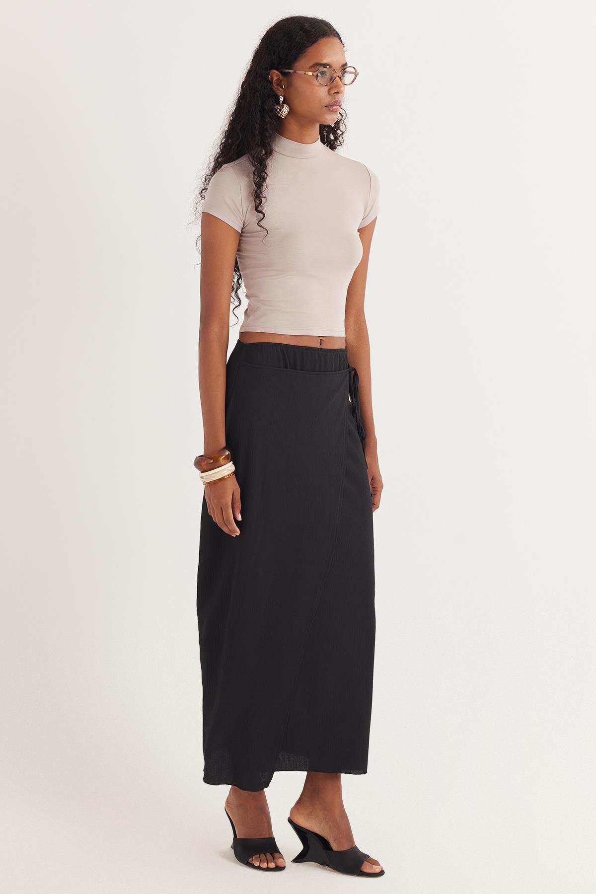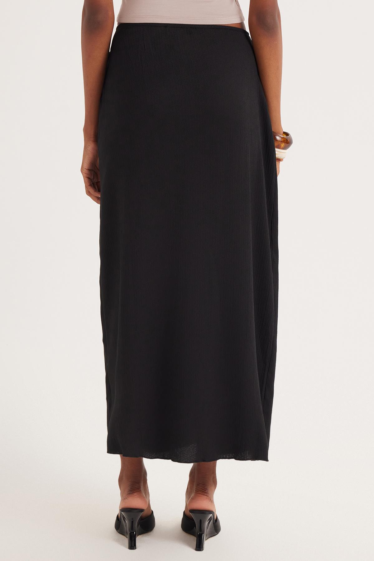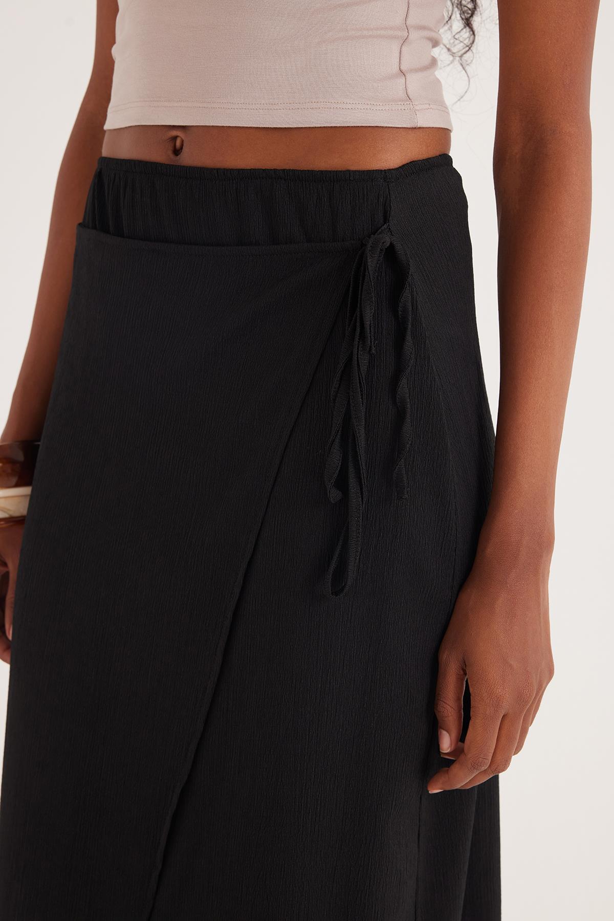 Kadın Standart Fit Normal Kesim Bağcık Detaylı Siyah Midi Etek (KDN25039-02)