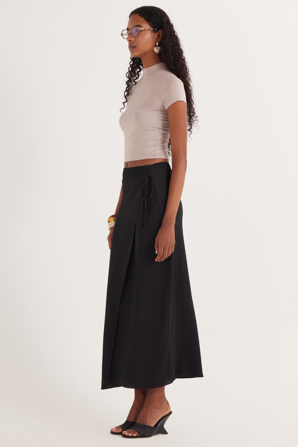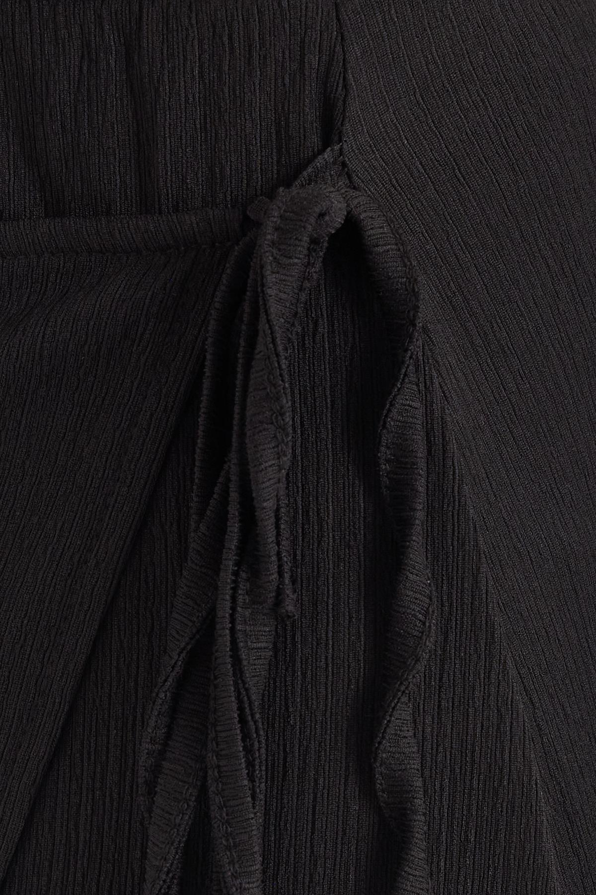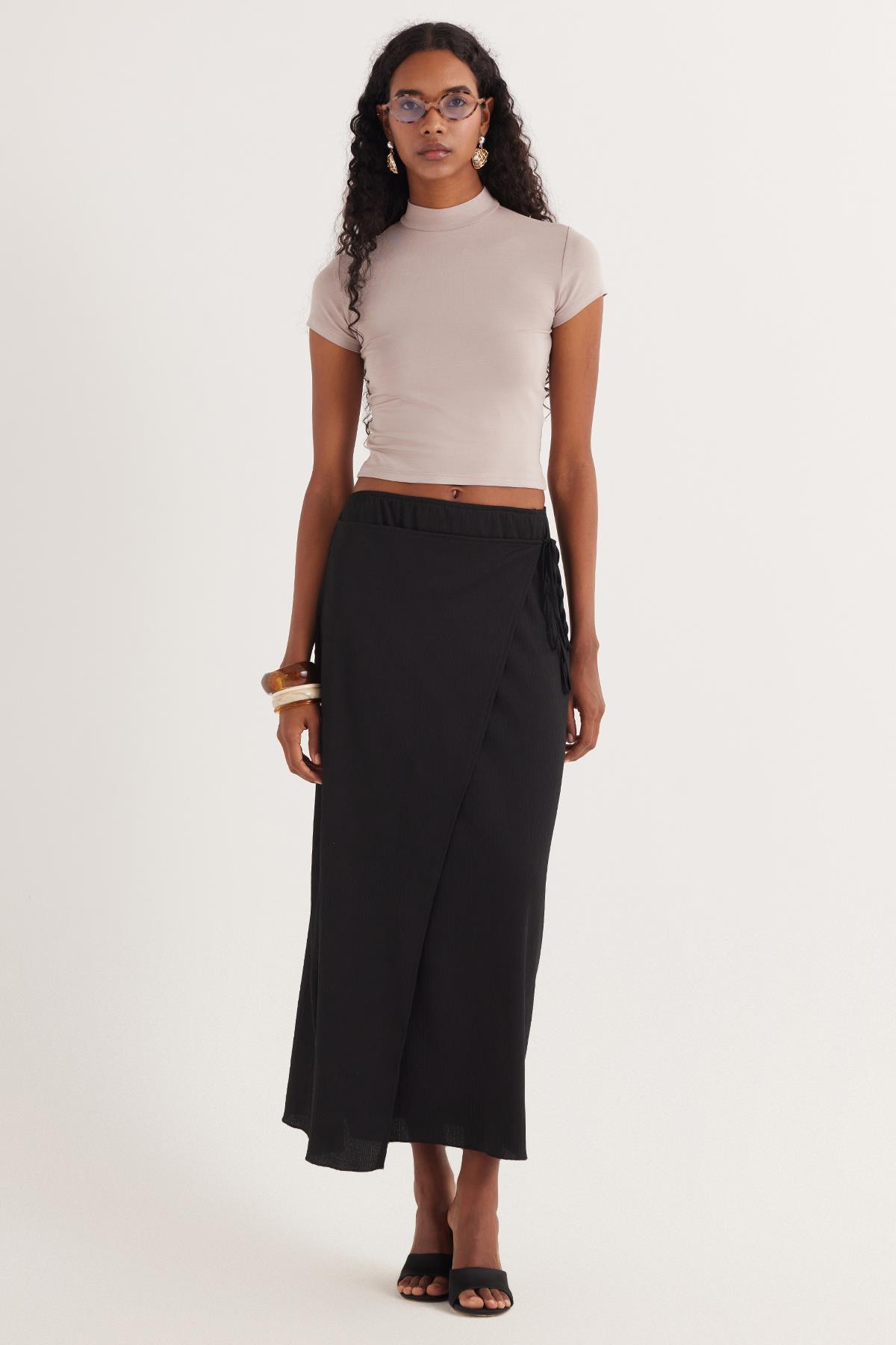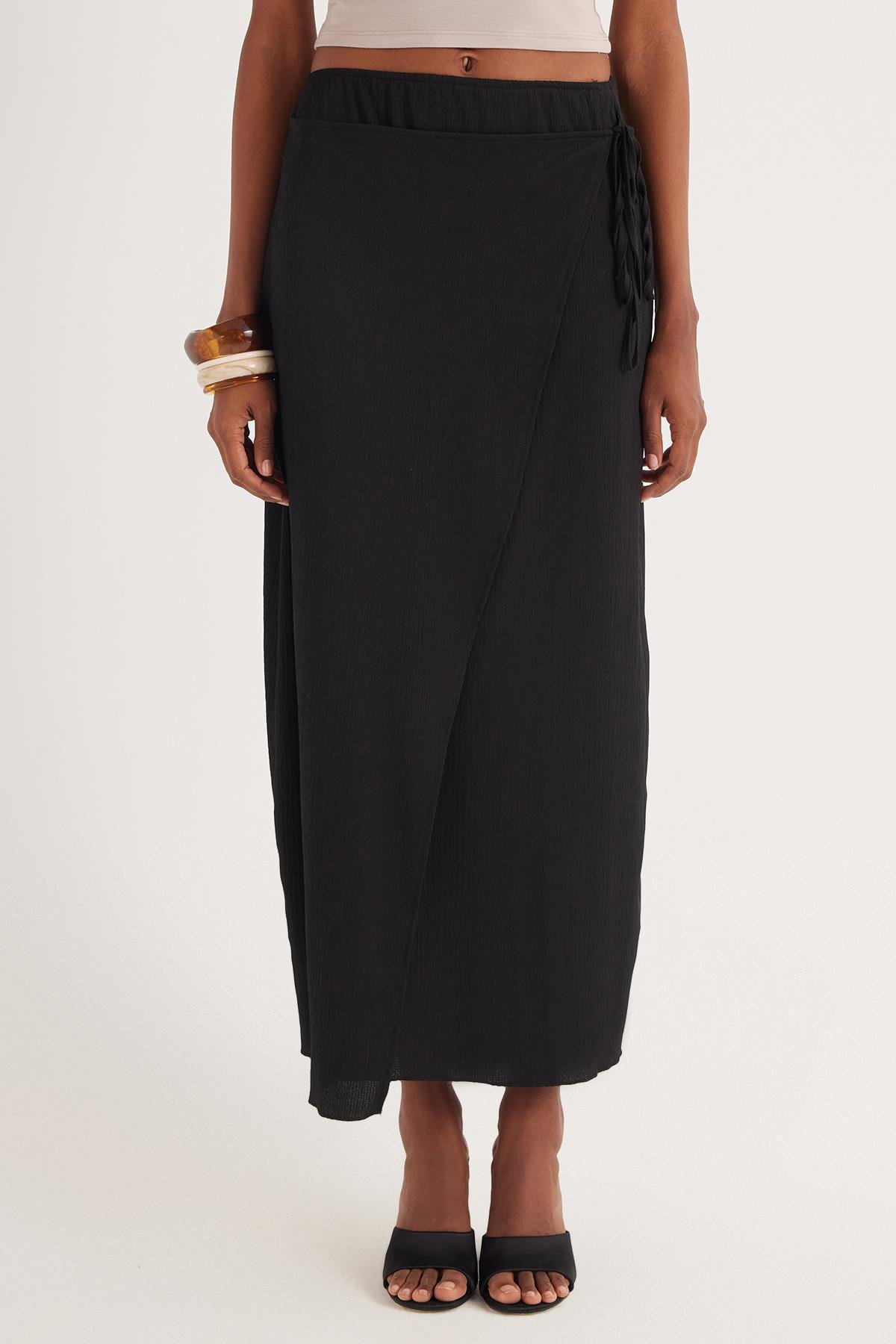Kadın Standart Fit Normal Kesim Bağcık Detaylı Siyah Midi Etek (KDN25039-02)